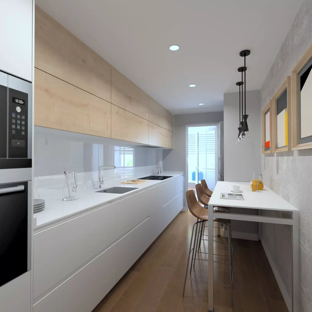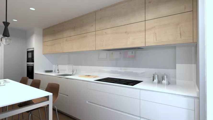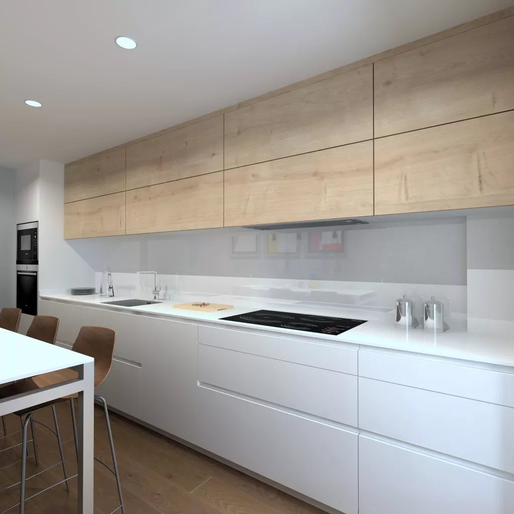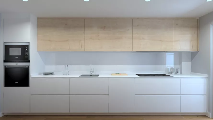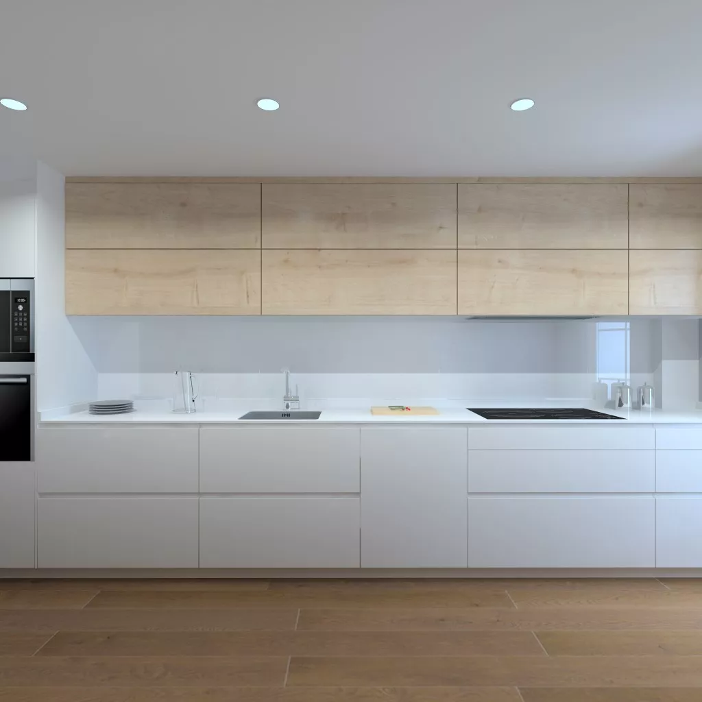 Los materiales en madera revindican la belleza de lo imperfecto, aportando calidez y contraste en tu cocina. La combinación del Laminado Roble Rústico con el Estratificado Blanco Innsbruk de Santos configura una estética envidiable en esta cocina lineal inundada de luz natural. A modo de barra se establece enfrente, una pequeña mesa con taburetes en madera oscura que incorporan naturalidad y estilo en este pequeño pero acogedor ambiente. Este último elemento ahorra espacio por su estrechez y te permitirá compartir momentos maravillosos en familia. Piensa en tu cocina como un ambiente que une a los miembros de tu vivienda y que realmente tiene un espíritu propio. Los materiales de Cocinas Santos son: LINE ESTRATIFICADO BLANCO INNSBRUK LINE LAMINADO ROBLE RÚSTICO ENCIMERA DALIAN BLANCO GLACIAR