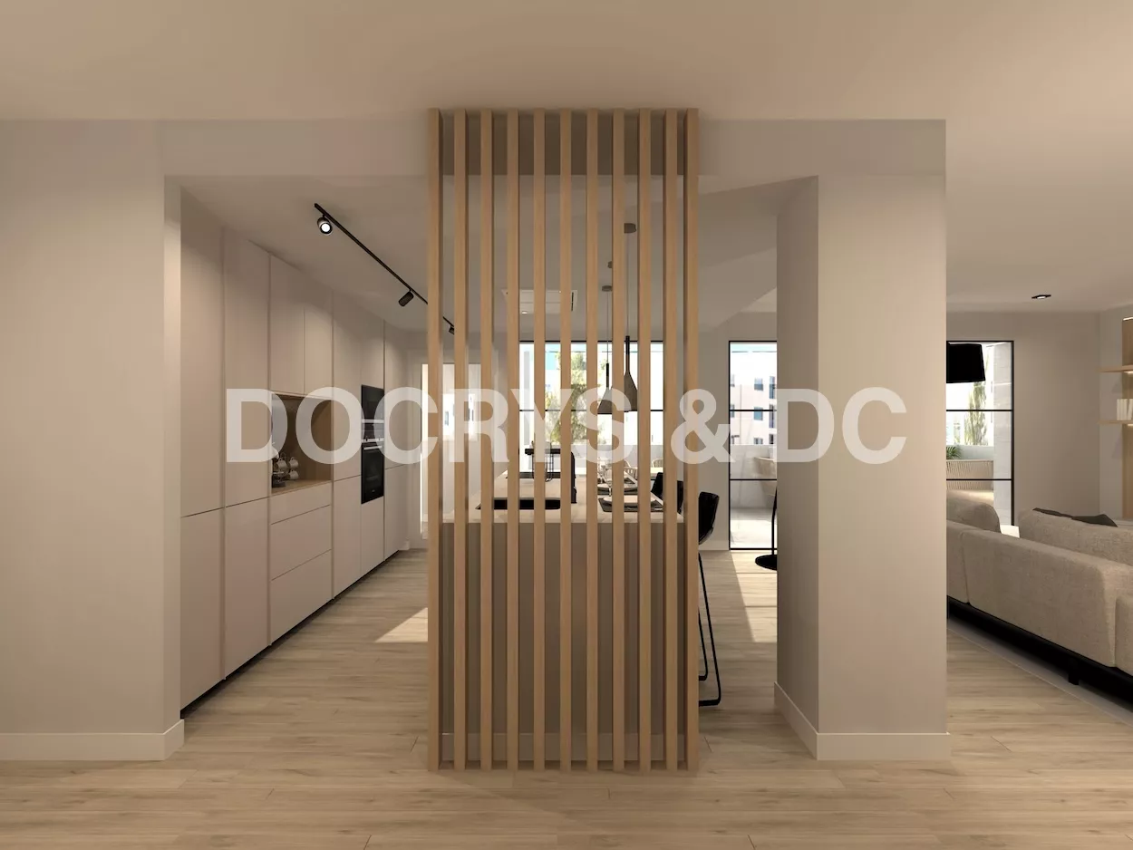 Además, la cocina está equipada con una hornacina incluida en las columnas, proporcionando un almacenamiento práctico y elegante. Los muebles llegan hasta el techo, maximizando el espacio de almacenamiento y manteniendo una estética limpia y organizada.