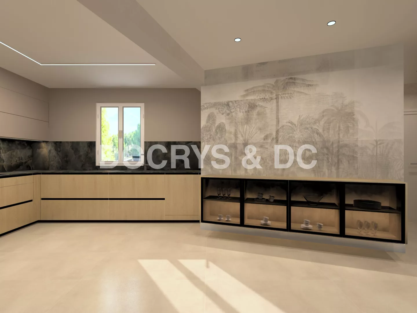Un detalle destacado lo encontramos en la pared lateral decorada con mural de inspiración natural, que aporta personalidad y carácter sin perder la armonía del espacio. Además, los módulos con vitrinas en cristal oscuro iluminadas desde el interior permiten exhibir vajilla y piezas especiales, añadiendo un toque decorativo y funcional.