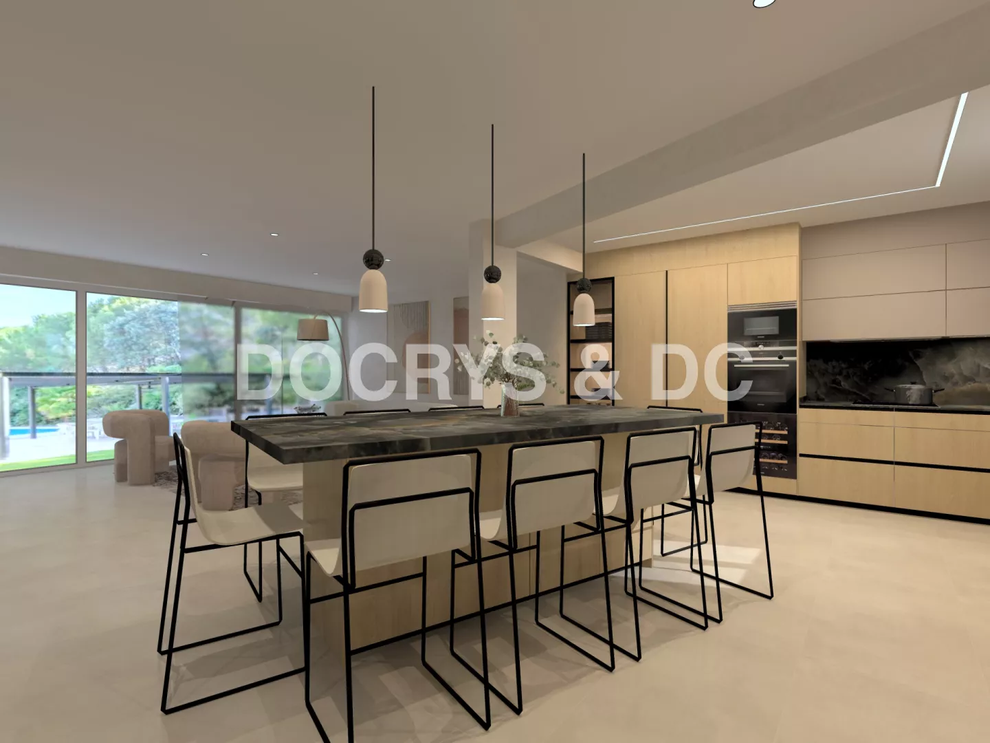 La iluminación se resuelve mediante líneas de luz empotradas en el techo, focos puntuales y lámparas colgantes sobre la isla, creando diferentes escenas y atmósferas según el uso de la estancia. La gran cristalera con acceso al jardín baña de luz natural todo el espacio, reforzando la sensación de amplitud y conexión con el exterior.