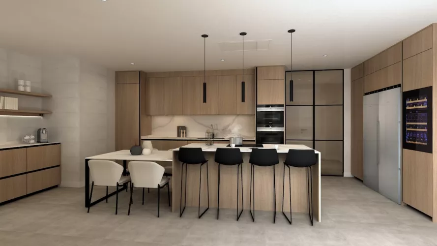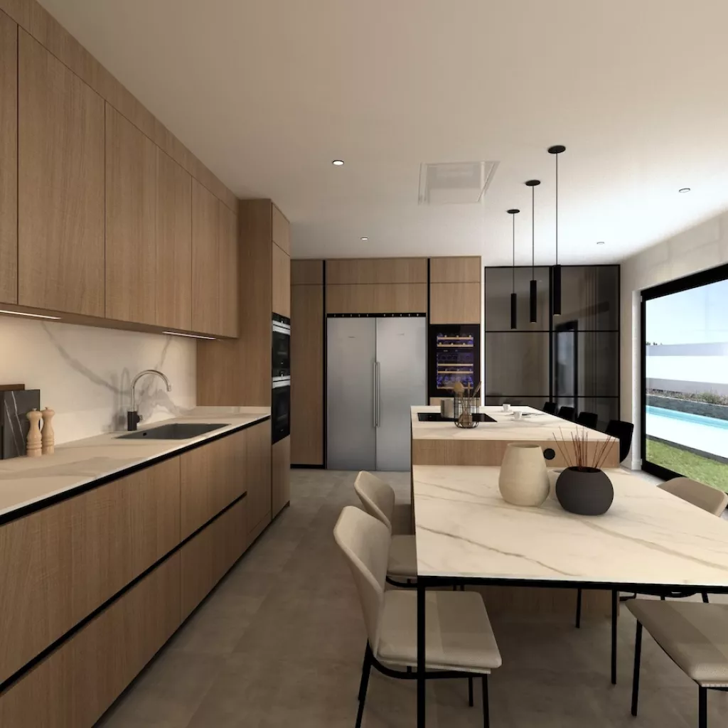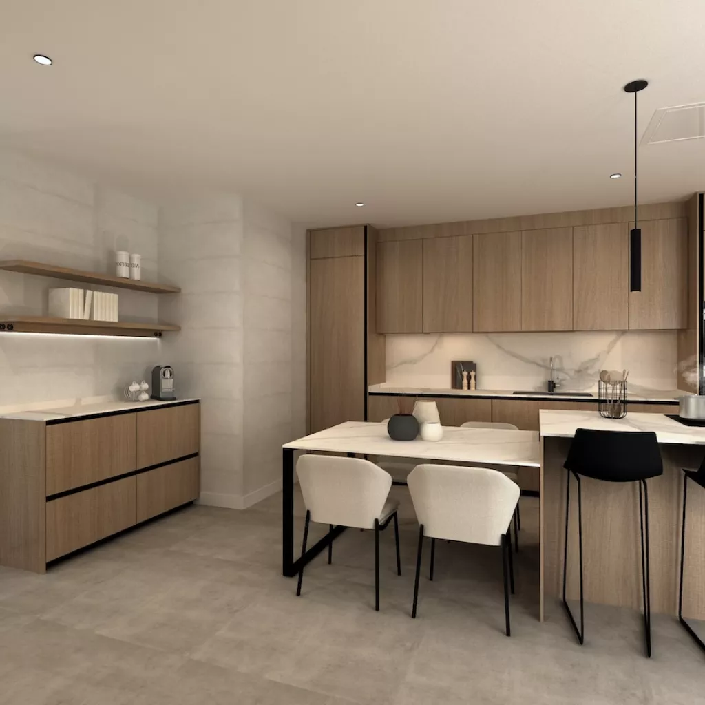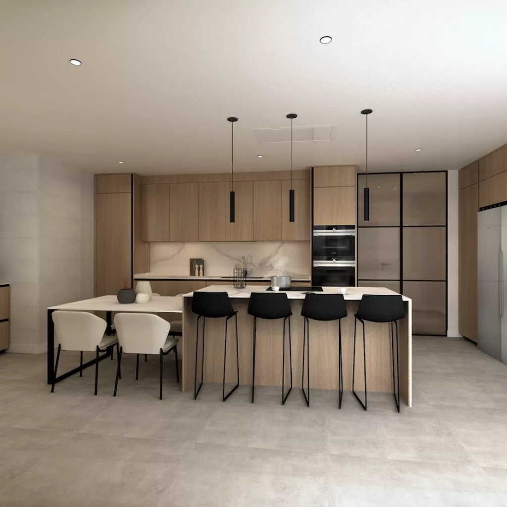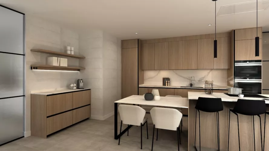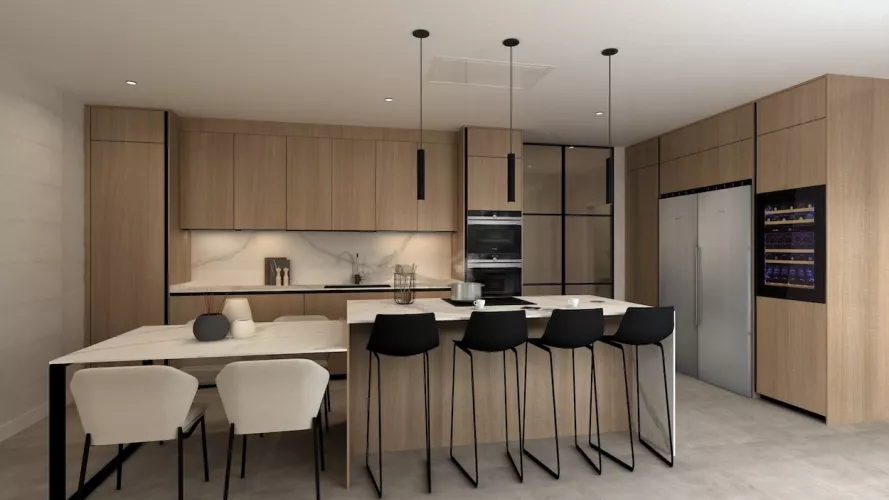 La isla en color Statuario Altissimo añade elegancia y continuidad al diseño, siendo también funcional para la limpieza y resistencia al uso diario. La isla sirve tanto para preparación de alimentos como para un área de comedor informal. Las sillas altas en color negro con diseño minimalista contrastan y complementan el mobiliario en madera. En la propia isla tenemos la placa de inducción y sobre ella la campana extractora oculta del mismo color del techo.
