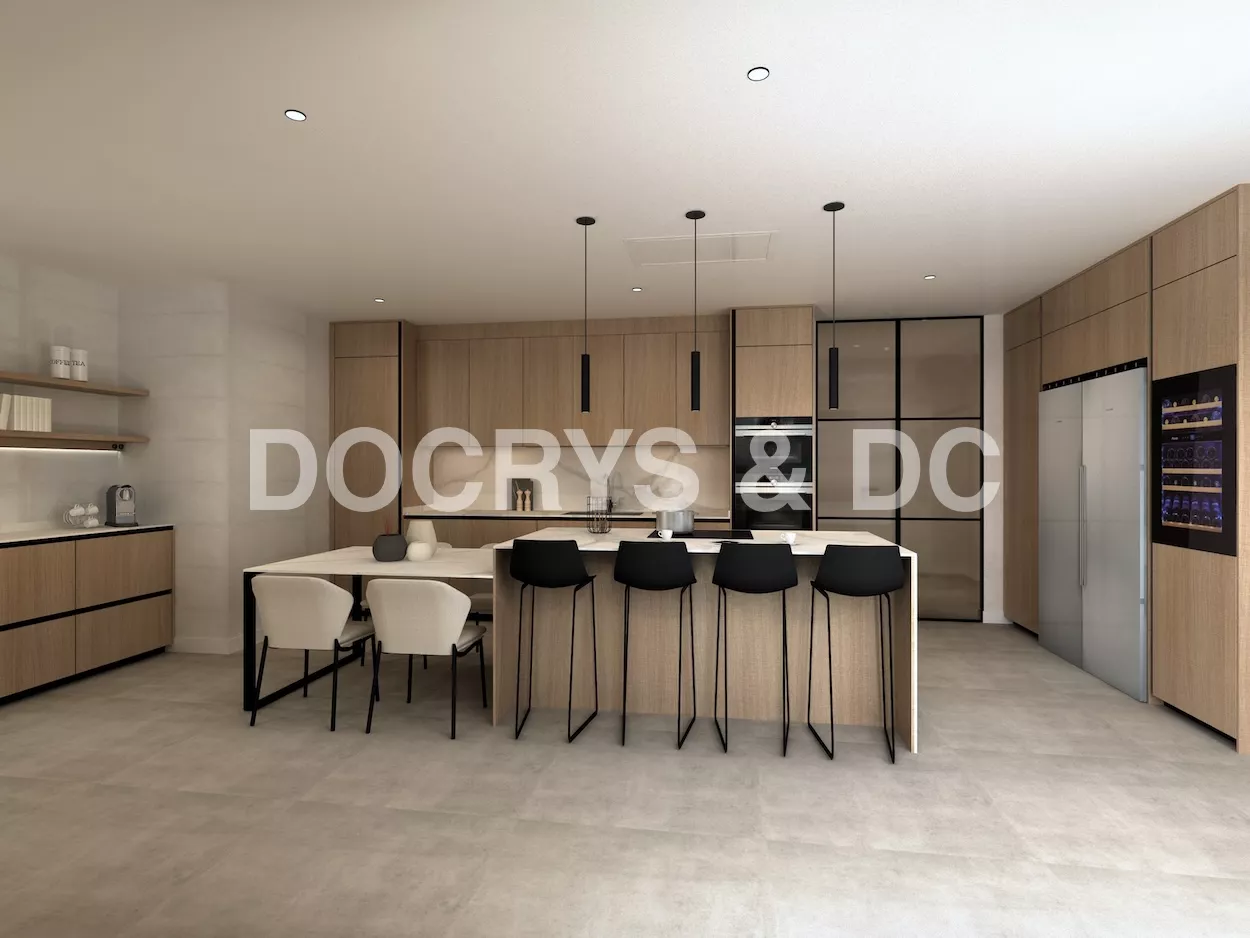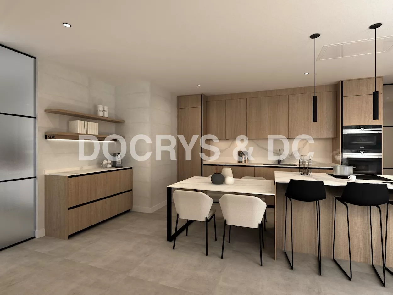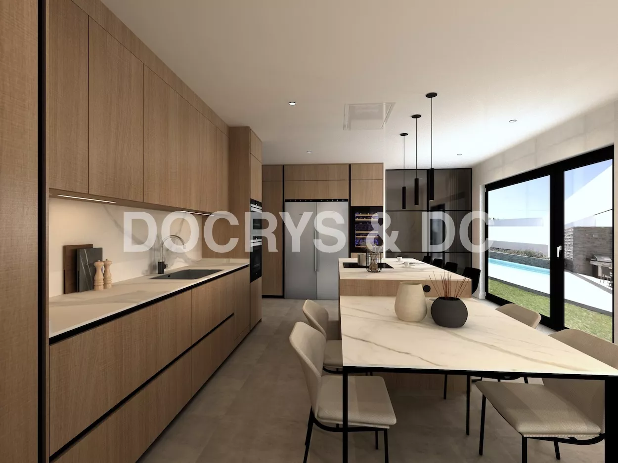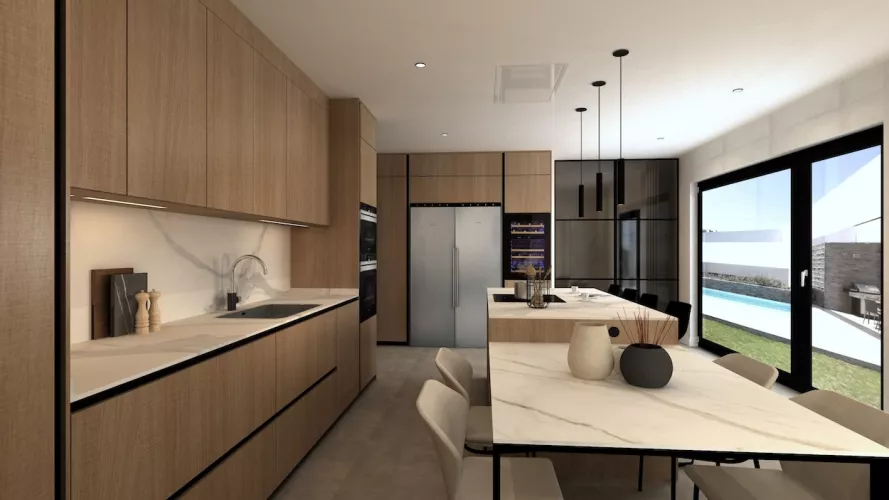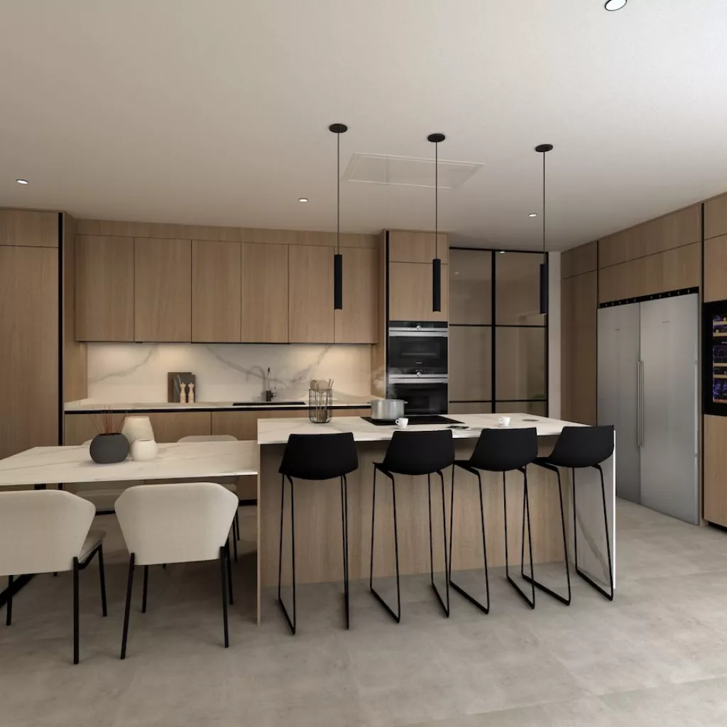 La isla en color Statuario Altissimo añade elegancia y continuidad al diseño, siendo también funcional para la limpieza y resistencia al uso diario. La isla sirve tanto para preparación de alimentos como para un área de comedor informal. Las sillas altas en color negro con diseño minimalista contrastan y complementan el mobiliario en madera. En la propia isla tenemos la placa de inducción y sobre ella la campana extractora oculta del mismo color del techo.