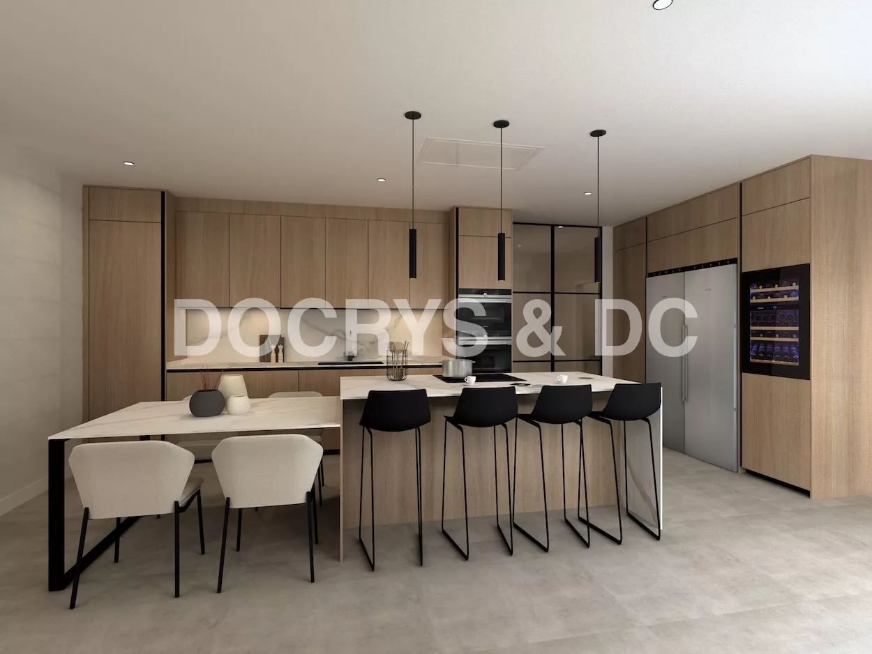 En el primer frente podemos observar un gran espacio de trabajo para cocinar junto al fregadero también en color negro seda para aportar contraste a la encimera clara. A continuación tenemos horno y microondas para finalizar con el frente. Los cascos son en roble claro, lo que aporta calidez y armonía al espacio, combinando con el estilo natural y moderno. En el siguiente podemos encontrar frigorífico y congelador uno al lado del otro y a continuación una vinoteca.