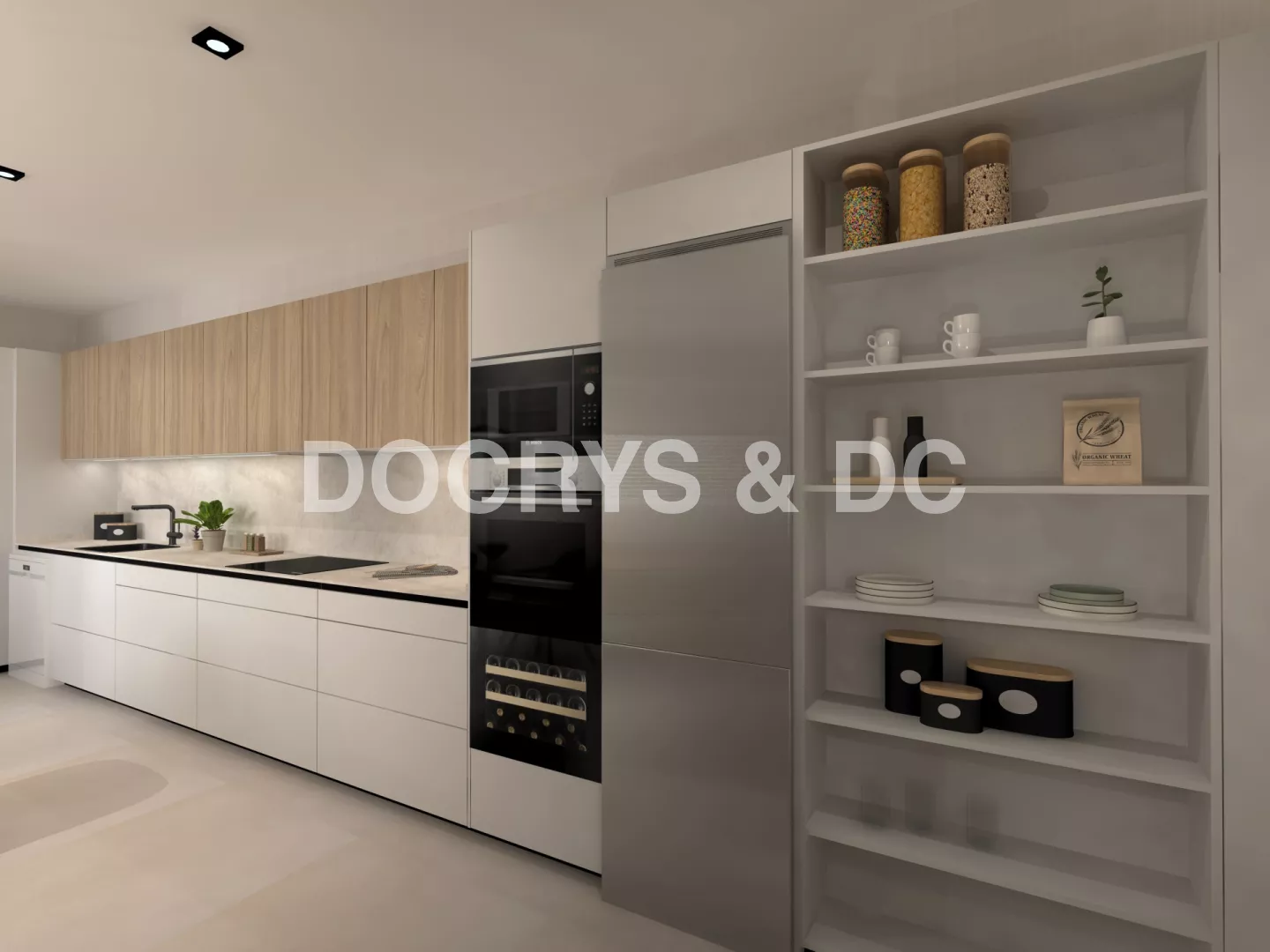 El mobiliario alto en madera, en combinación con los armarios columna de gran capacidad, garantiza un amplio espacio de almacenaje manteniendo el equilibrio visual. Destacan los electrodomésticos de integración y el frigorífico en acabado acero inoxidable, que aportan un aire moderno y sofisticado. La vinoteca vertical integrada añade un detalle práctico y exclusivo.