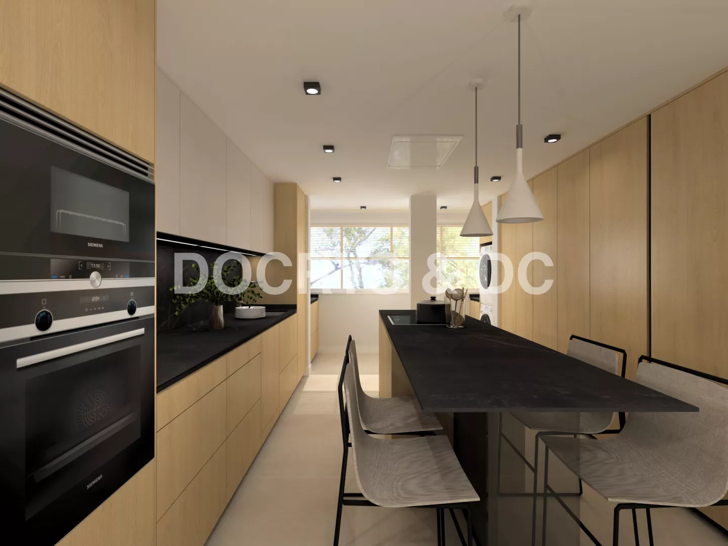 La iluminación técnica y decorativa juega un papel protagonista: focos empotrados en techo que garantizan uniformidad, y lámparas colgantes sobre la isla que aportan un toque escultural y moderno.