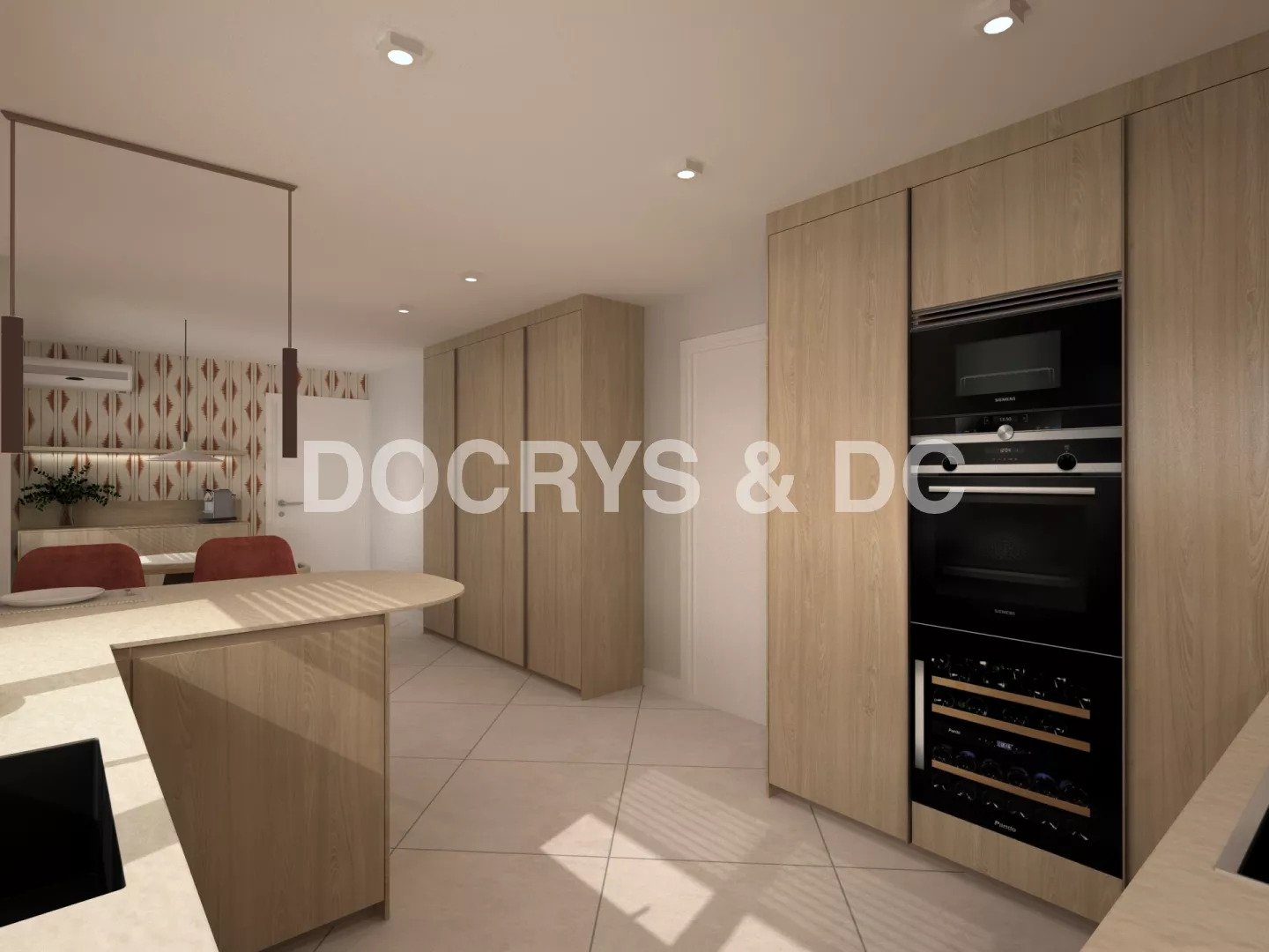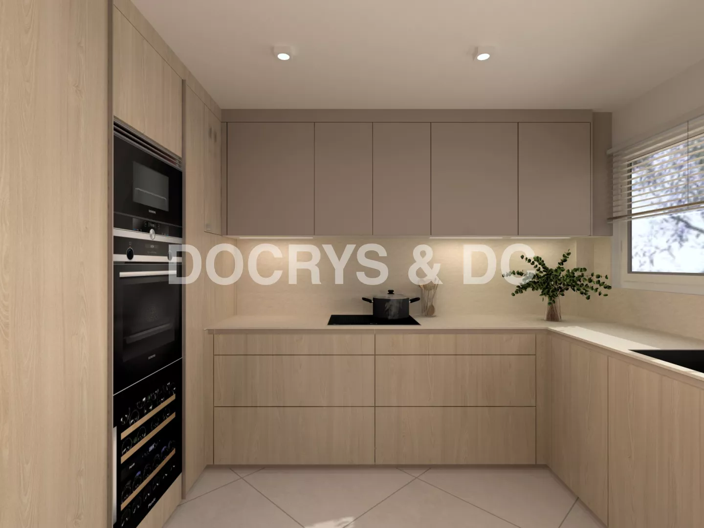 El mobiliario en madera clara envuelve todo el espacio aportando una imagen ordenada. El proyecto también incluye columnas a medida en las que se han integrado los electrodomésticos, en ellas también está alojada la vinoteca y el almacenamiento vertical sin romper la continuidad de los frentes. La zona de trabajo se resuelve con encimera clara y grifería en negro para aportar contraste.