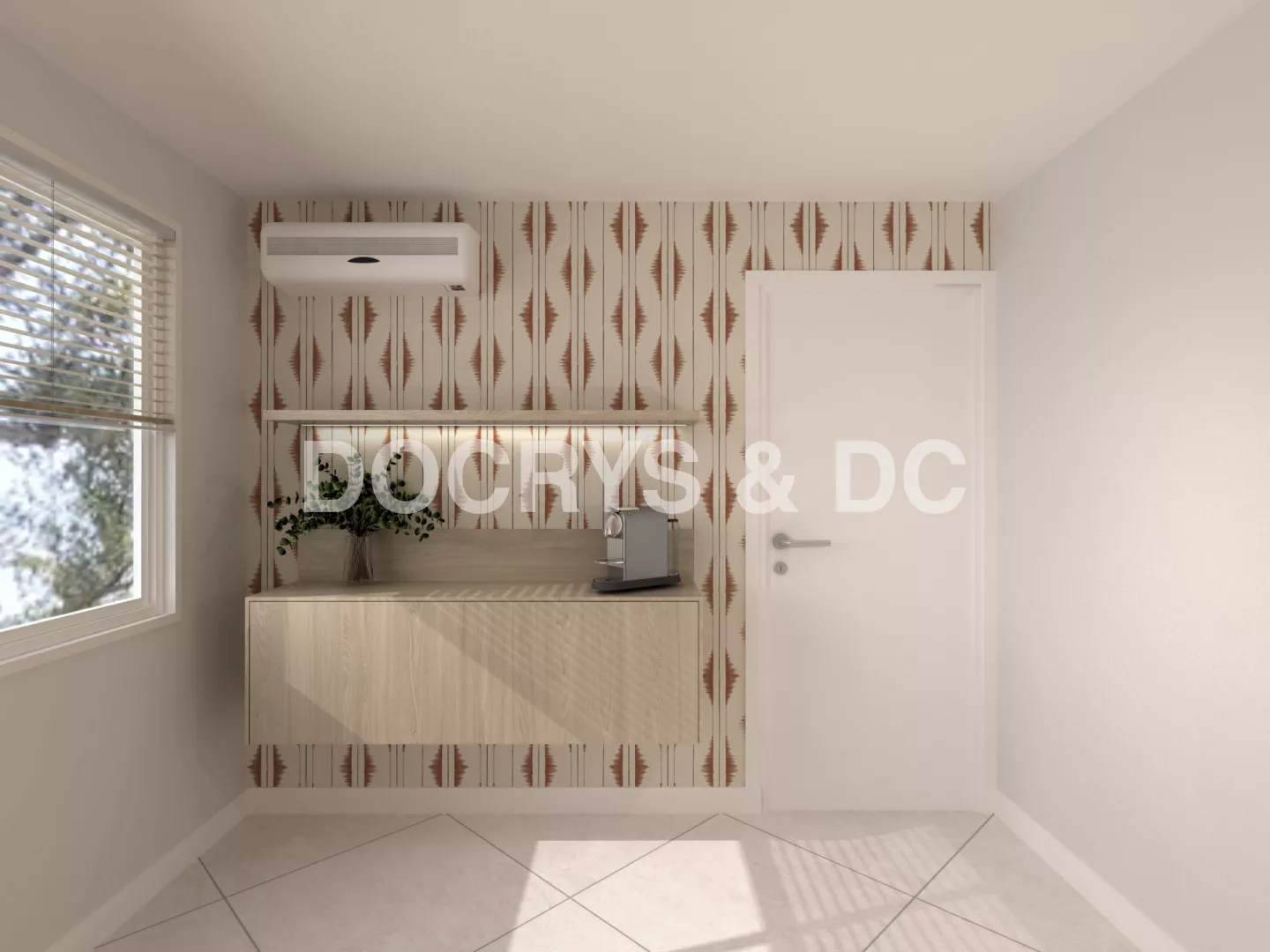 El proyecto incluye también una zona auxiliar decorativa, revestida con un papel pintado que añade a la estancia gran personalidad. El mueble suspendido y la iluminación LED convierten la pared en un rincón funcional y estético.