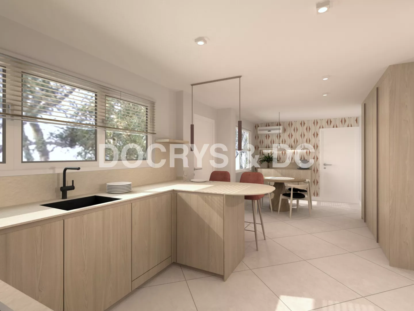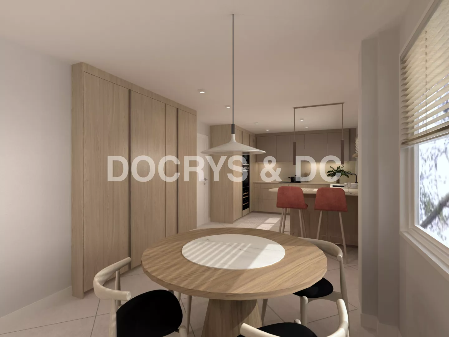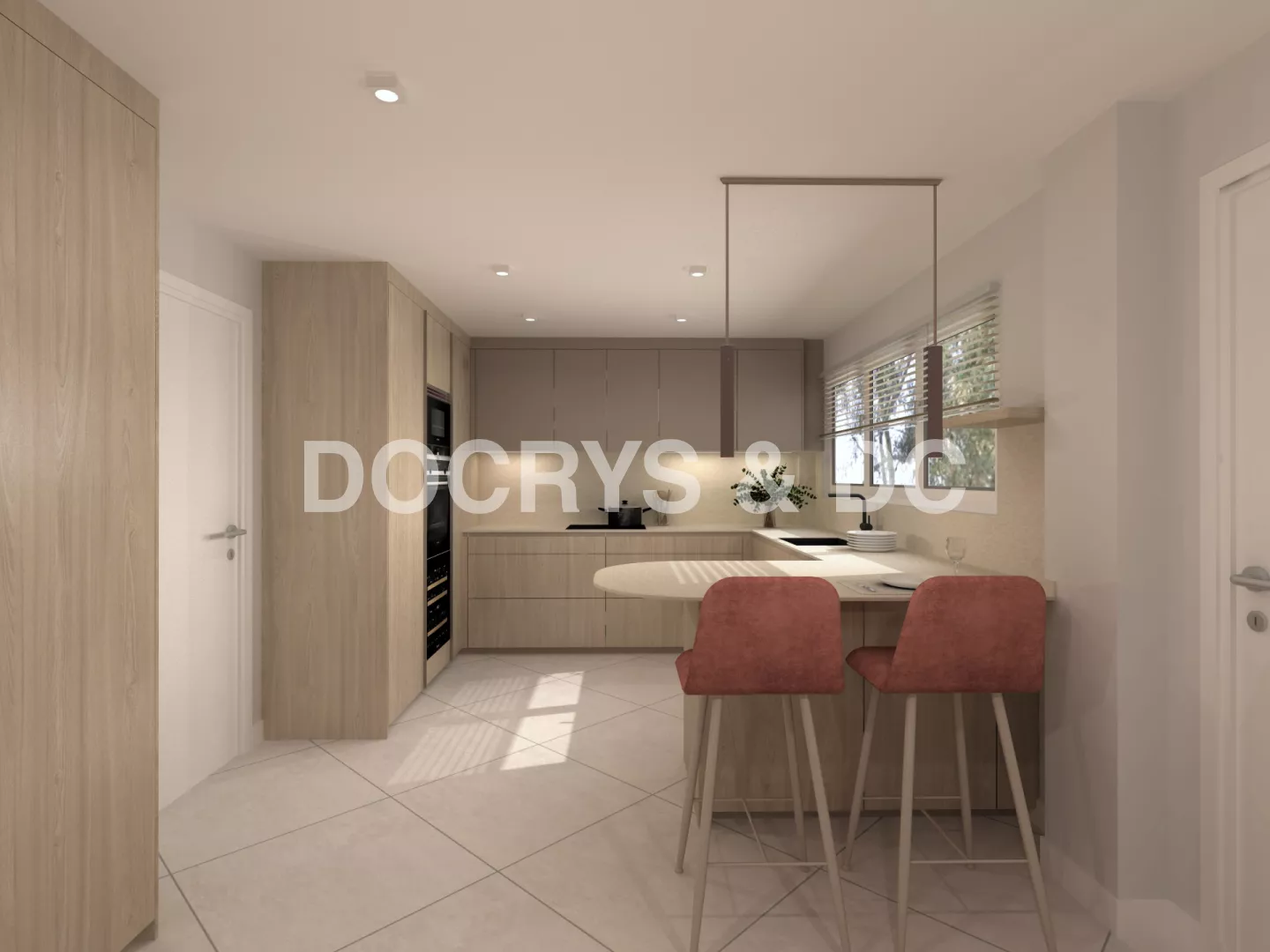 La mesa circular en madera completa el diseño, favoreciendo la interacción y el aprovechamiento del espacio. La luz natural que entra disimulada con estores refuerza el ambiente relajado y luminoso de la cocina.