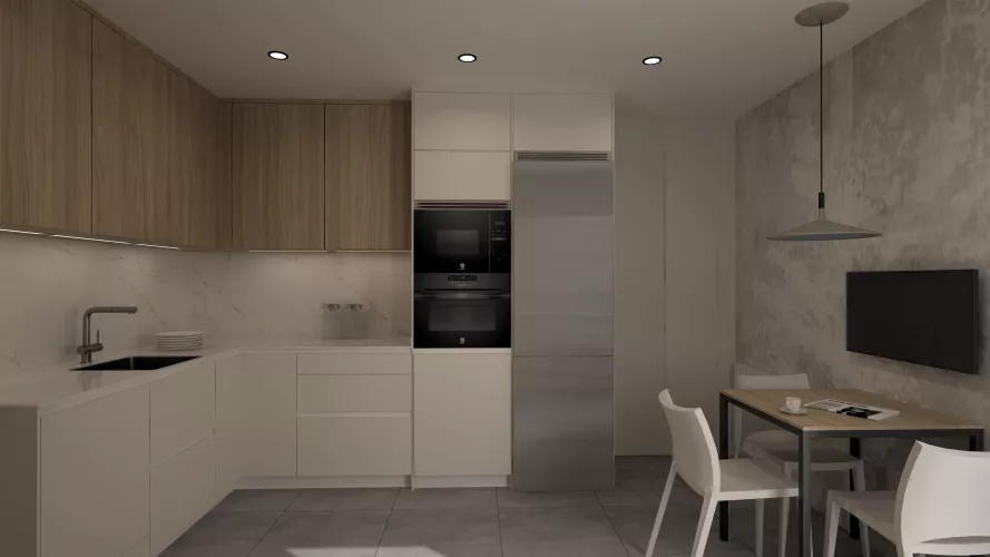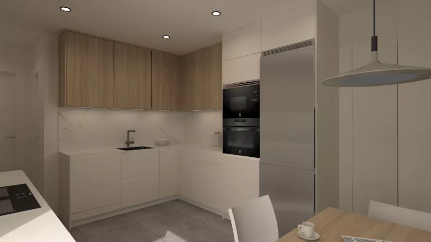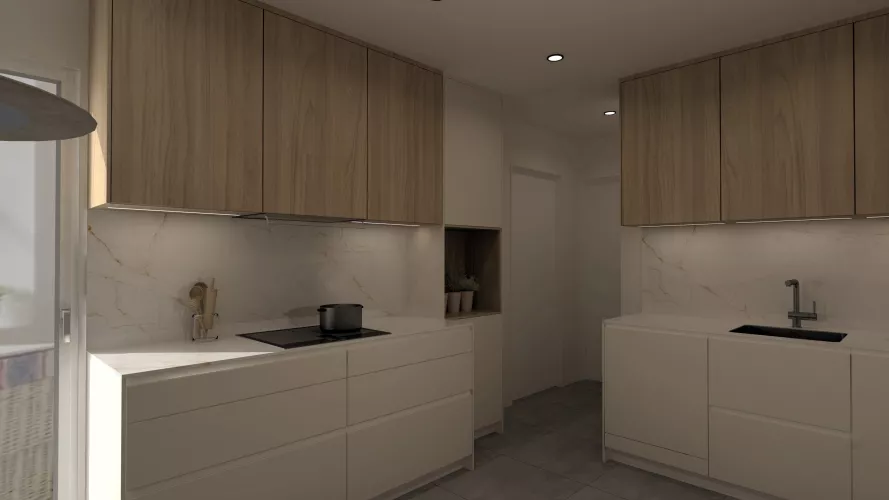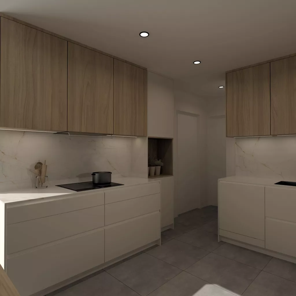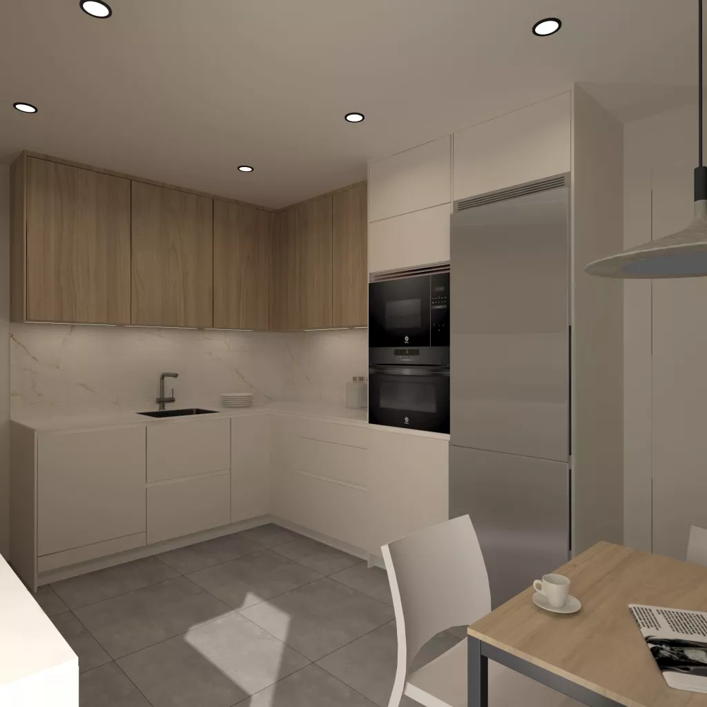 Este proyecto de cocina Santos presenta un diseño compacto y funcional, el material es estratificado color blanco perla con los cascos en Olmo claro, lo que aporta calidez a la cocina. La encimera es Ascale con color Lucca Gold, que va a conjunto con la cocina y aporta claridad y amplitud.