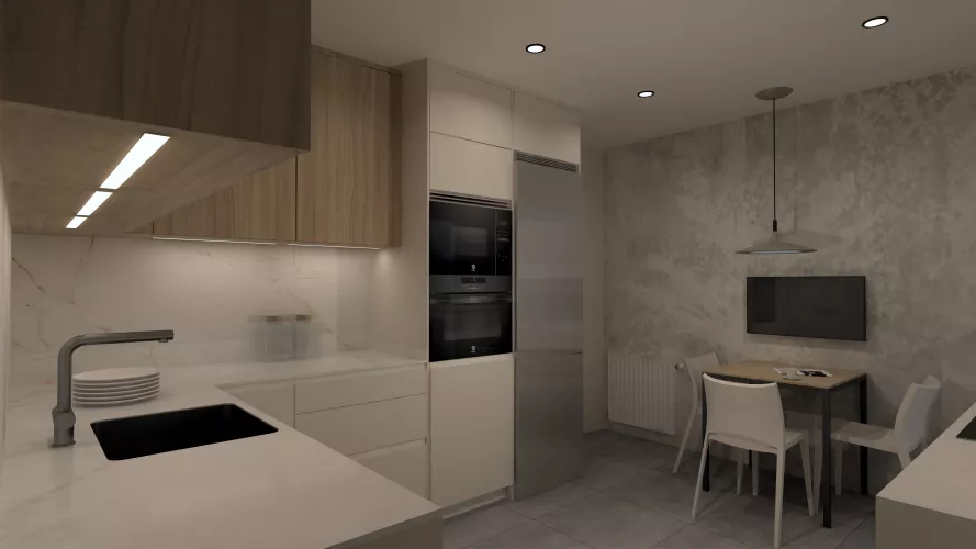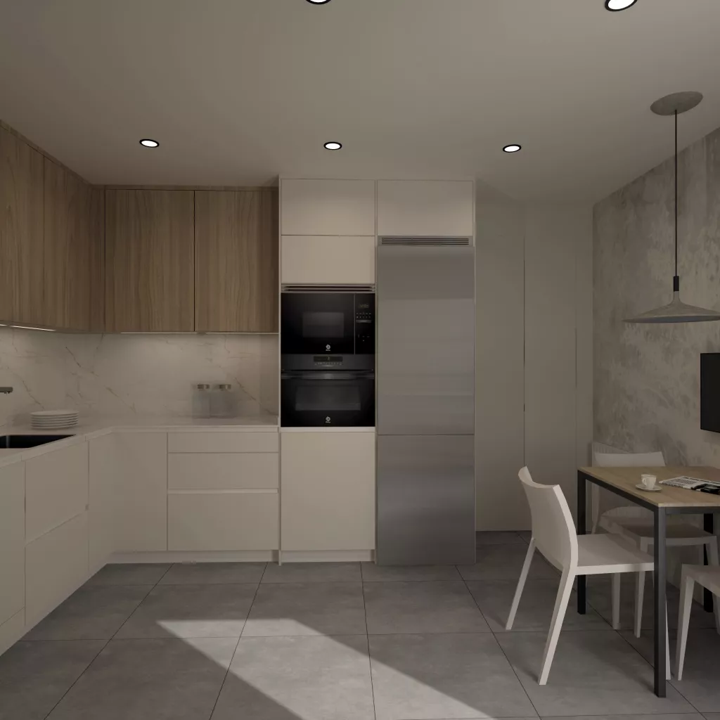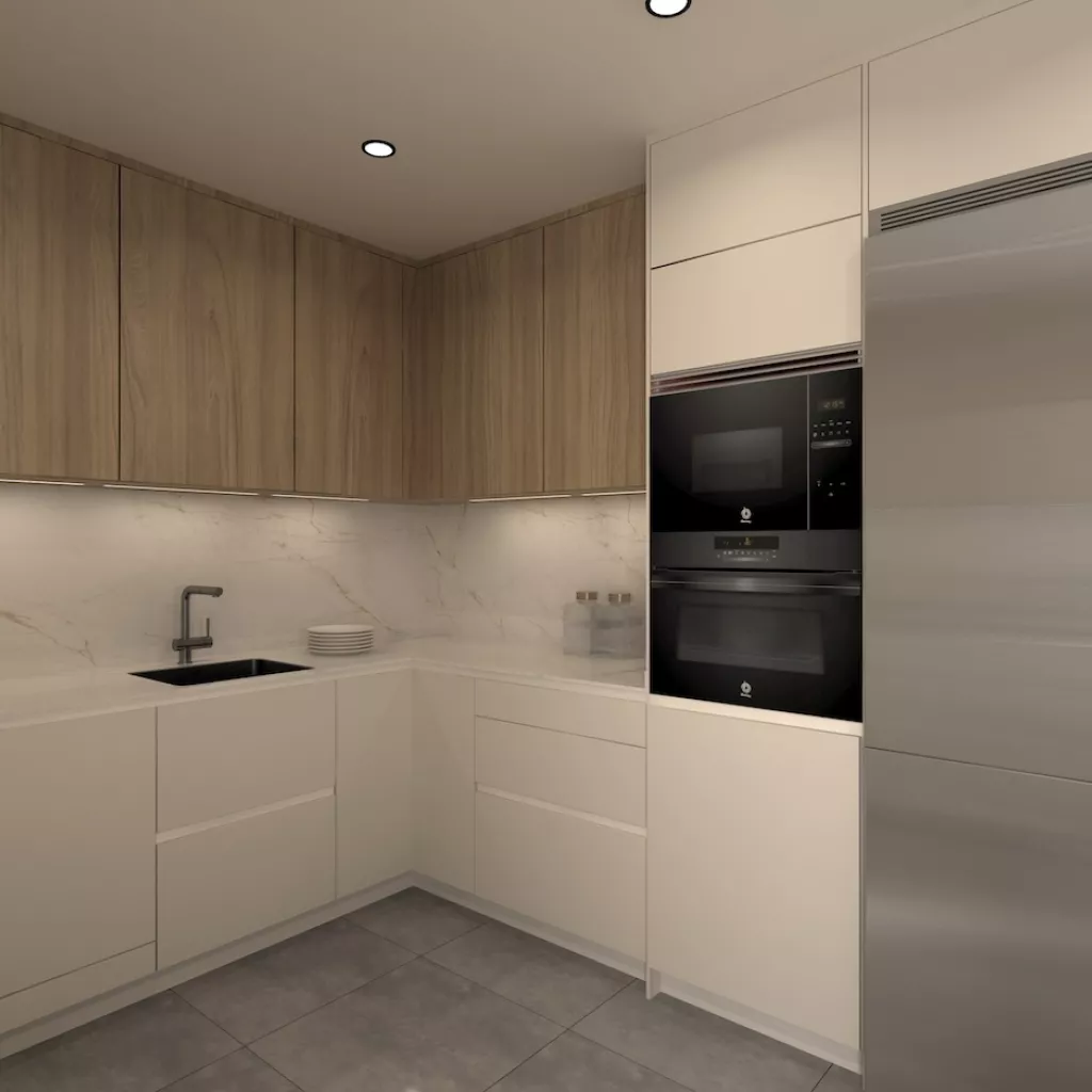 Esta disposición y selección de materiales hacen que la cocina sea visualmente atractiva y altamente práctica, perfecta para amantes del diseño contemporáneo.