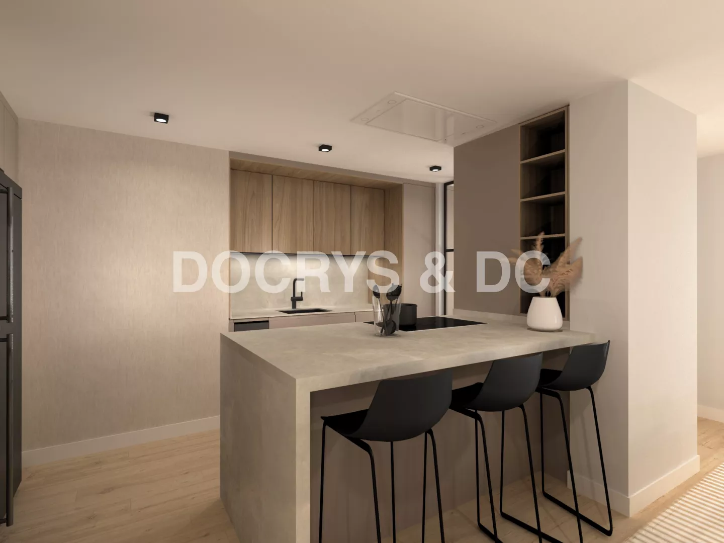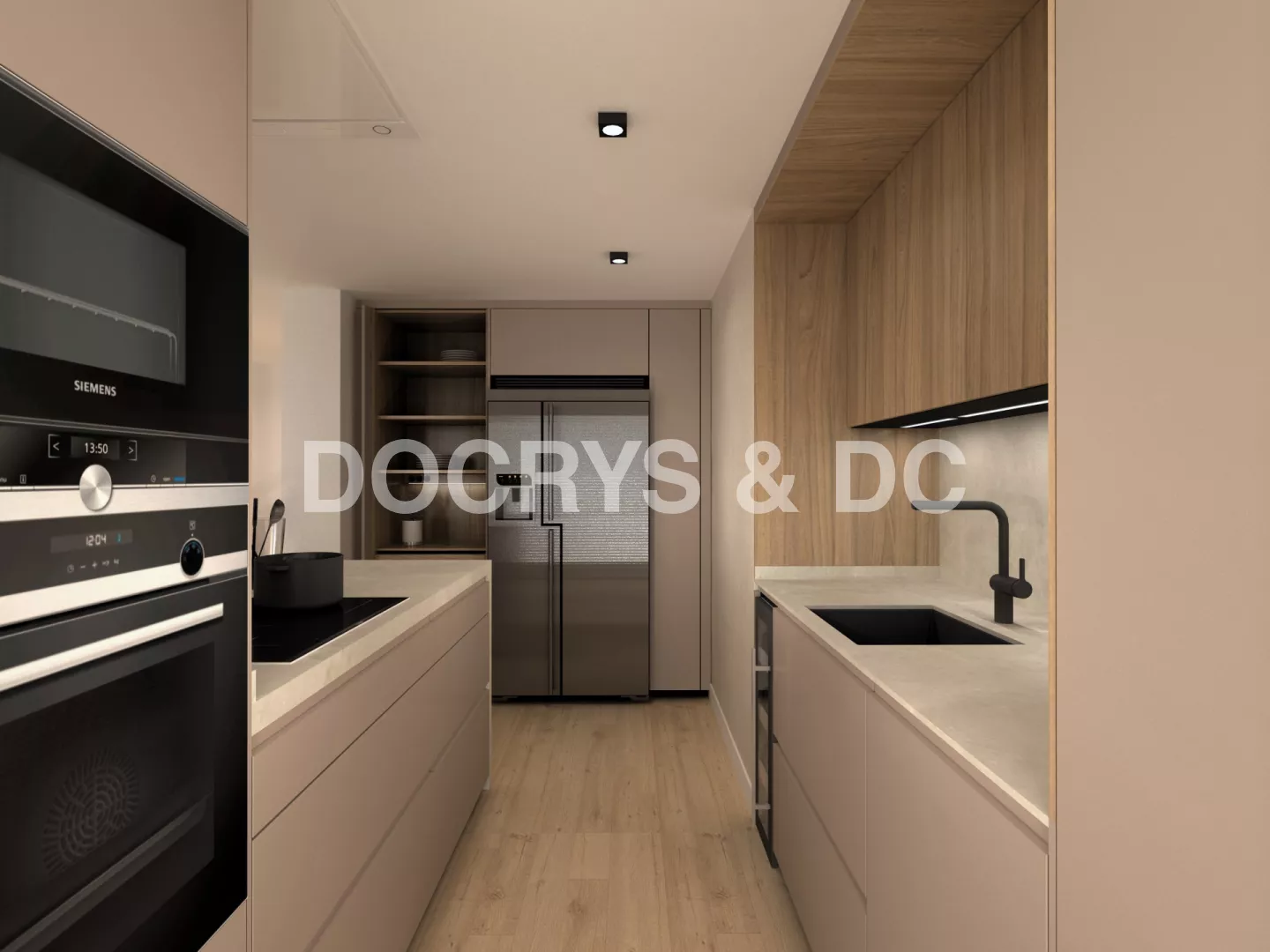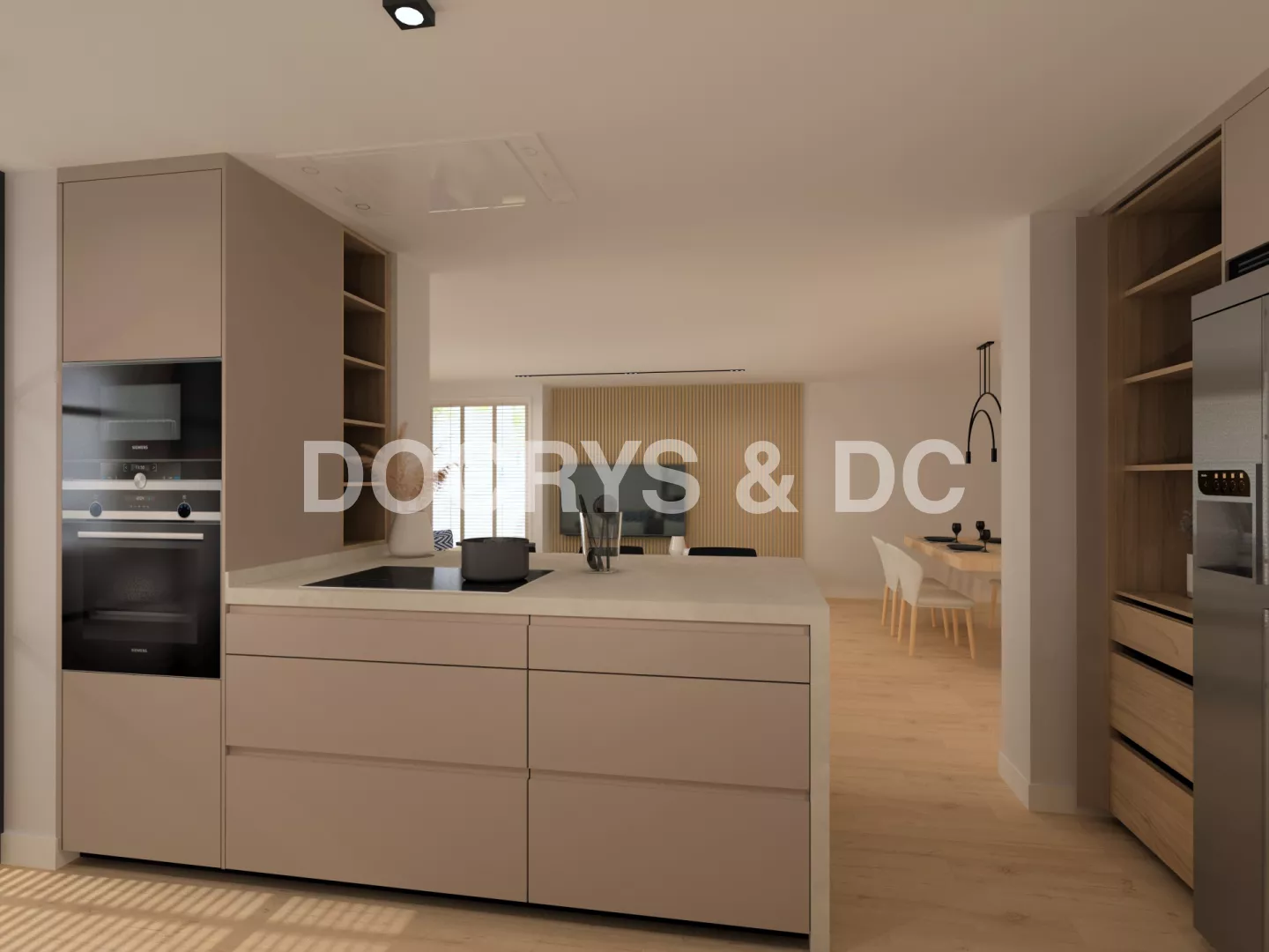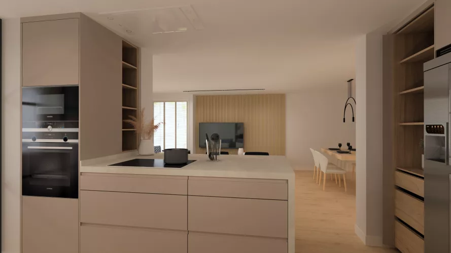 Cocina Santos Plataforma D en Gris Arena, Olmo Claro y Neolith Platinum White con península funcional