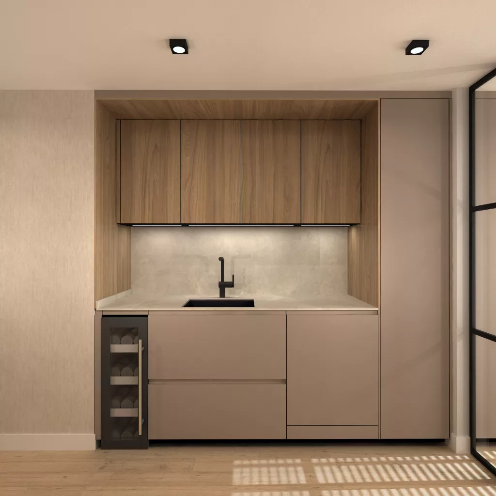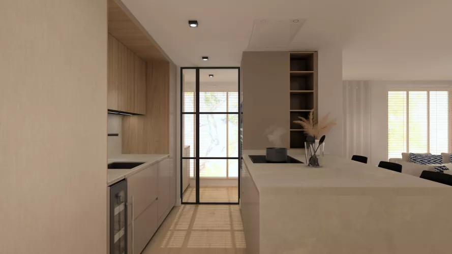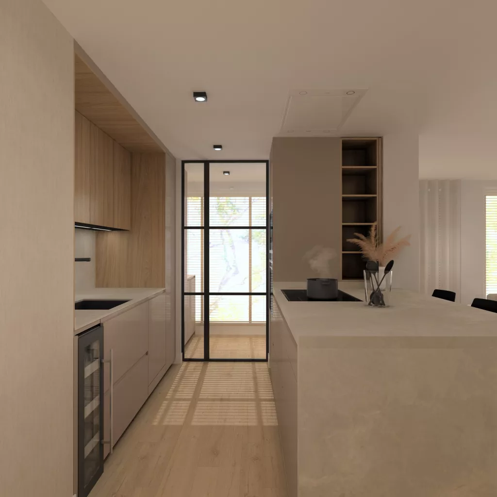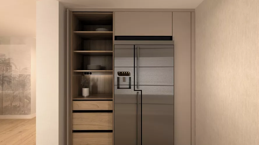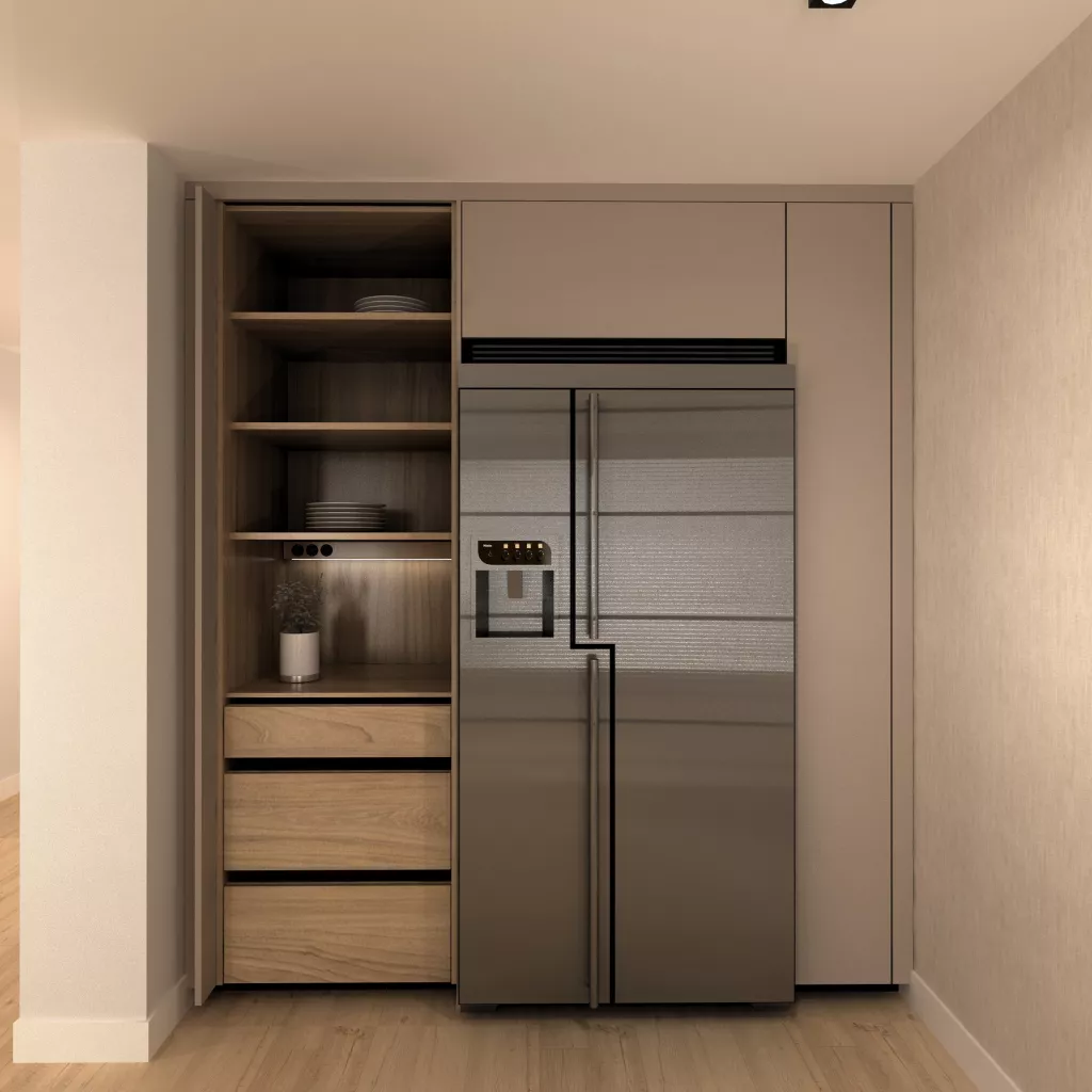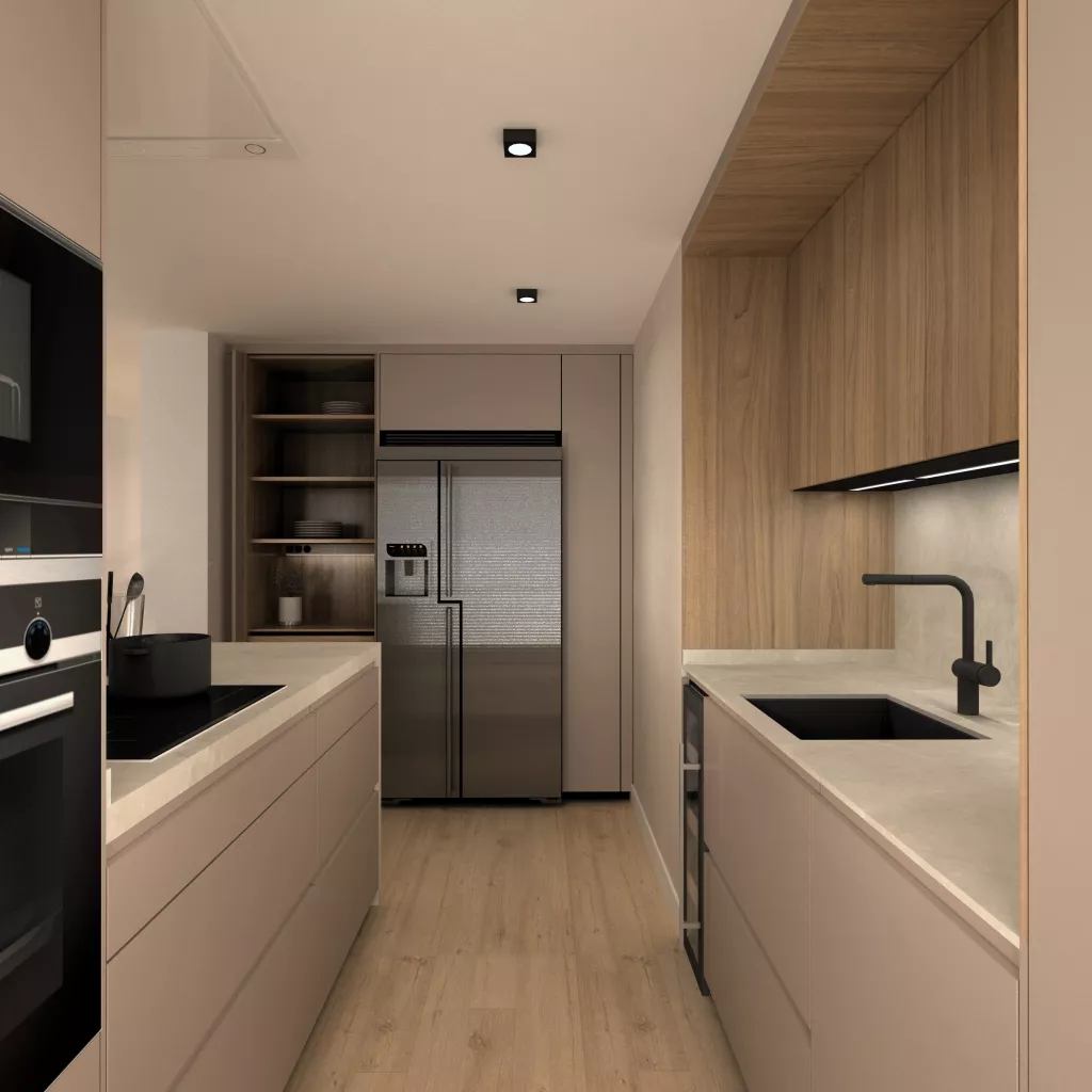 En el primer frente podemos observar un desayunador con estantes y led integrado bajo mueble en luz neutra. Seguido de la nevera y congelador integrados en el mueble en acero inox. En el siguiente frente tenemos una vinoteca, un fregadero y un lavavajillas panelado dentro del mueble para no romper con la estética. Sobre esto tenemos led integrado bajo mueble como en el anterior frente.