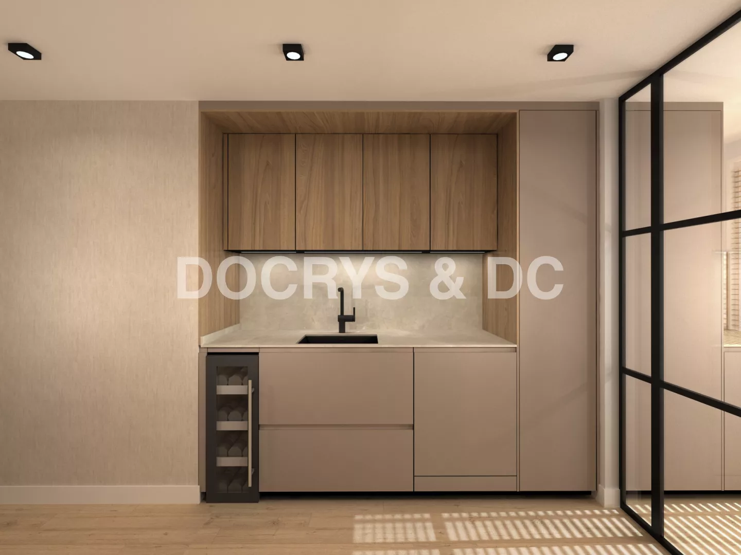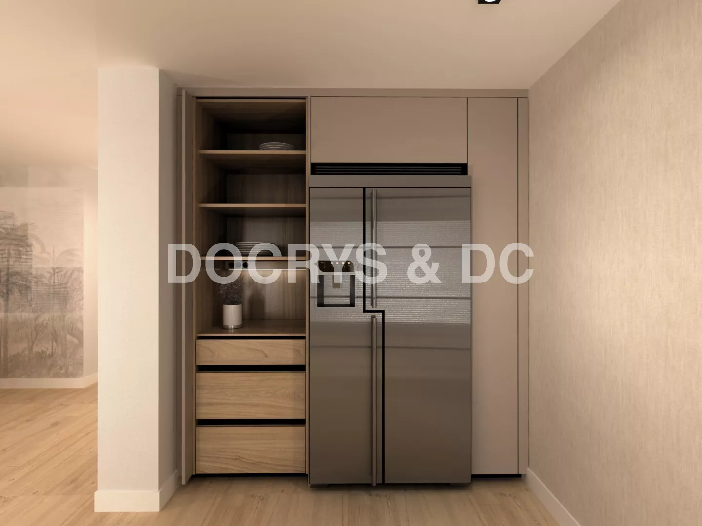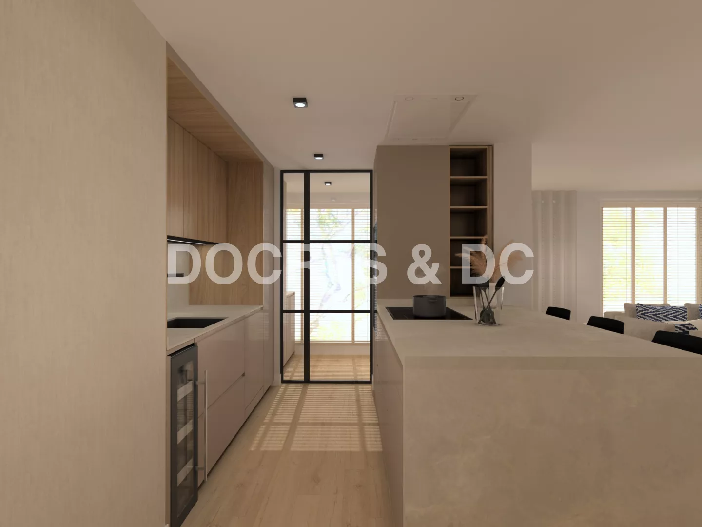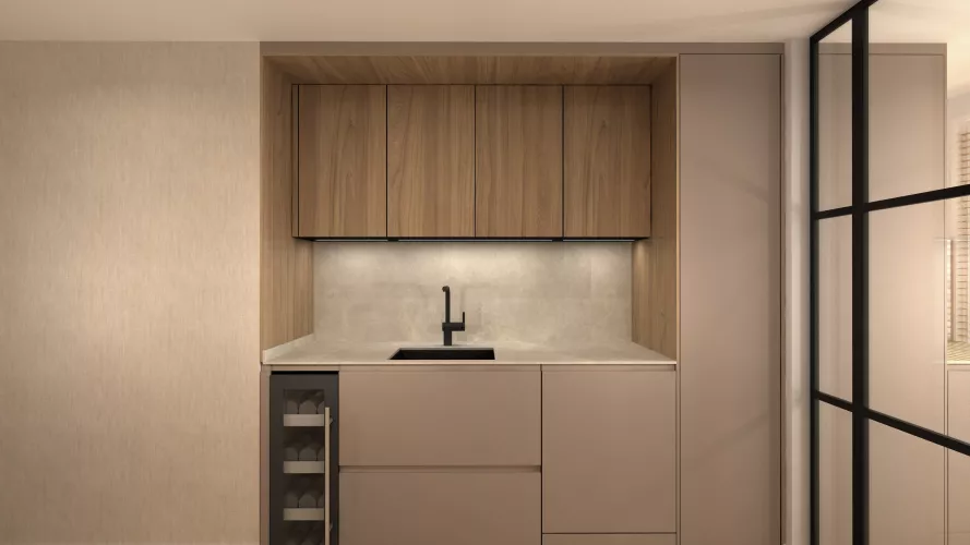 En el primer frente podemos observar un desayunador con estantes y led integrado bajo mueble en luz neutra. Seguido de la nevera y congelador integrados en el mueble en acero inox. En el siguiente frente tenemos una vinoteca, un fregadero y un lavavajillas panelado dentro del mueble para no romper con la estética. Sobre esto tenemos led integrado bajo mueble como en el anterior frente.