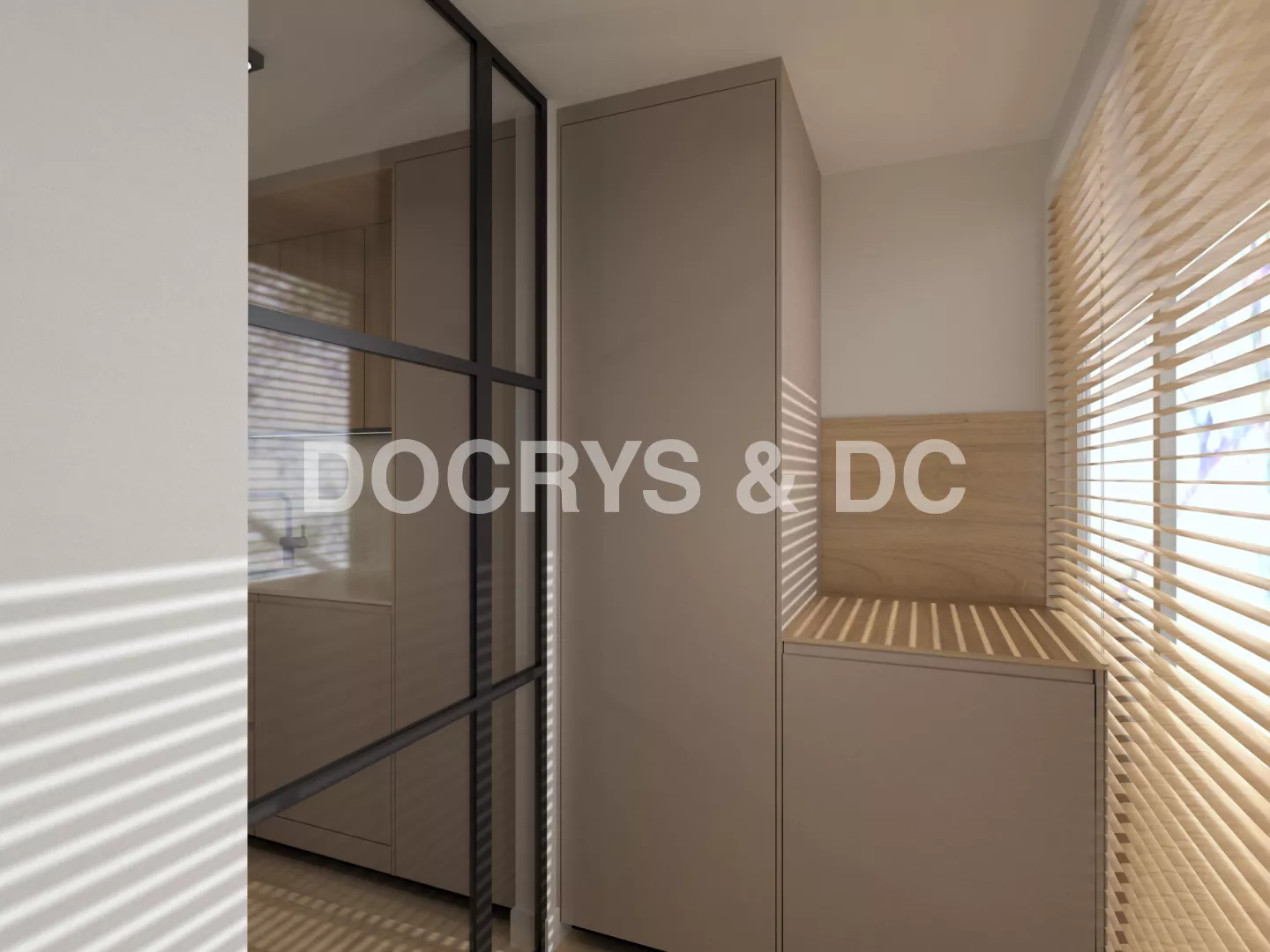 Separado de la cocina por una puerta cristalera tenemos la zona del lavadero con la lavadora panelada para evitar el ruido visual.
