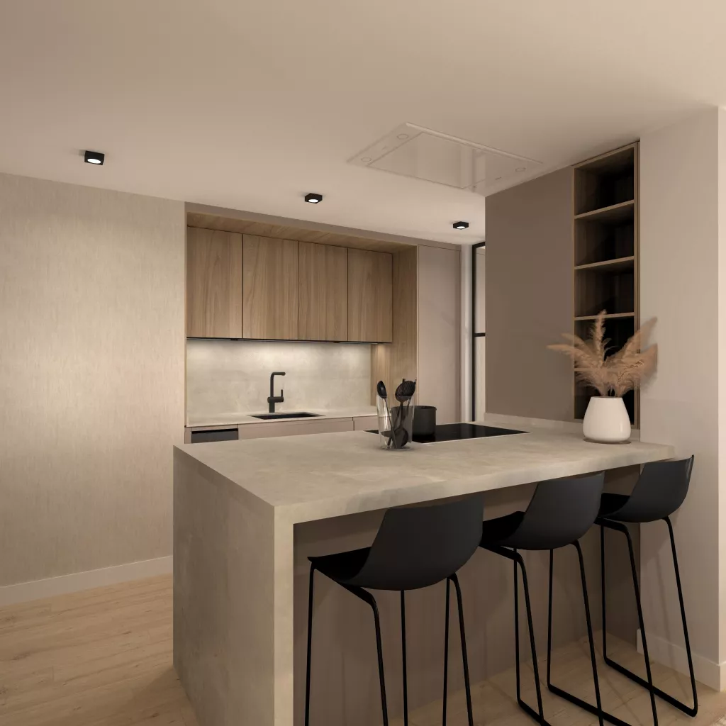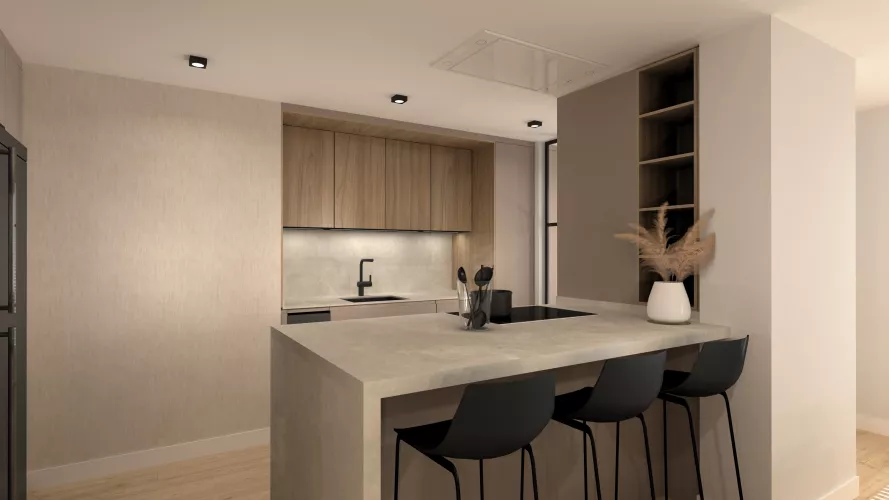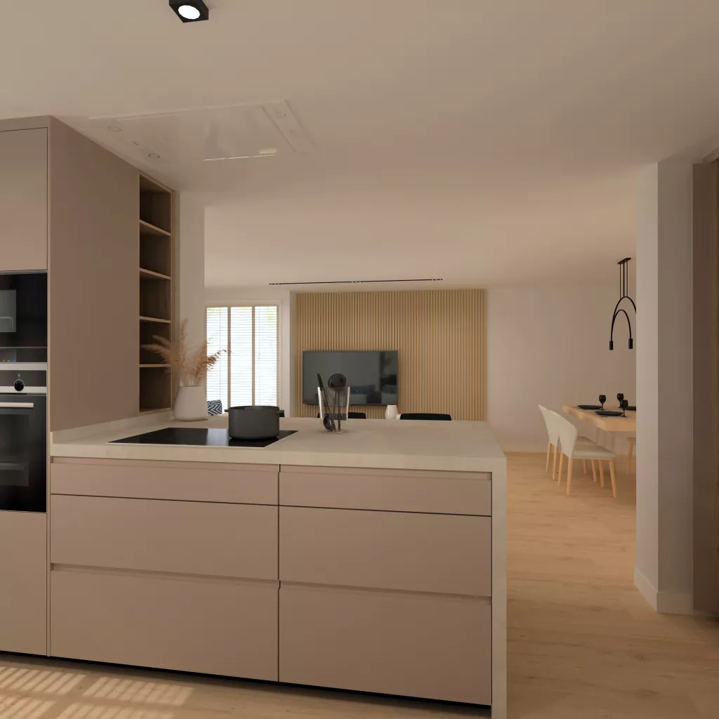 Esta está abierta al salón donde podemos observar un mesado Santos donde hacer reuniones formales y comer en el día a día. En cuanto a la iluminación, sobre esta podemos ver una lámpara colgante y en el resto de la cocina focos en el techo en tono neutro.