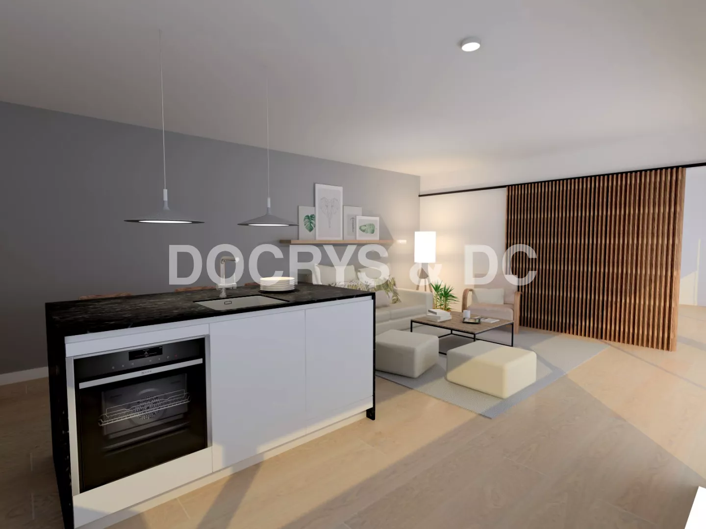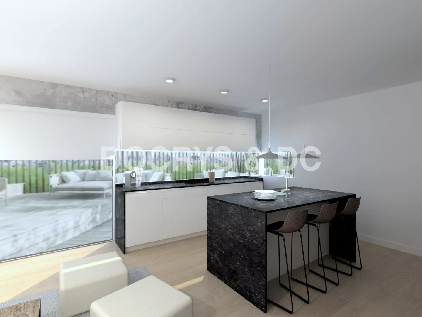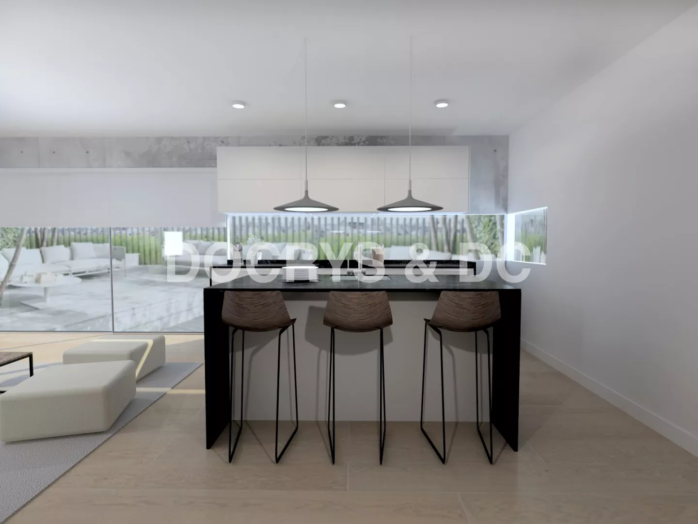 La iluminación de la isla es de Foscarini con el modelo Aplomb large y taburetes de La Palma.