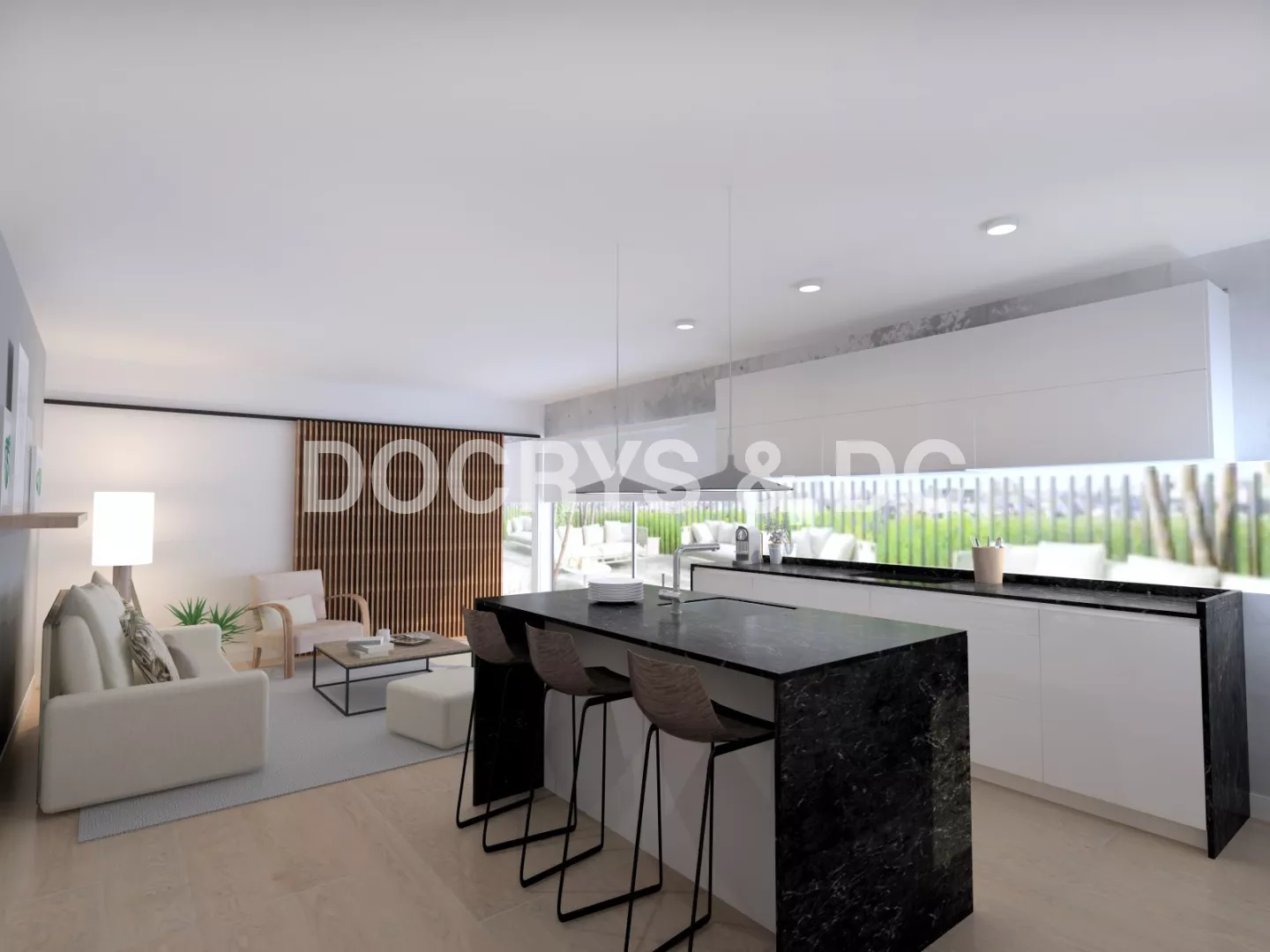 Cocina Santos en color Blanco Innsbruck con material estratificado. Este diseño de cocina moderna abierta al salón, está distribuido con un frente con muebles bajos y muebles altos y una isla central donde una pequeña barra da espacio para tres comensales.