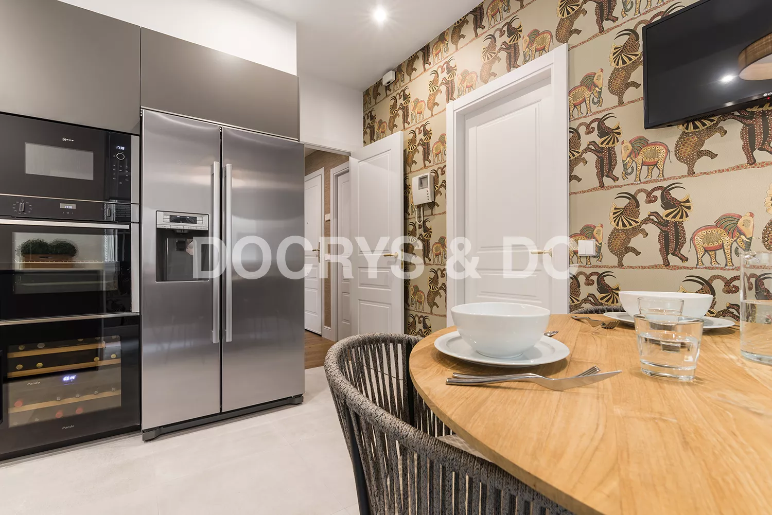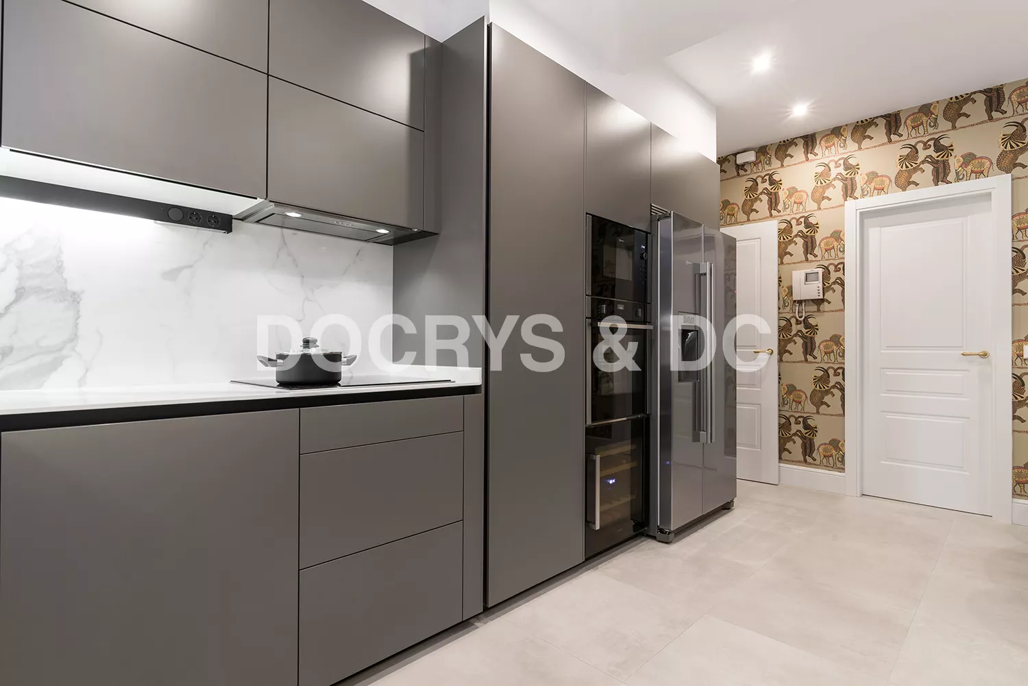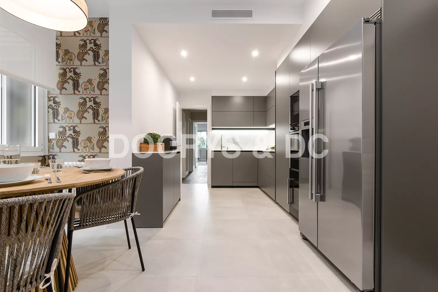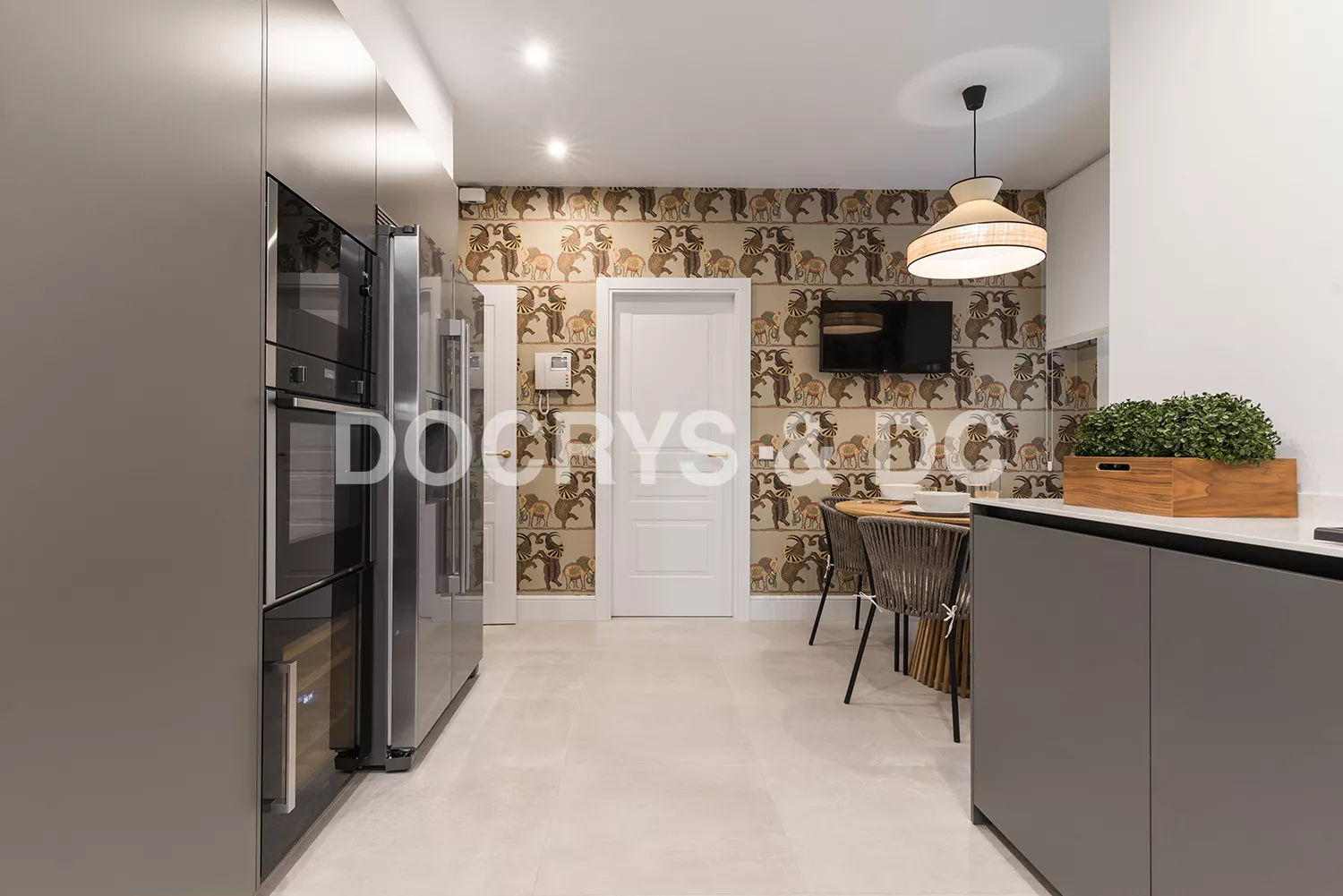 El estilo sobrio y elegante de esta cocina, se completa con la zona de office, donde destaca un papel pintado muy llamativo.