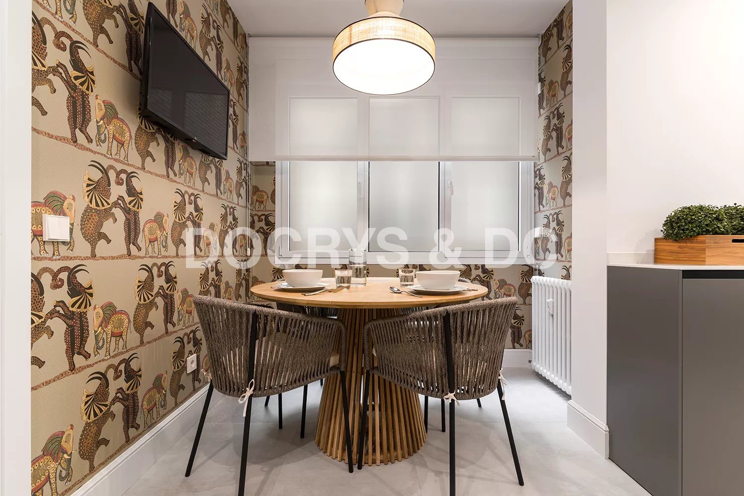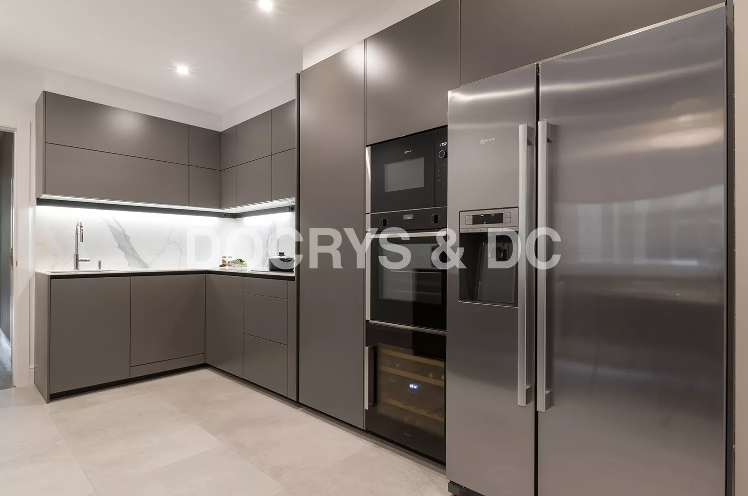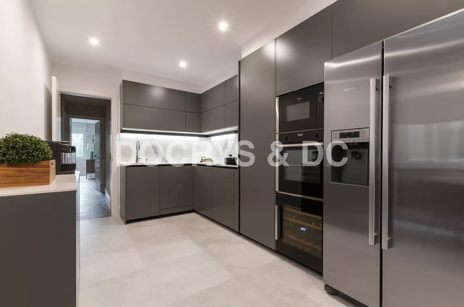 El estilo sobrio y elegante de esta cocina, se completa con la zona de office, donde destaca un papel pintado muy llamativo.