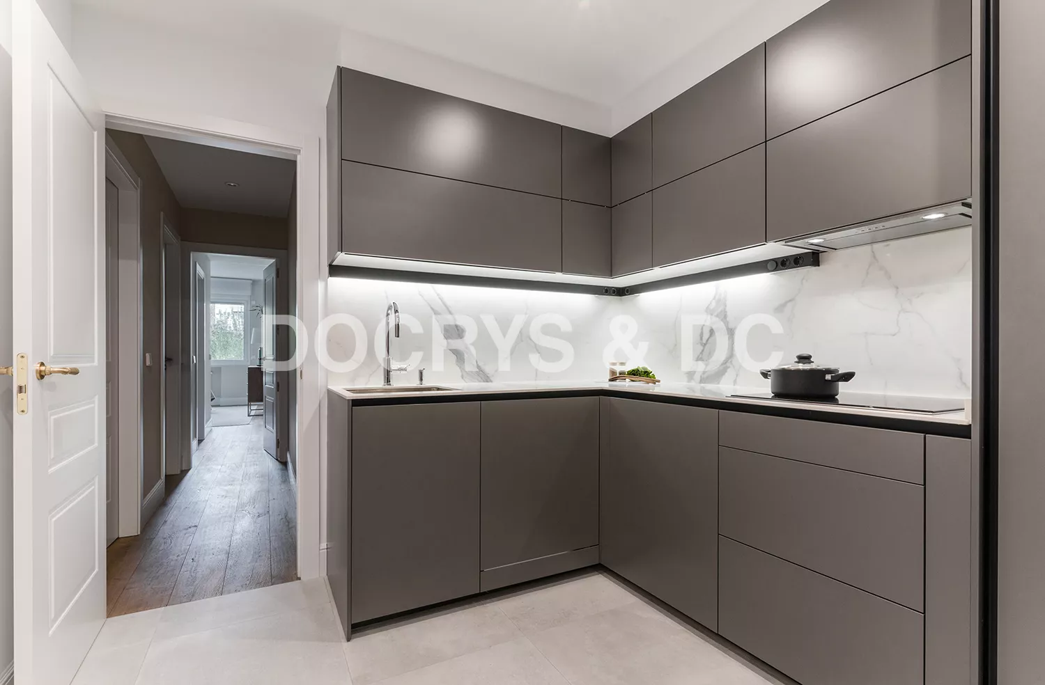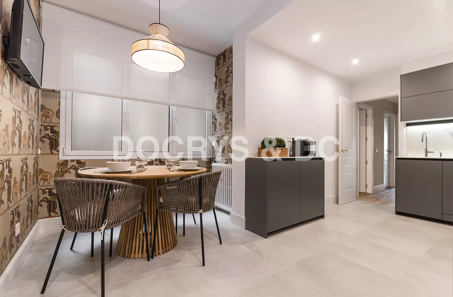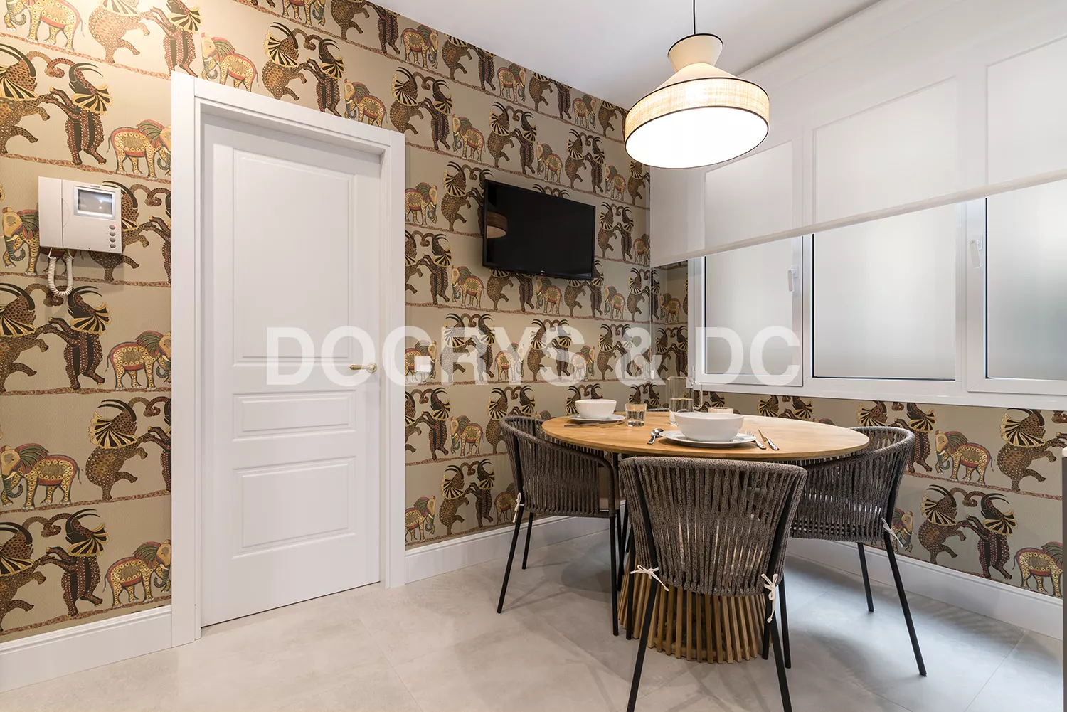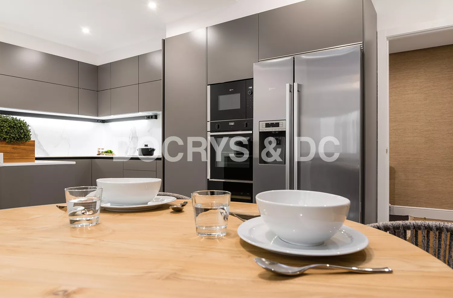El estilo sobrio y elegante de esta cocina, se completa con la zona de office, donde destaca un papel pintado muy llamativo.