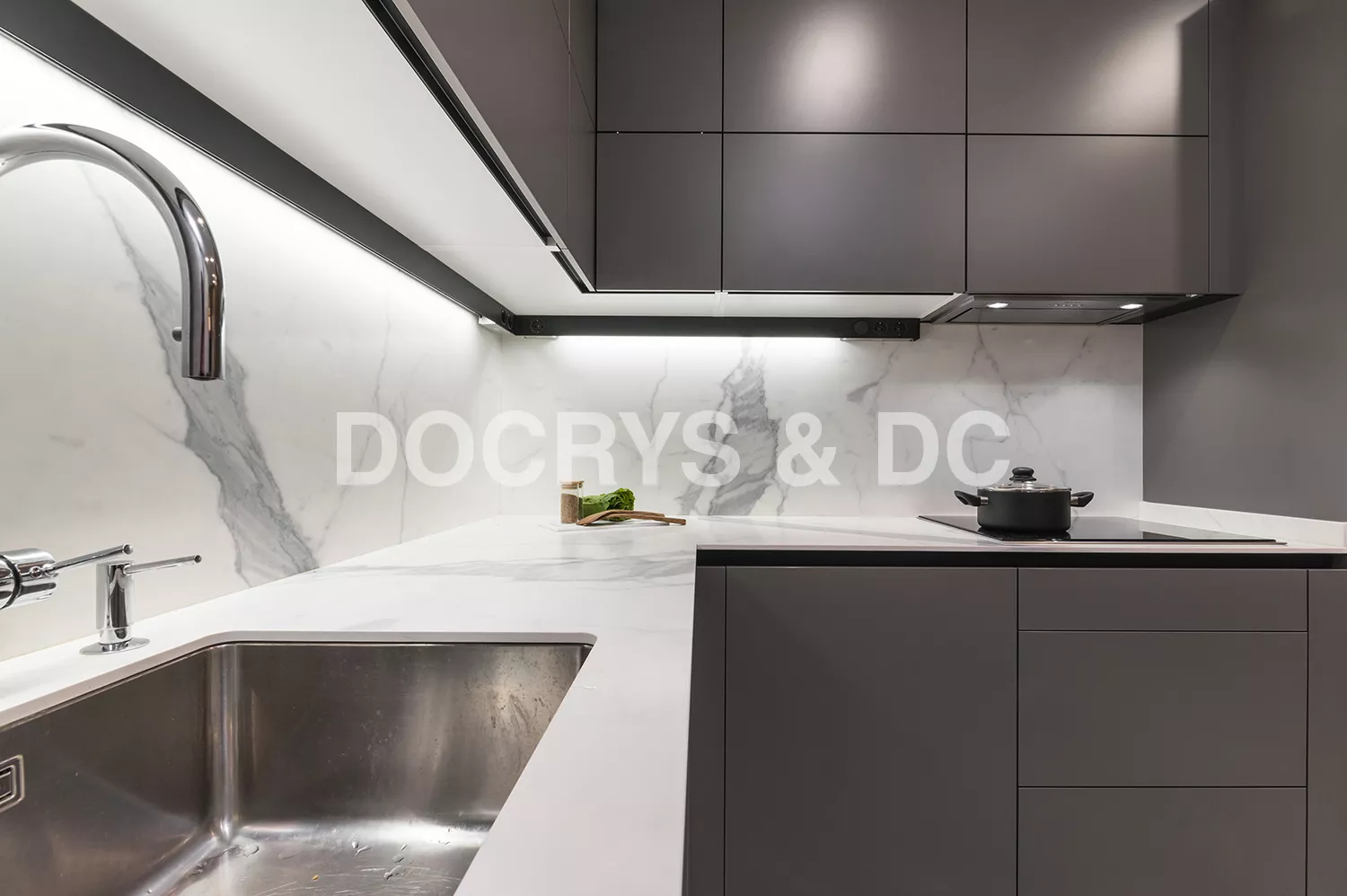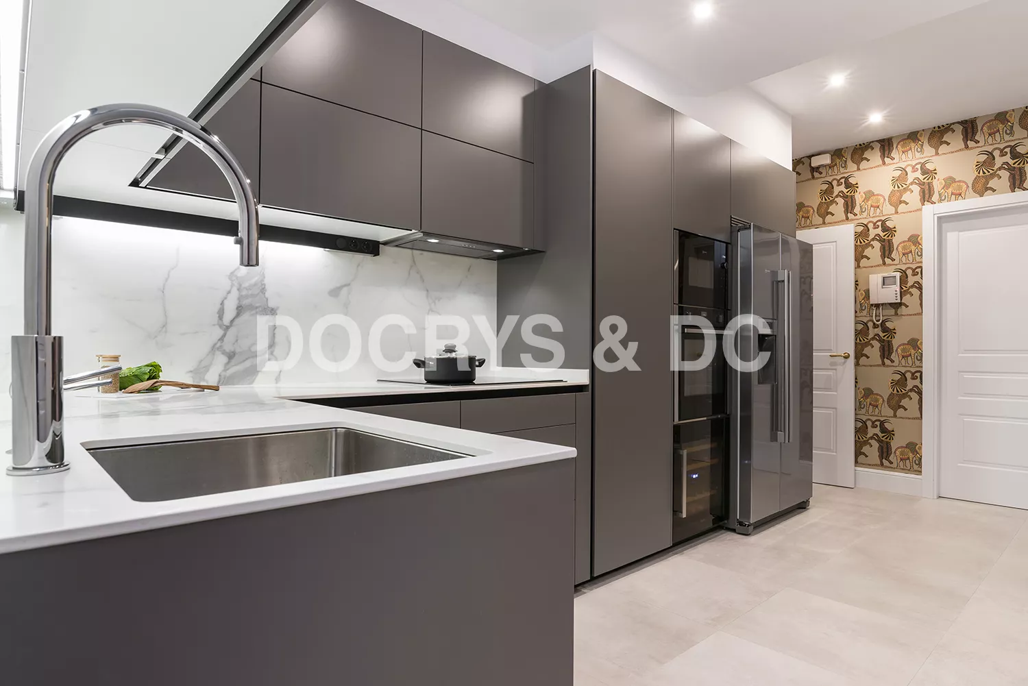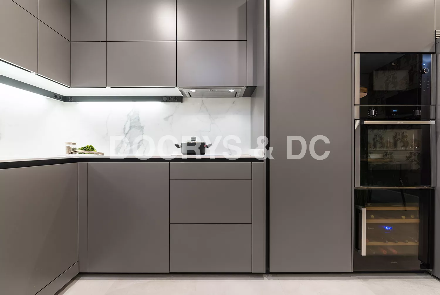 Las líneas puras y los frentes lisos, caracterizan el diseño de esta cocina.