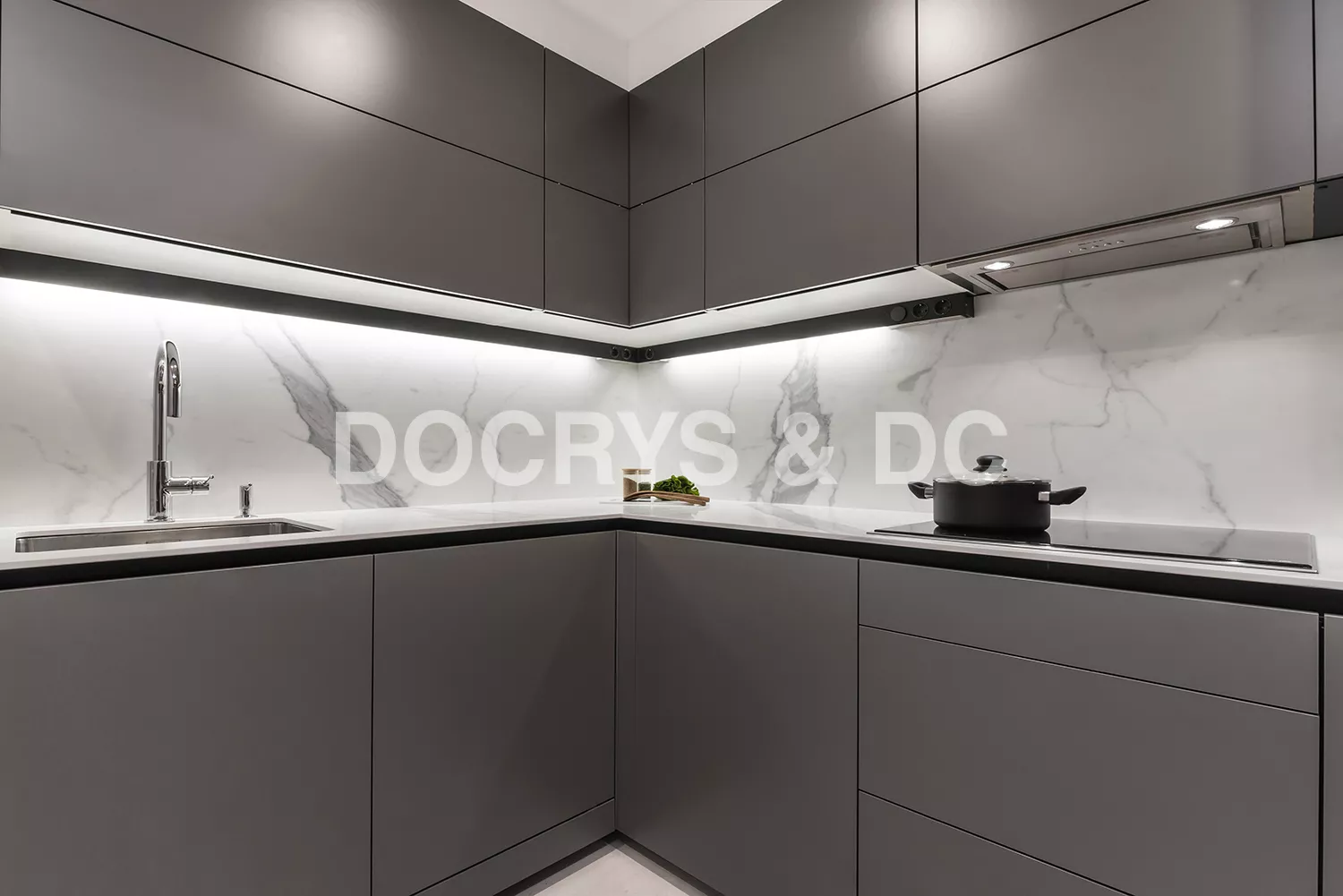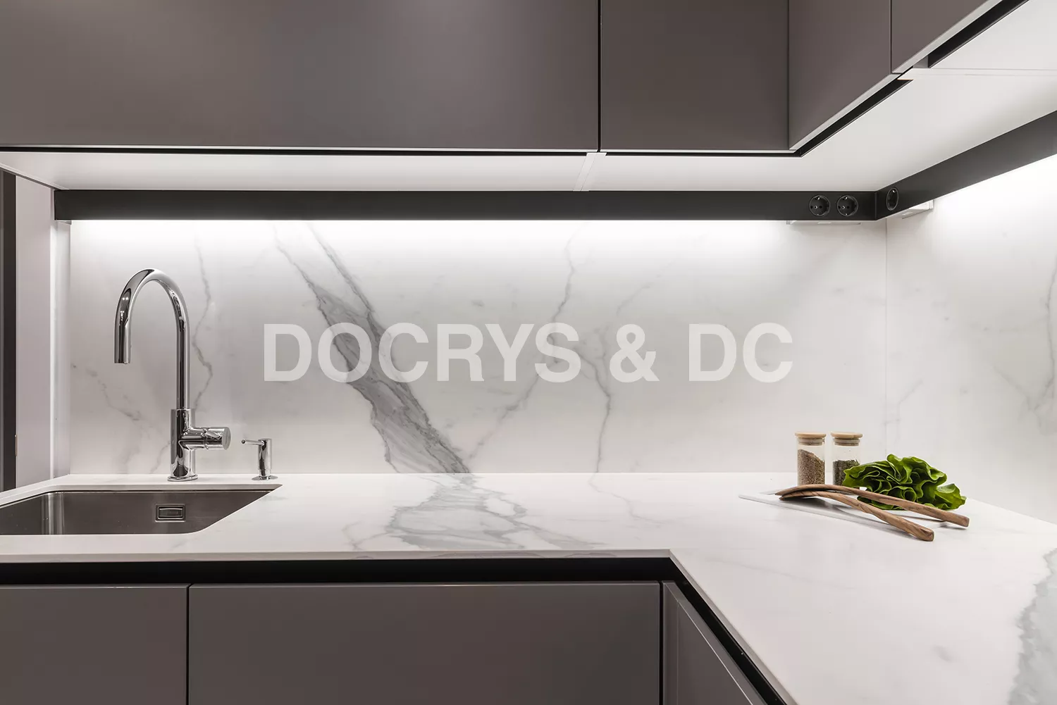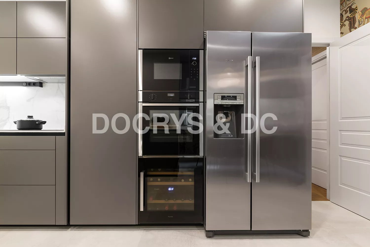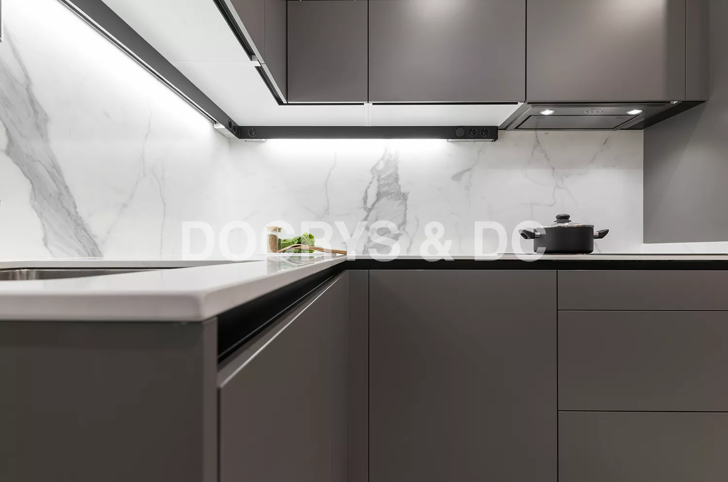 Las líneas puras y los frentes lisos, caracterizan el diseño de esta cocina.