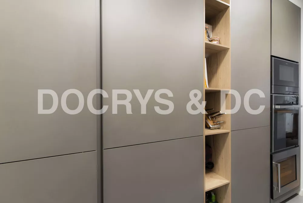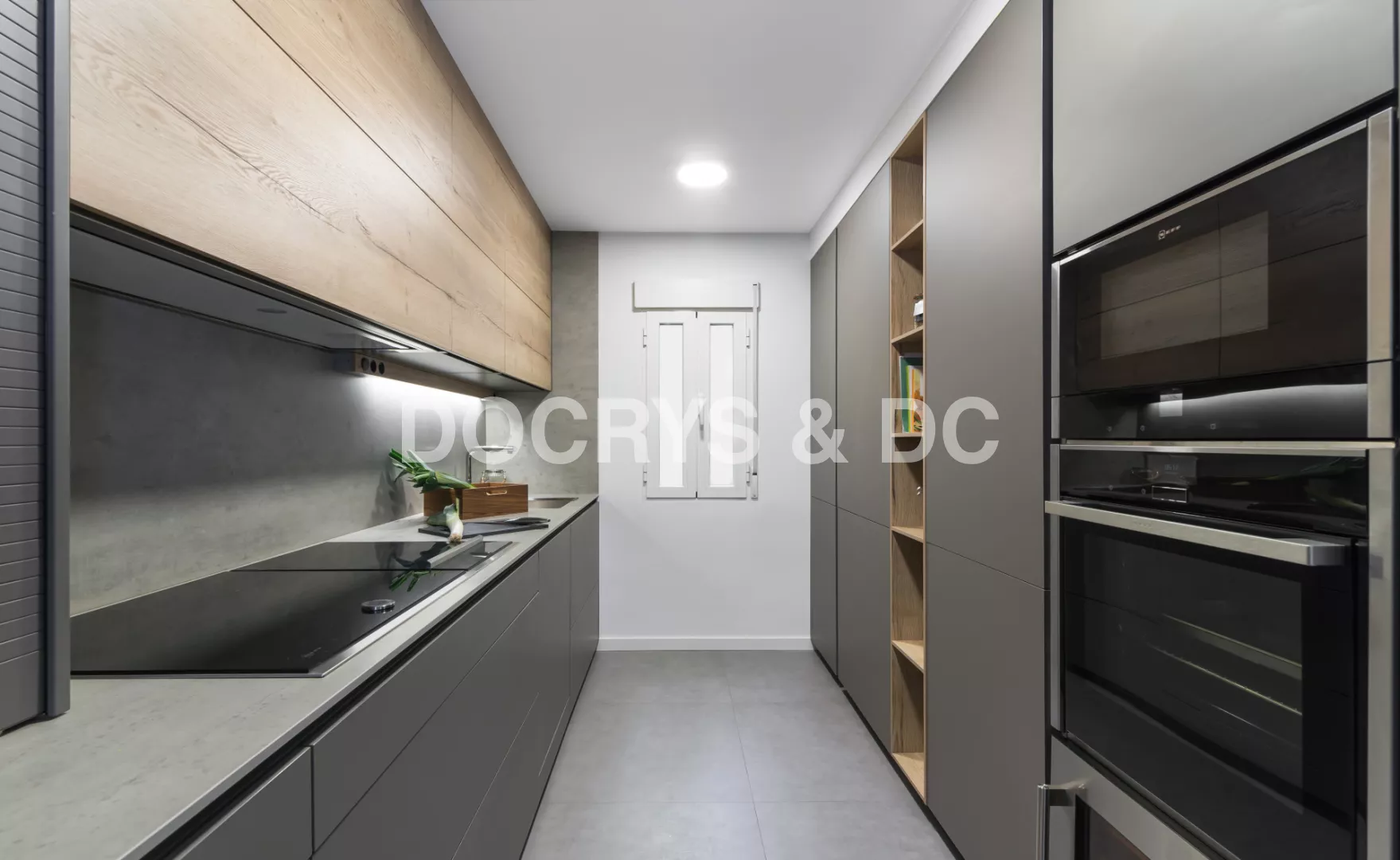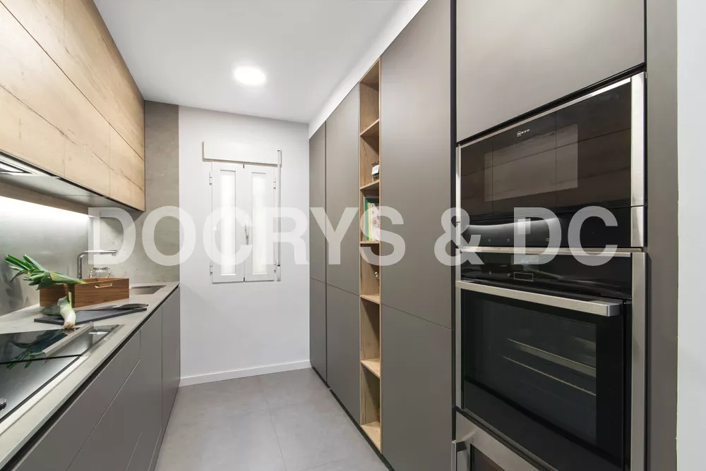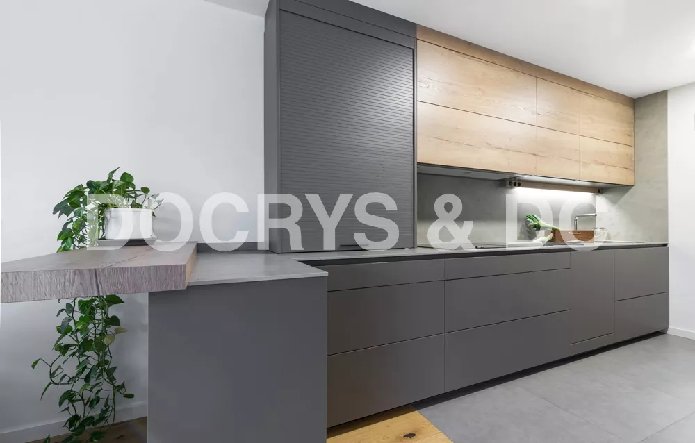 Cocina Santos en paralelo en color gris y frentes superiores en madera. Modelo Plataforma D con material laminado antihuellas en color Gris Visón LAH