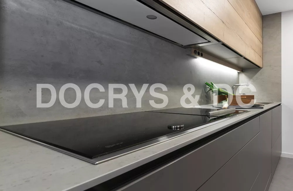 Muebles desde suelo a techo en toda la longitud de la cocina para garantizar el máximo almacenamiento. El diseño de esta cocina moderna se ha rematado con una cómoda barra de cocina en madera que da paso al salón.