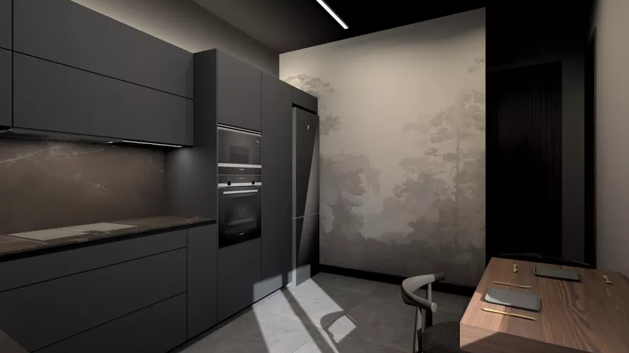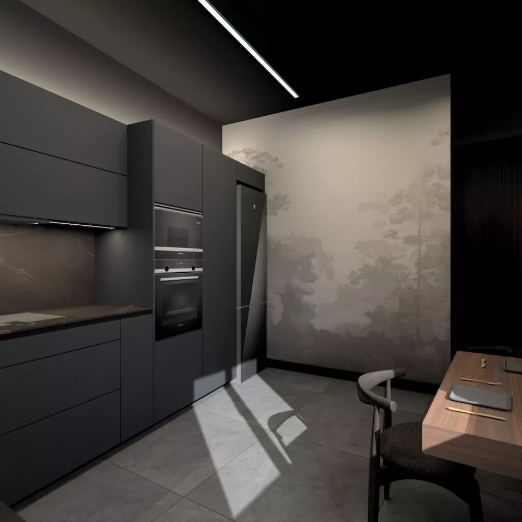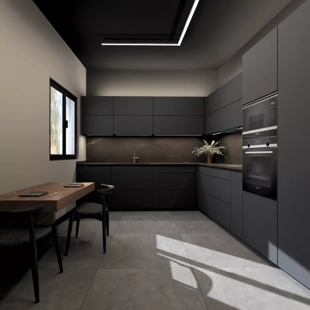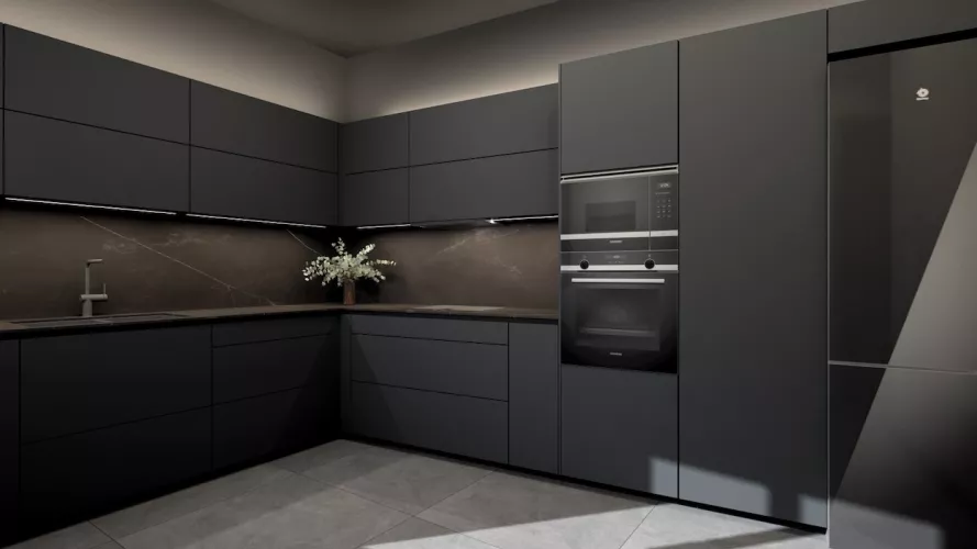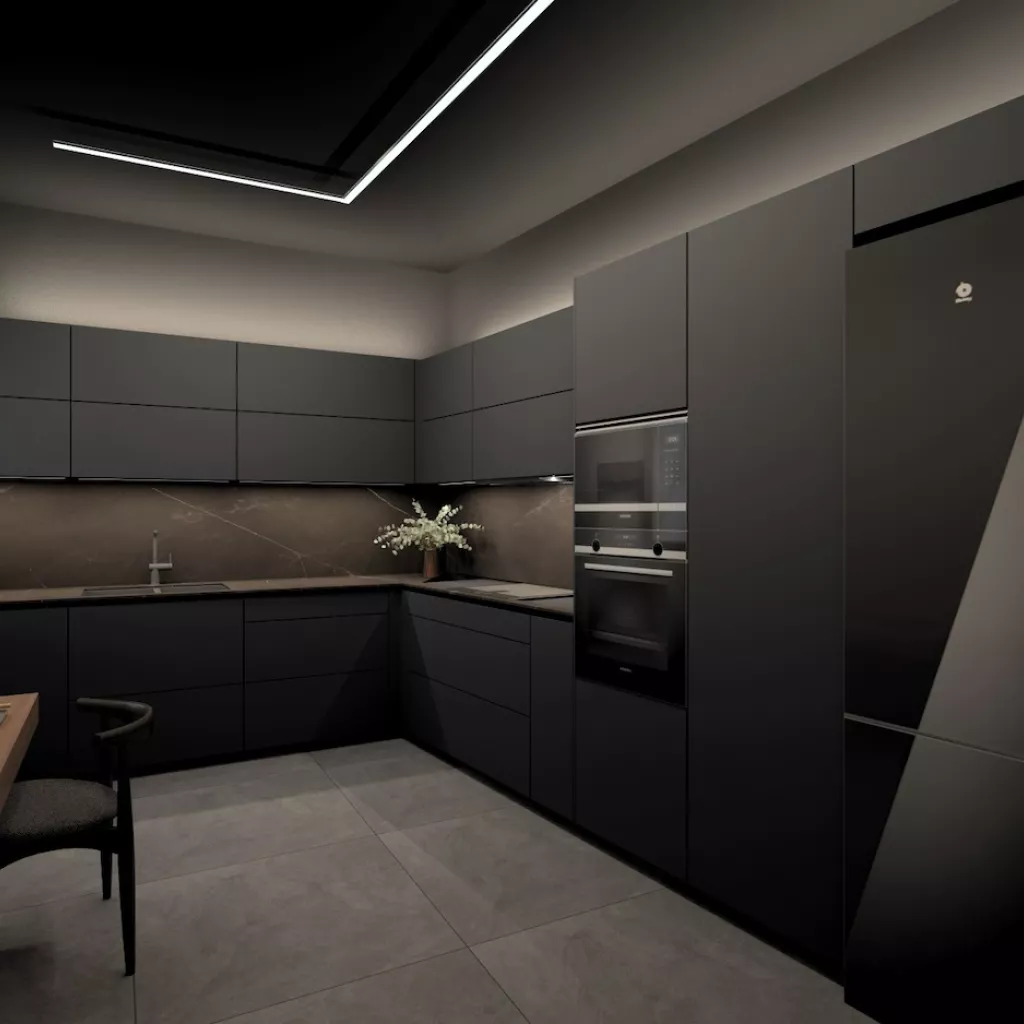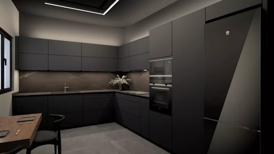 Esta cocina de diseño contemporáneo apuesta por un estilo sofisticado y vanguardista con una paleta de colores oscuros que transmiten lujo y exclusividad. Los muebles en negro mate combinados con encimeras y revestimientos en tonos piedra generan una estética refinada y elegante, mientras que la iluminación indirecta resalta las texturas y aporta un ambiente acogedor y moderno.