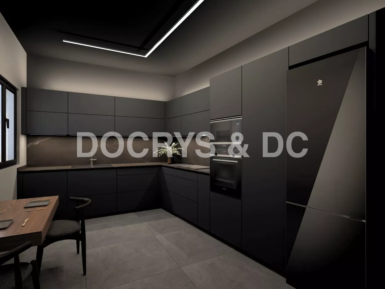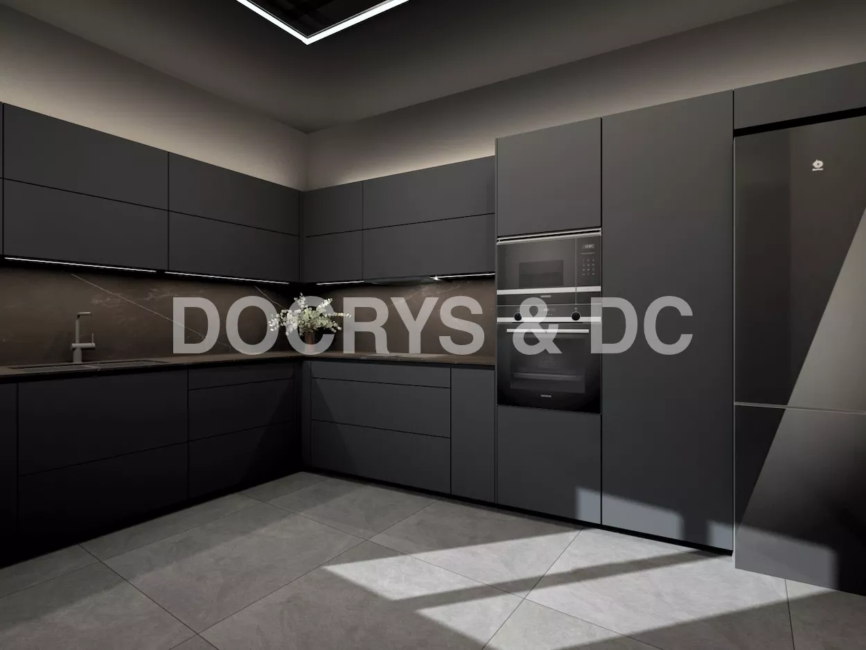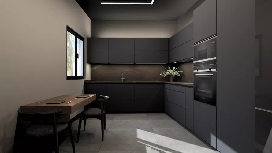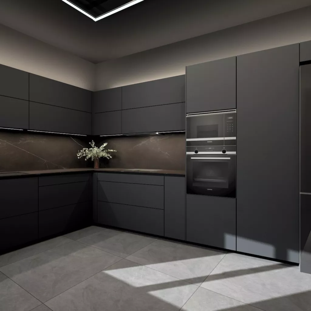 Esta cocina de diseño contemporáneo apuesta por un estilo sofisticado y vanguardista con una paleta de colores oscuros que transmiten lujo y exclusividad. Los muebles en negro mate combinados con encimeras y revestimientos en tonos piedra generan una estética refinada y elegante, mientras que la iluminación indirecta resalta las texturas y aporta un ambiente acogedor y moderno.