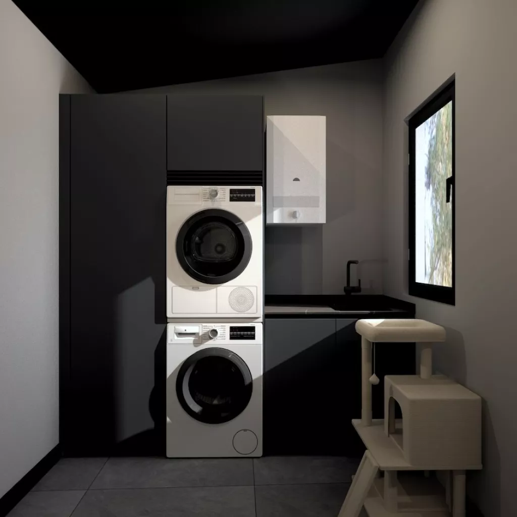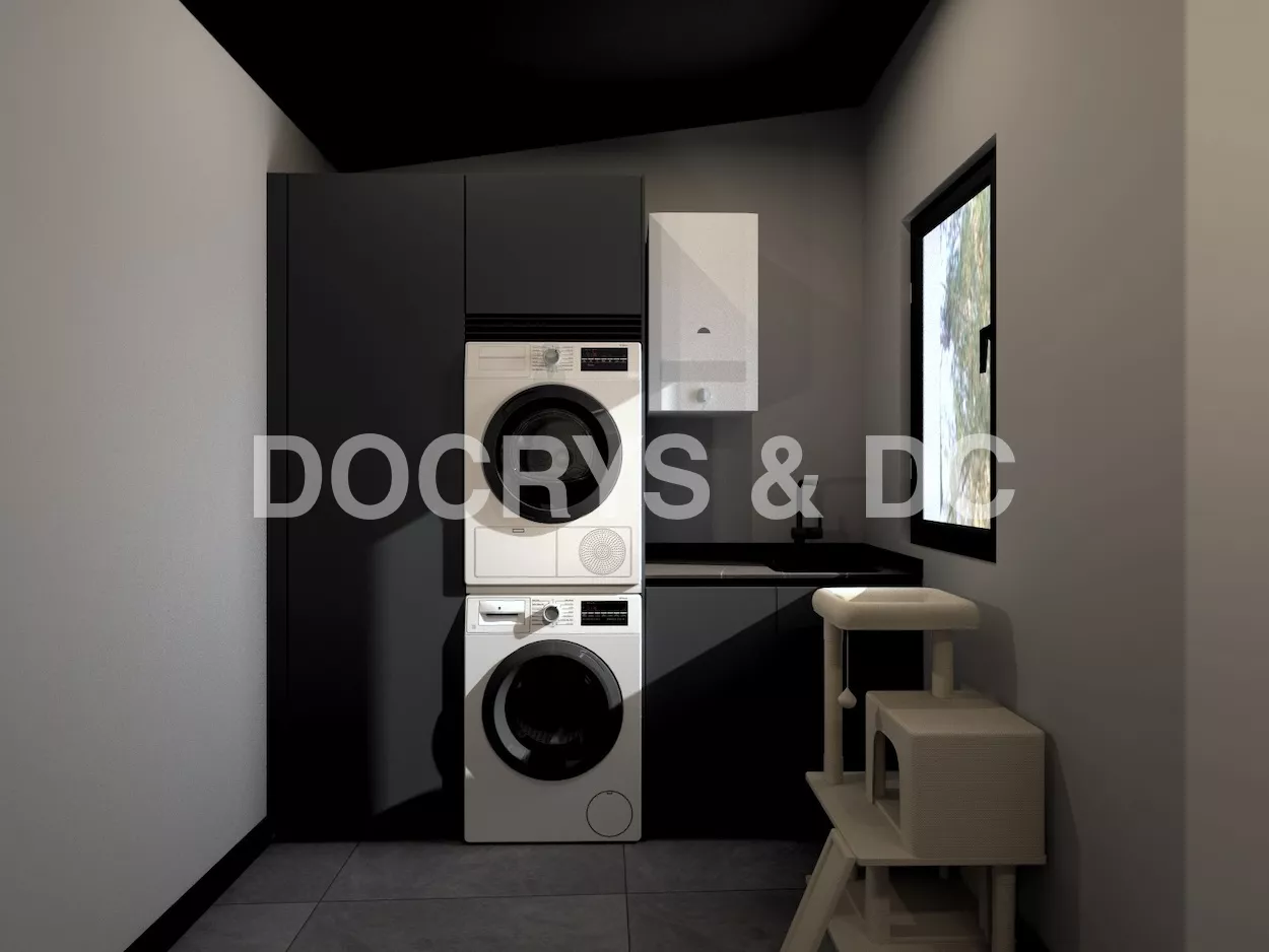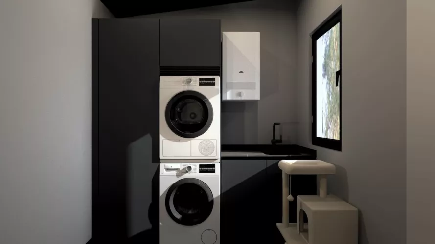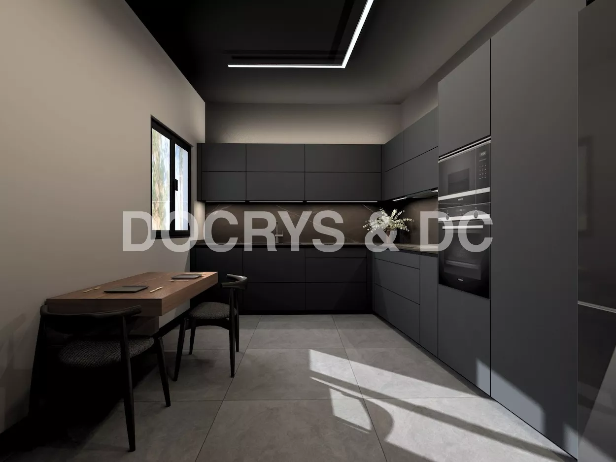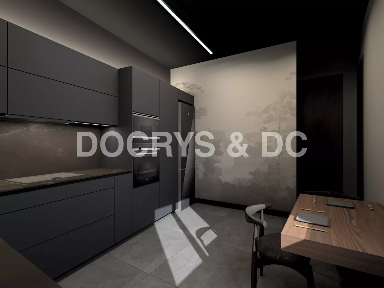 Esta cocina de diseño contemporáneo apuesta por un estilo sofisticado y vanguardista con una paleta de colores oscuros que transmiten lujo y exclusividad. Los muebles en negro mate combinados con encimeras y revestimientos en tonos piedra generan una estética refinada y elegante, mientras que la iluminación indirecta resalta las texturas y aporta un ambiente acogedor y moderno.