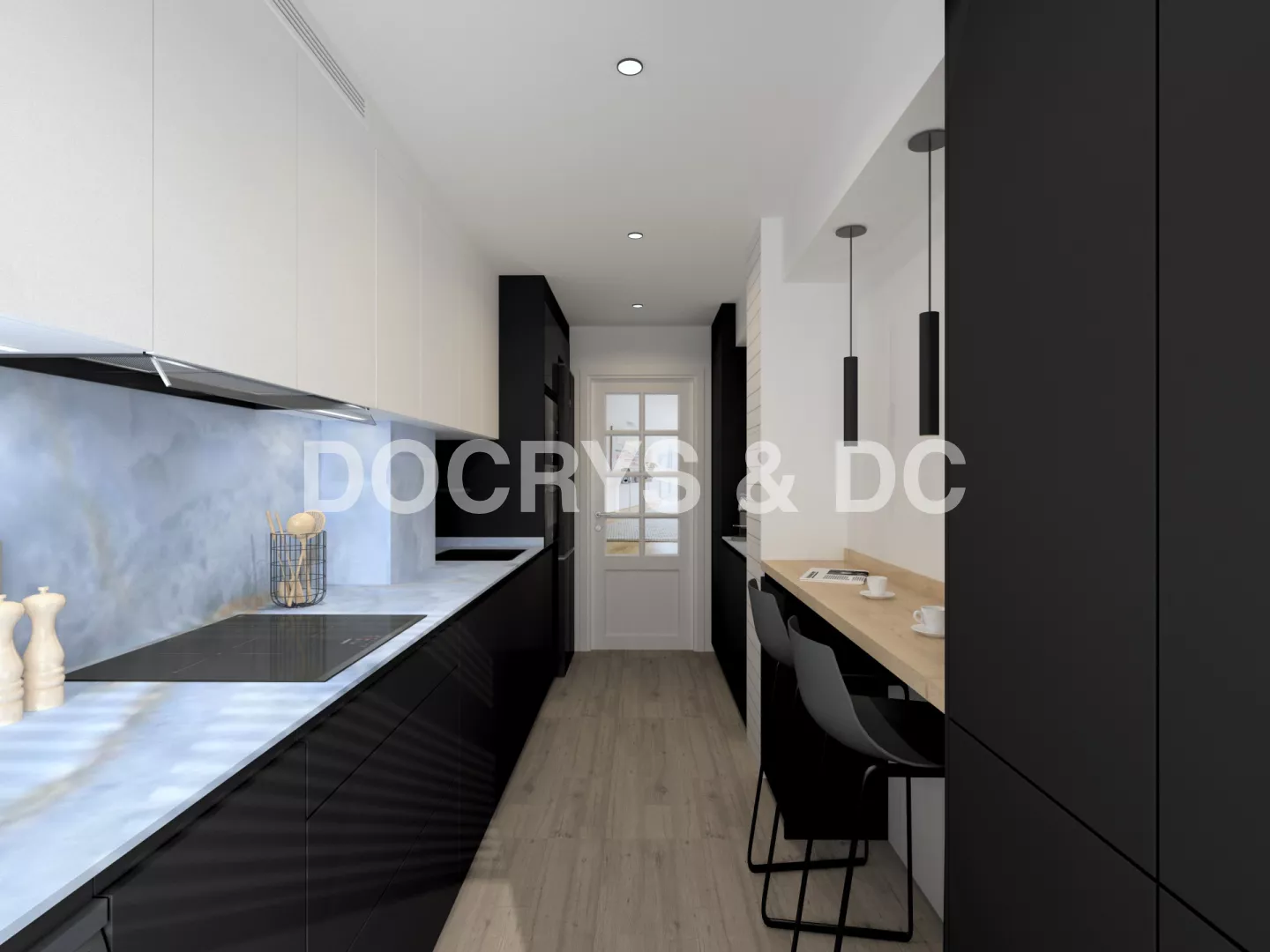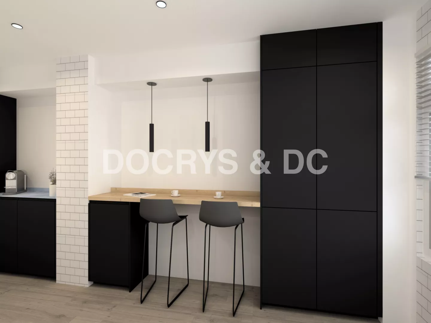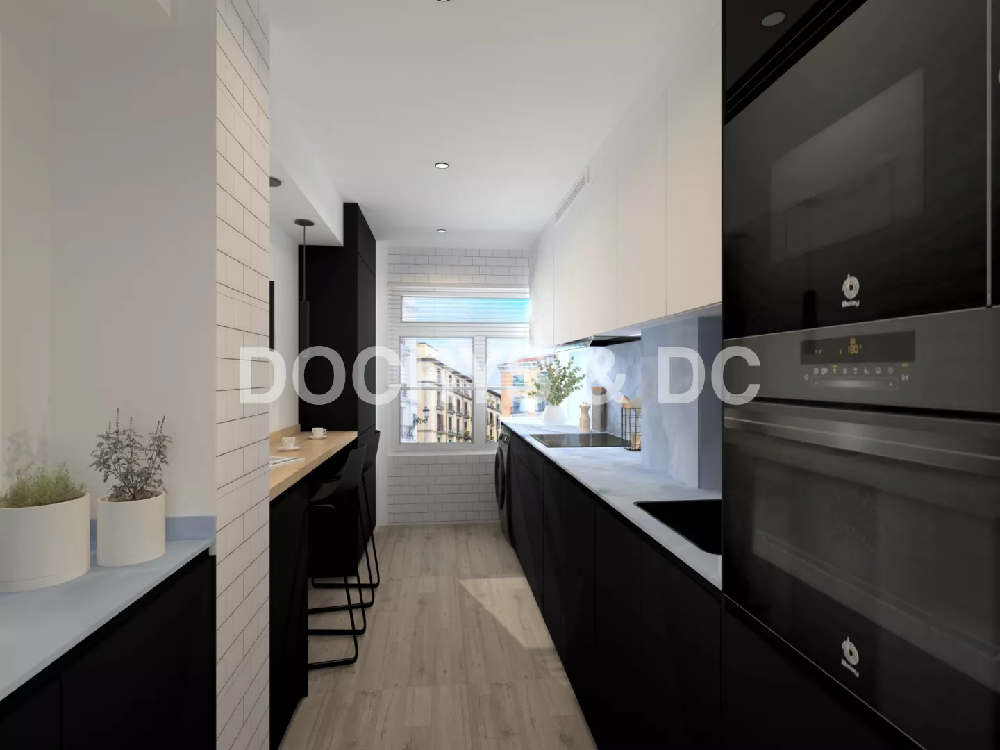 En el siguiente frente tenemos dos columnas en negro seda para aumentar el almacenaje de la cocina ya que al tener un tamaño tan reducido se aprovecha cada espacio para opptimizar al máximo el uso y que sea funcional. A continuación podemos ver una barra de madera, la cual aporta calidez a la cocina contrastando con el estilo moderno. En esta puden realizarse comidas y reuniones informales. Y para finalizar con el frente tenemos unos bajos también en negro seda ampliando aún más la zona de almacenaje.