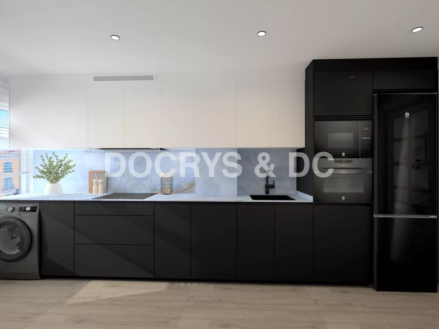 En el primer frente podemos observar la lavadora encastrada también en color negro para continuar en la misma línea y que se integre bien en el frente. A continuación podemos ver la vitrocerámica y la campana extractora integrada sobre unos cajones Santos donde poder almacenar todo tipo de utensilios o menaje.