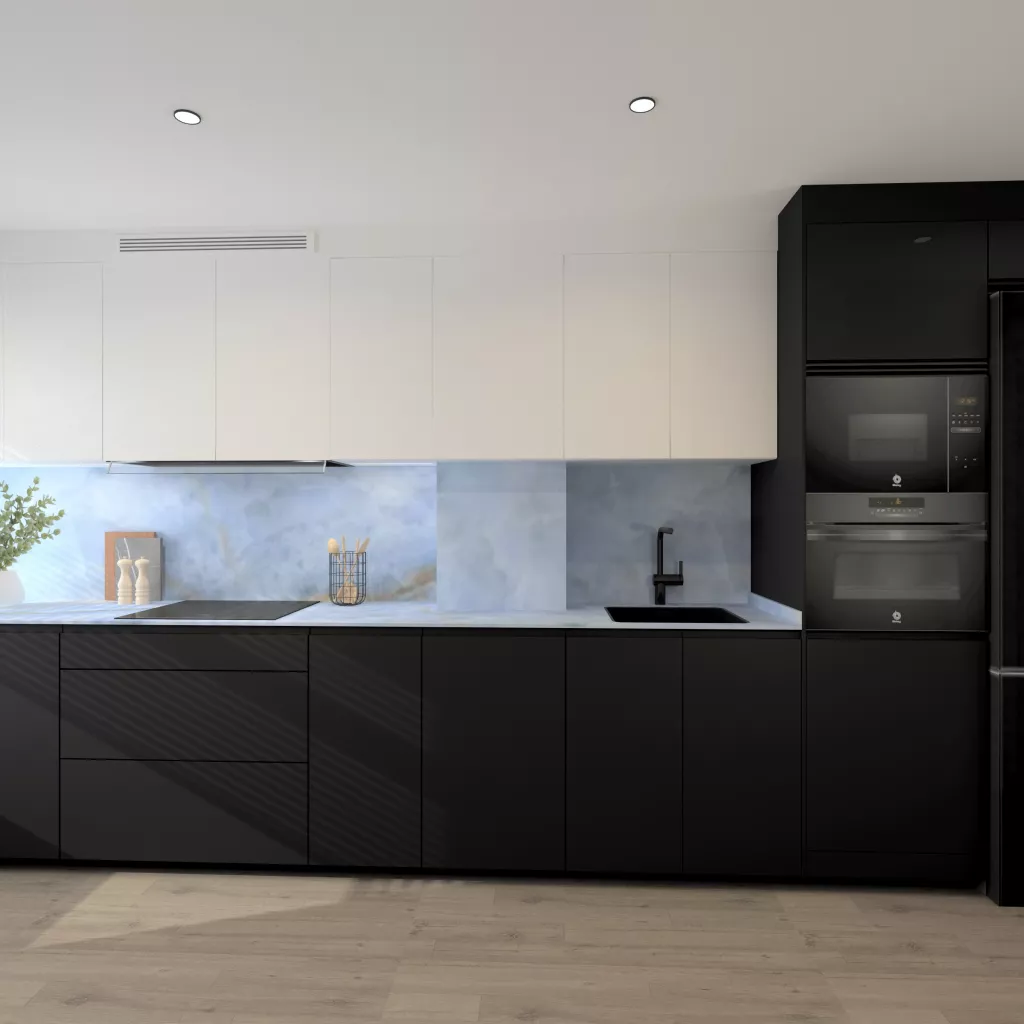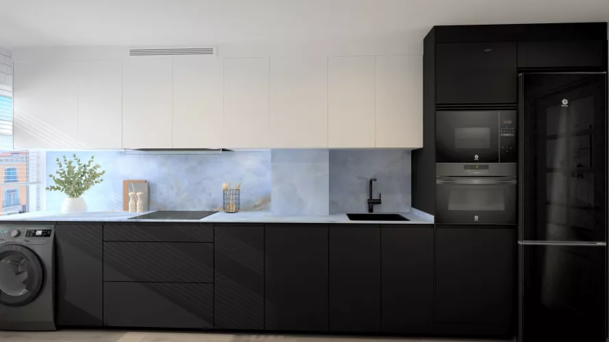Más adelante tenemos el fregero con grifería Veravent también en negro contrastando con los altos en Blanco Innsbruck y el casco y encimera en onice blue. A continuación en este mismo frente podemos ver los electrodomésticos, todos de la marca Balay, en una misma columna tenemos el microondas, horno y el lavavajillas panelado para mantenerlo oculto dentro del mueble. Por último tenemos frigorífico y congelador también en negro manteniendo la sofisticada estética.