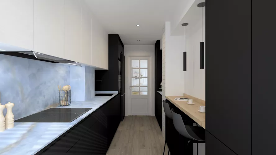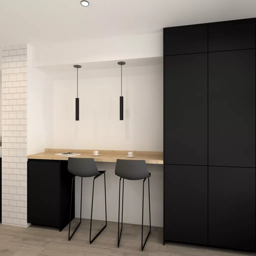 En cuánto a la iluminación tenemos focos encastrados en el techo en tono neutro (4000K) y dos lámparas de colgar en la zona del mesado para aportar luz focal en la zona de comida.