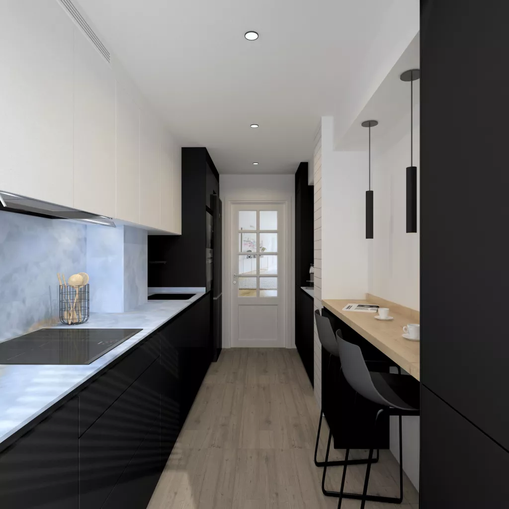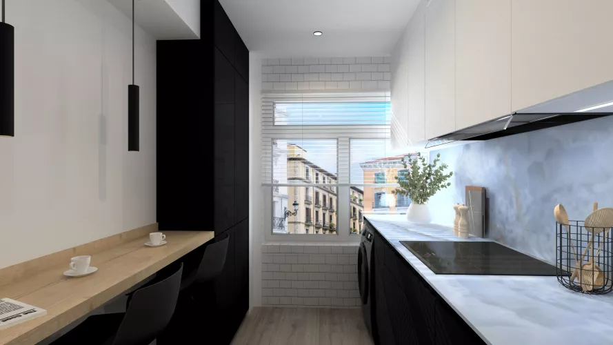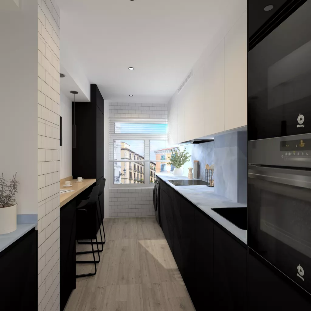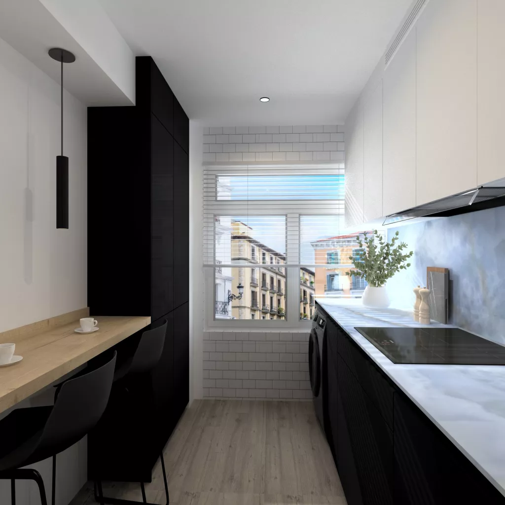 En conjunto, esta cocina es muy funcional y aprovecha al máximo el espacio, tiene un estilo moderno muy bien contrastado con elementos cálidos que hacen de la cocina un lugar acogedor.