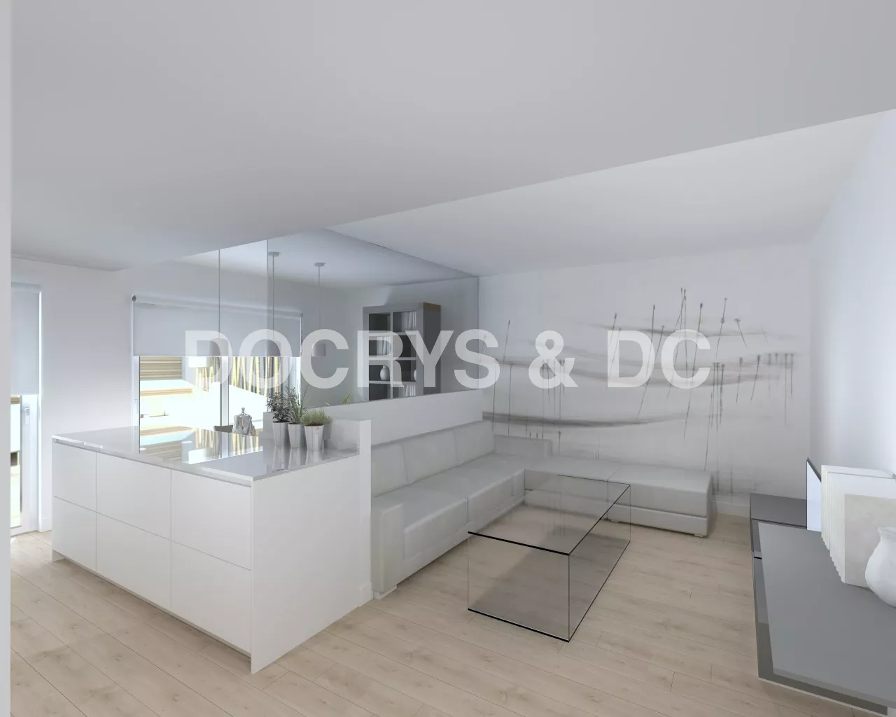 Cocina Santos: plataforma E gola superior y apertura mecánizada. Estratificado Blanco Insbruck. Altos laminados Roble Rústico.