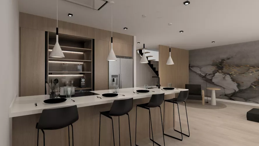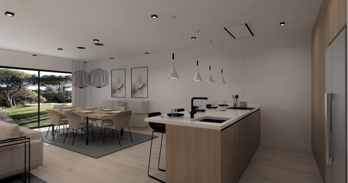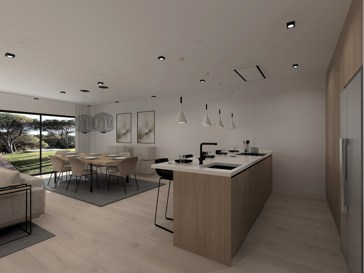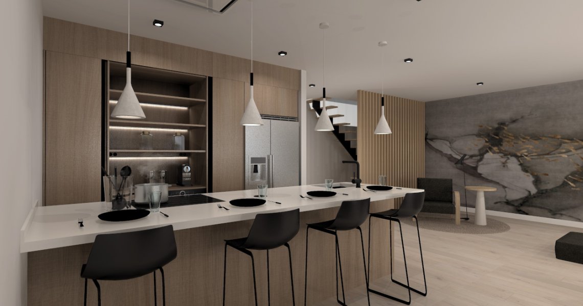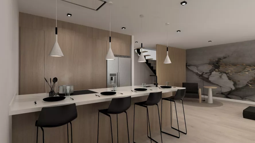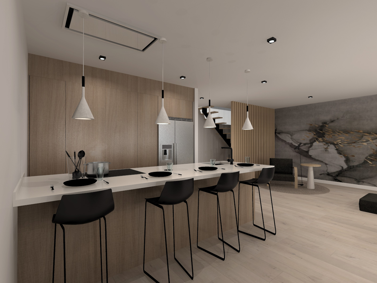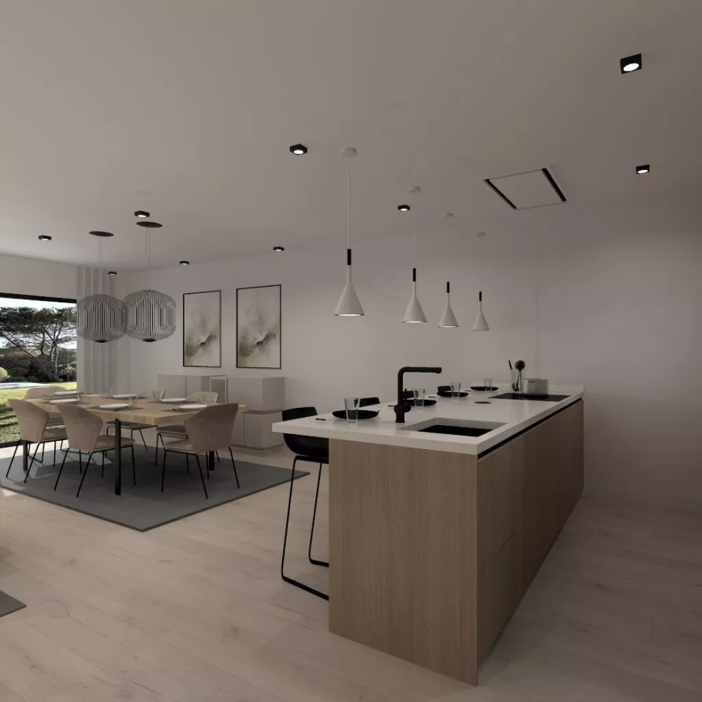 Esta cocina abierta al salón de color roble kairos, se integra perfectamente con el resto de la zona baja de la vivienda creando un espacio funcional y práctico.