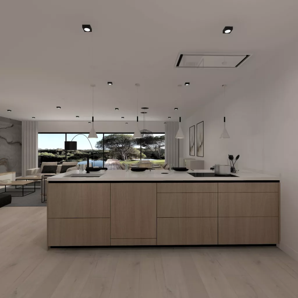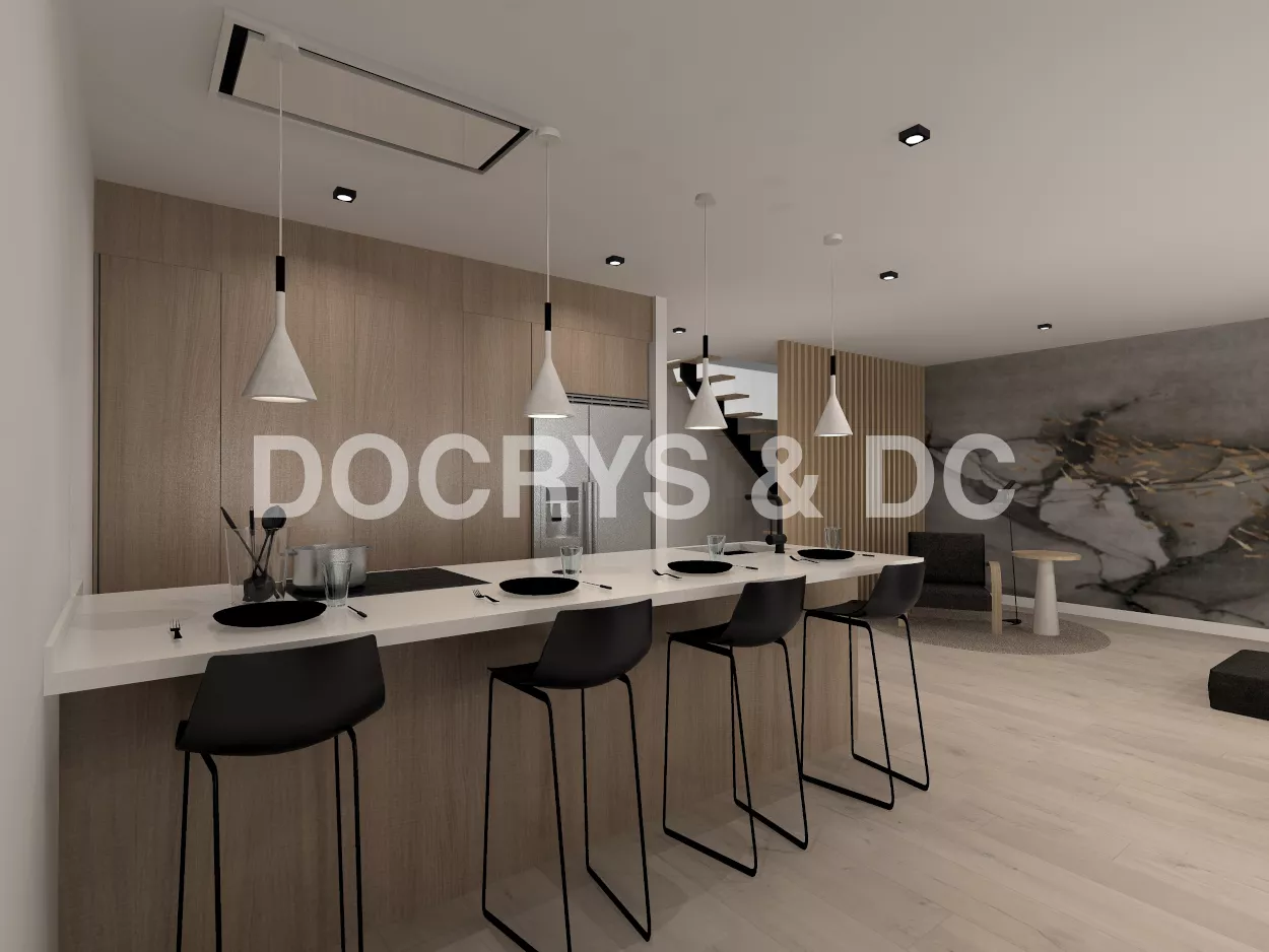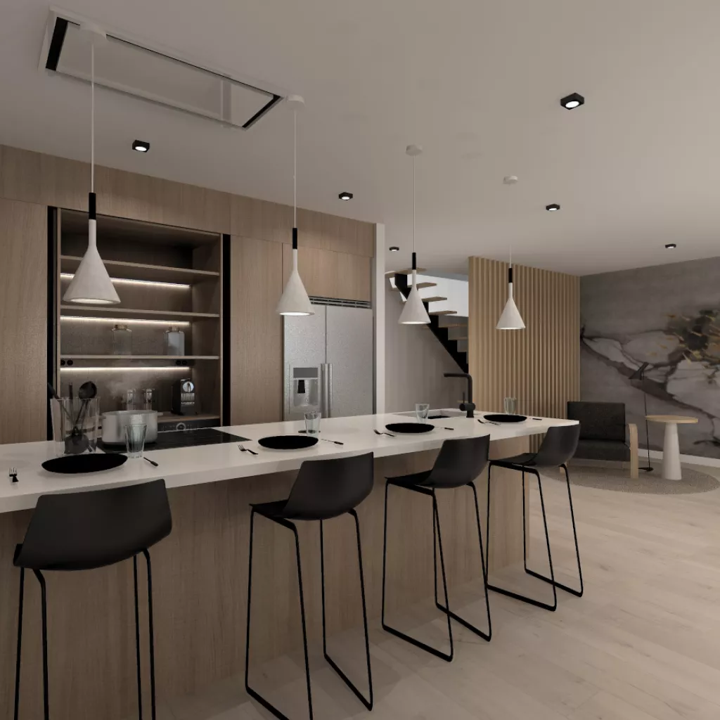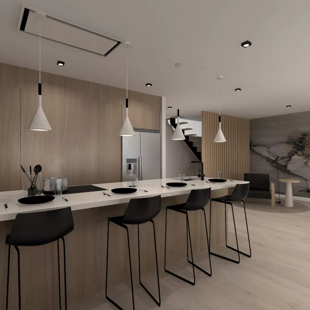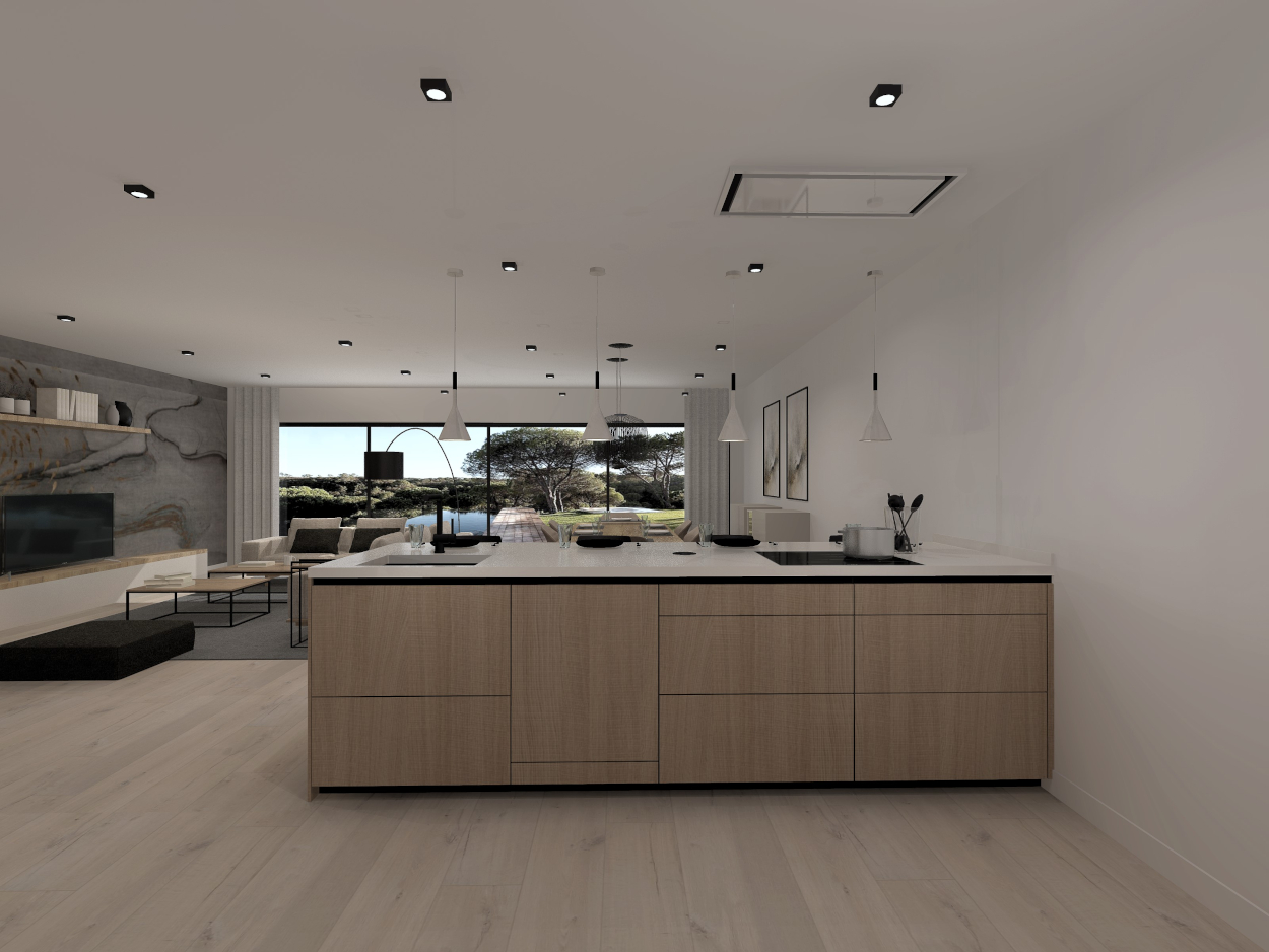 Esta cocina abierta al salón de color roble kairos, se integra perfectamente con el resto de la zona baja de la vivienda creando un espacio funcional y práctico.