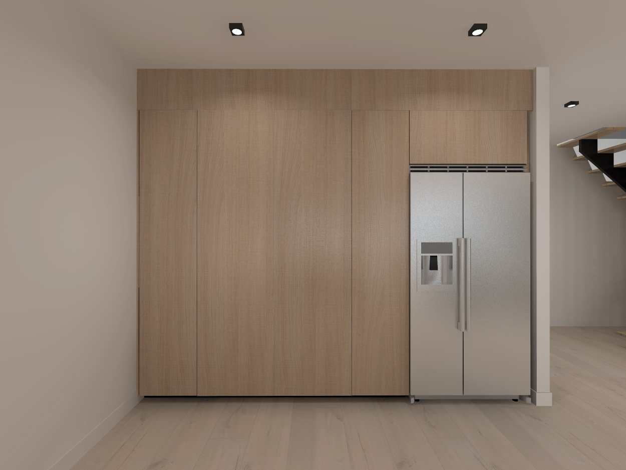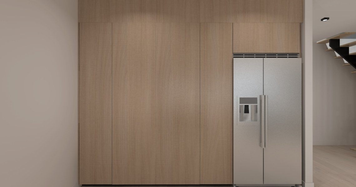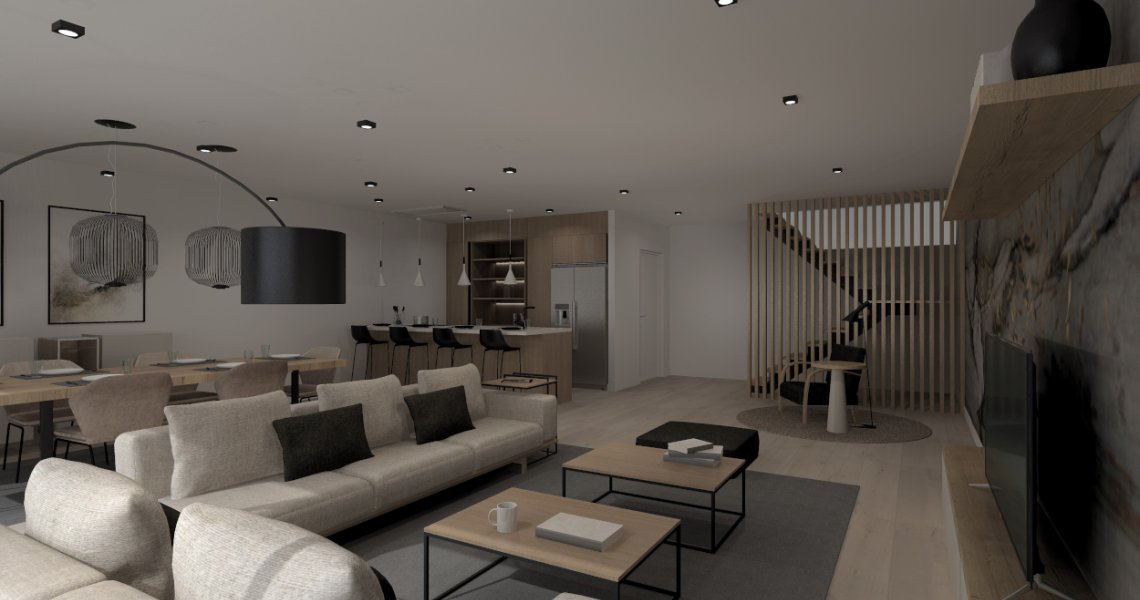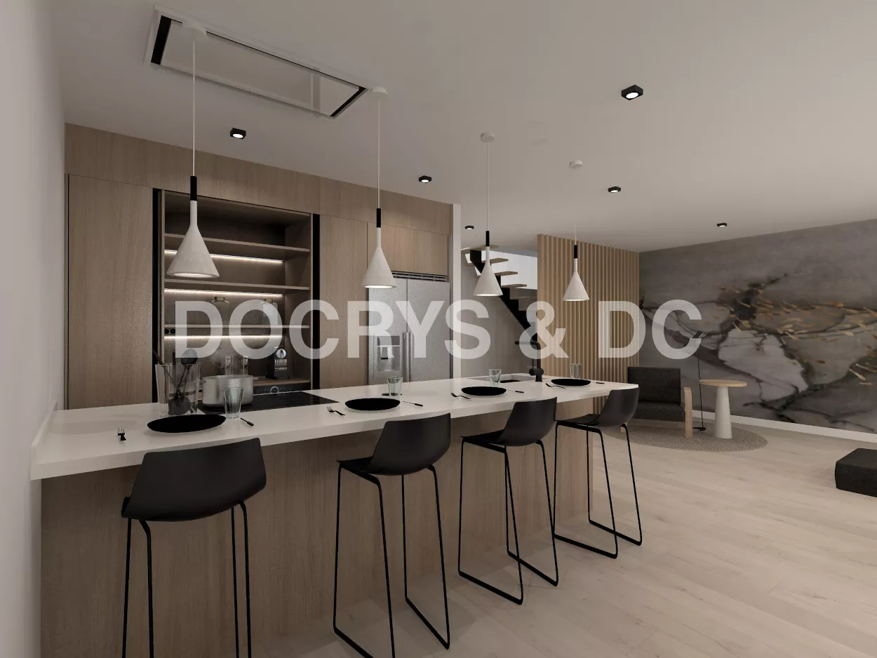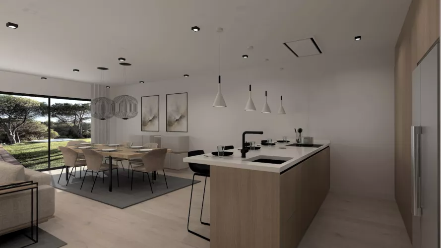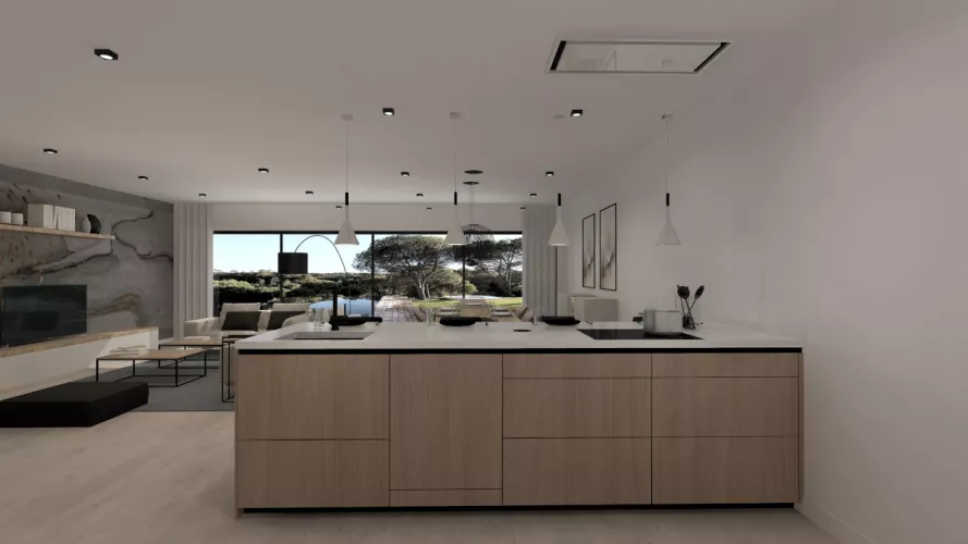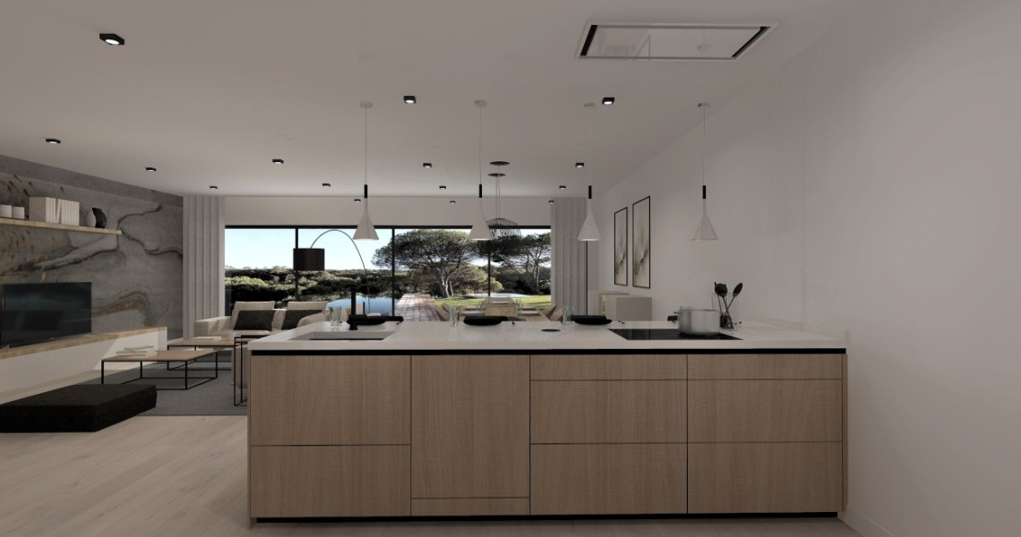 Esta cocina abierta al salón de color roble kairos, se integra perfectamente con el resto de la zona baja de la vivienda creando un espacio funcional y práctico.