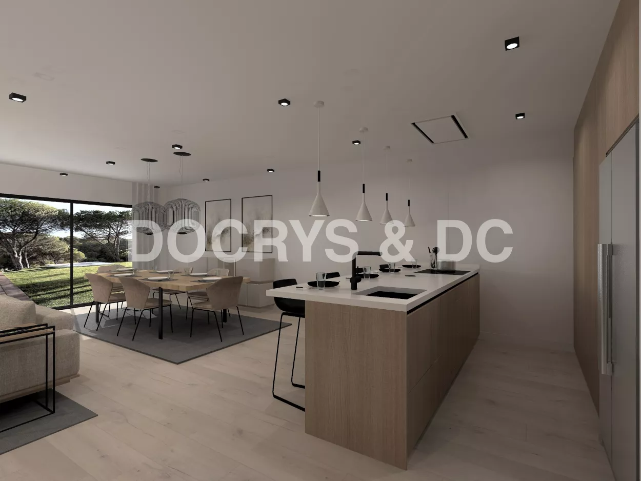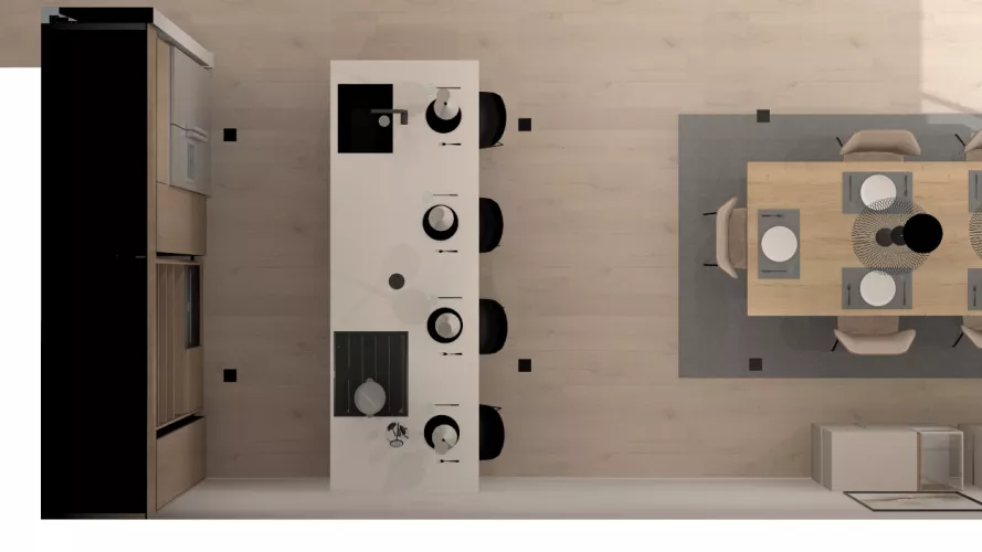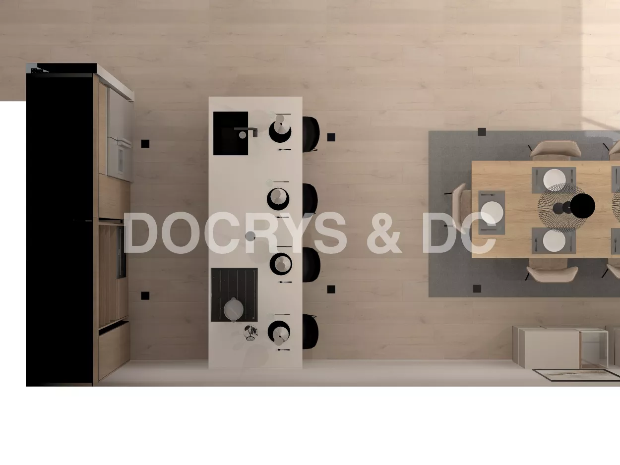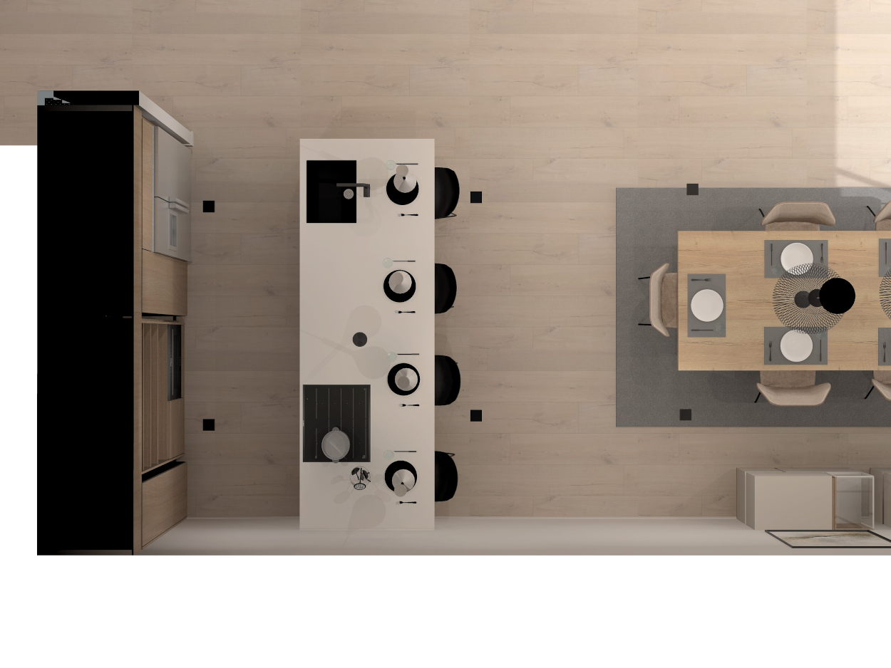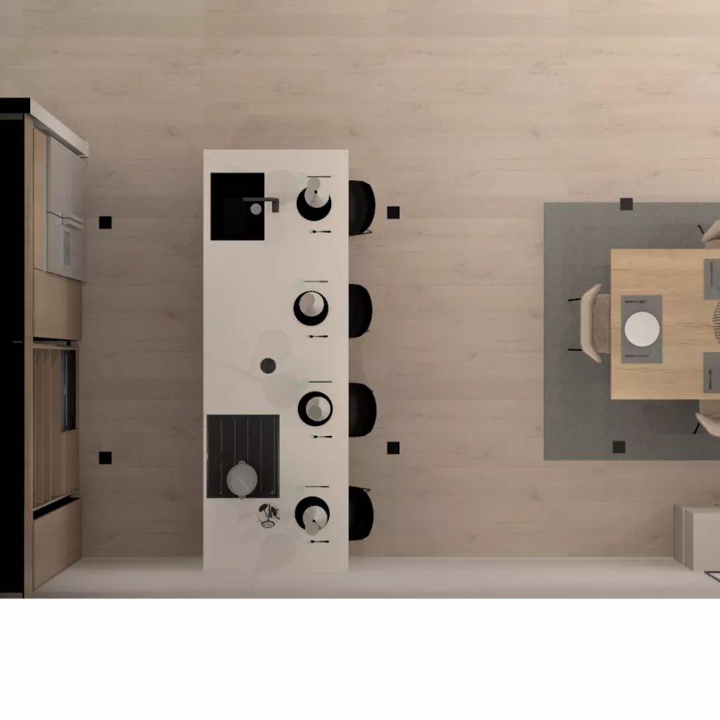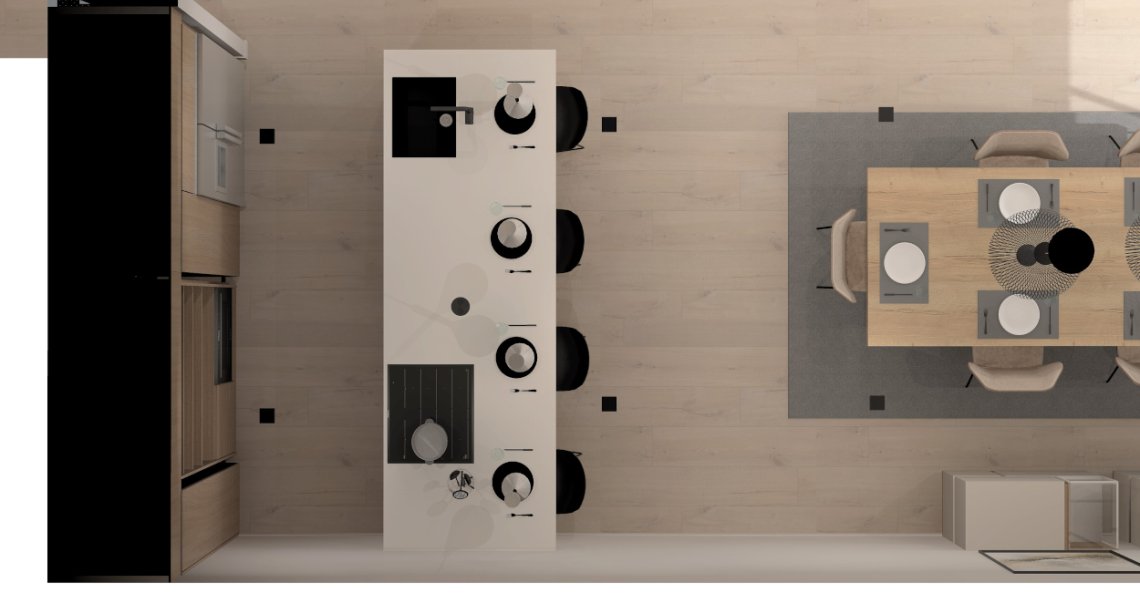 El diseño de esta cocina se compone de una peninsula ideal para zona de trabajo, la zona del fregadero y los fuegos, aparte de disponer de suficiente espacio para comer. Esta cocina tiene diferentes módulos, como muebles bajos, muebles altos y múltiples soluciones de almacenaje.