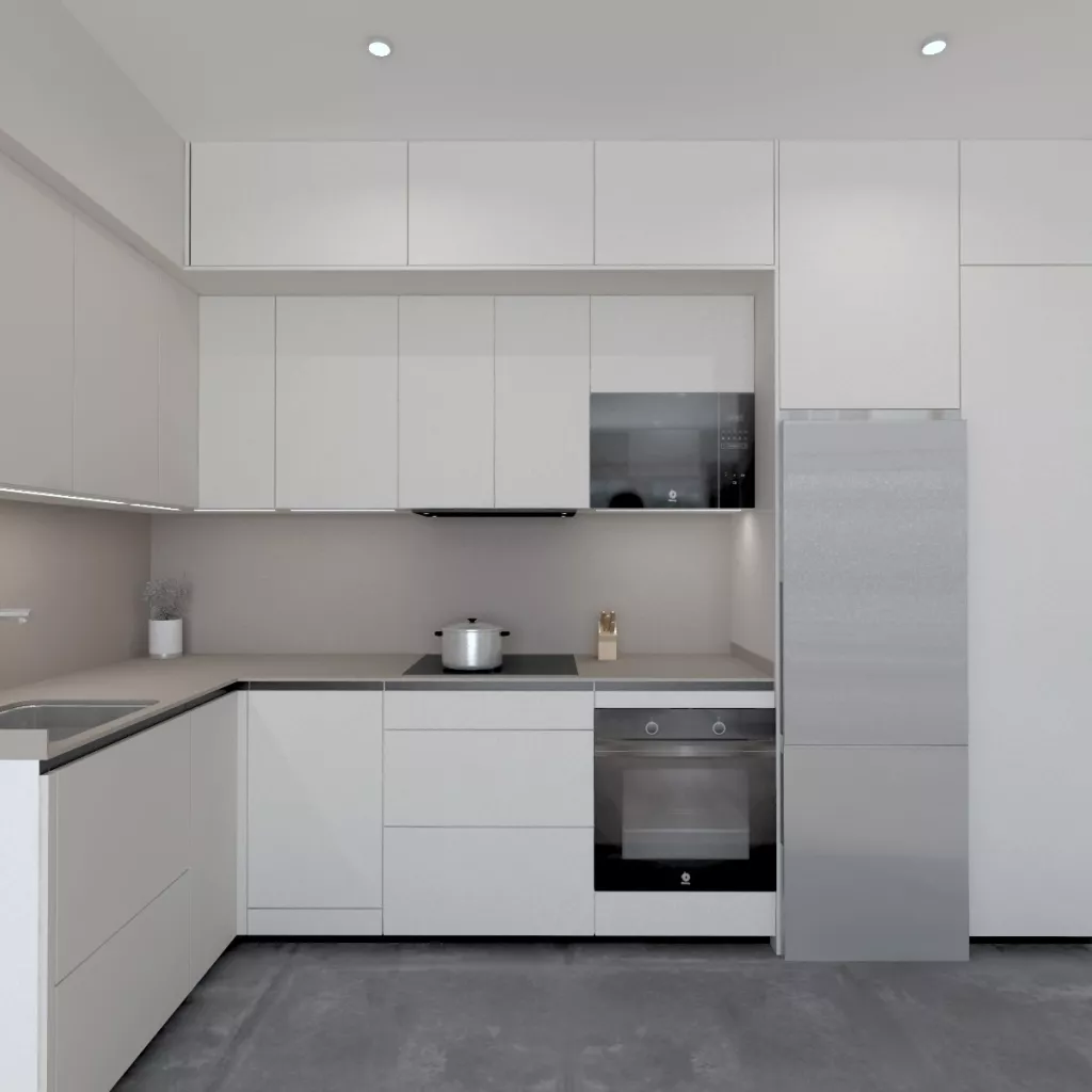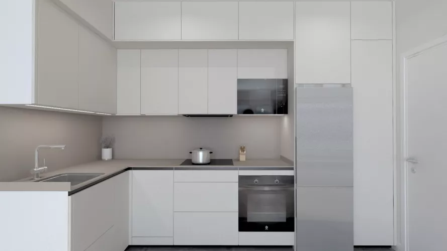 Cocina Santos en color Blanco perla con material estratificado y encimera de Lapitec, color Avana, acabado satin.