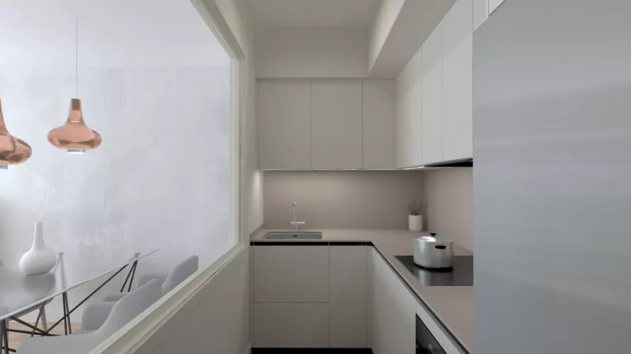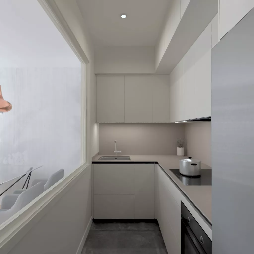 El diseño de esta cocina cuenta con una pared con un gran ventanal que da hacia el salón, lo que hace de esta cocina, un espacio con mucha iluminación y sensación de amplitud.