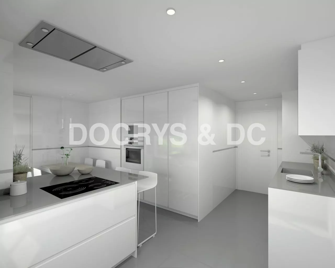 Cocina Santos Aravaca | Modelo Line E13 Estratificado Brillo Blanco Ártico | Encimera Silestone Cemento SPA