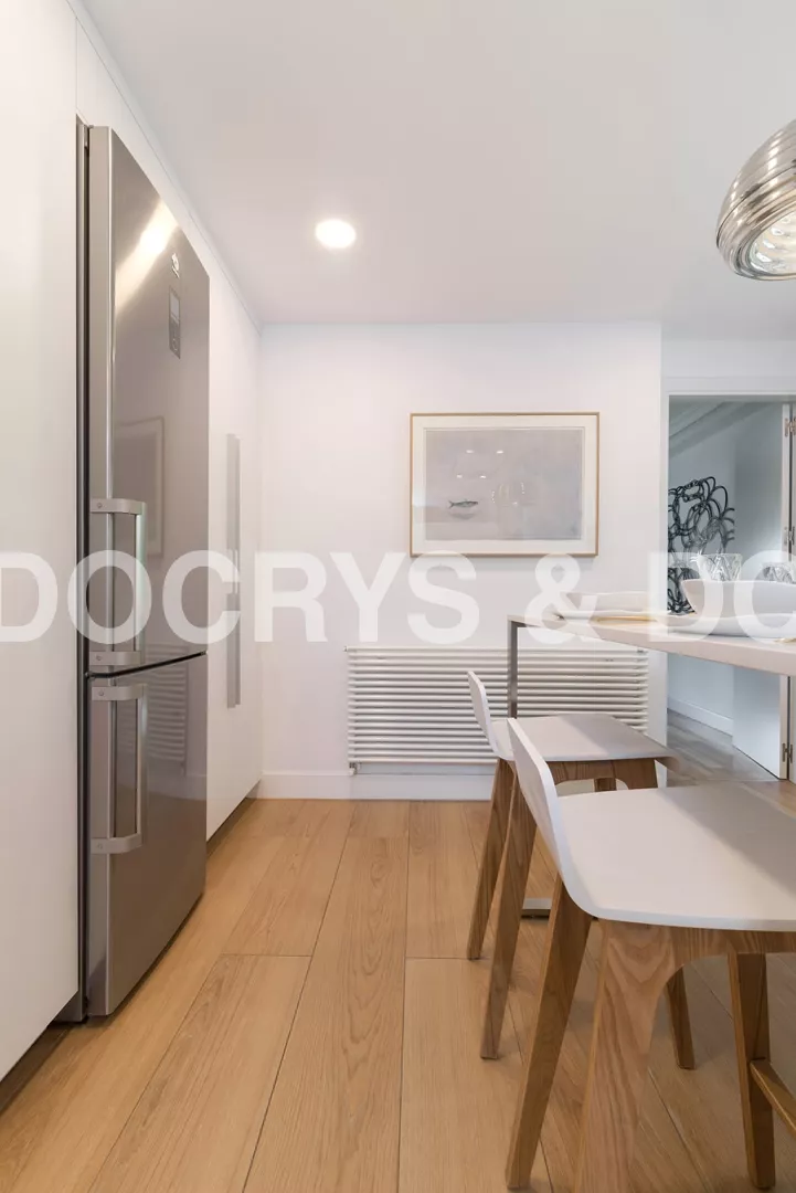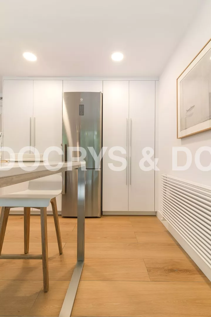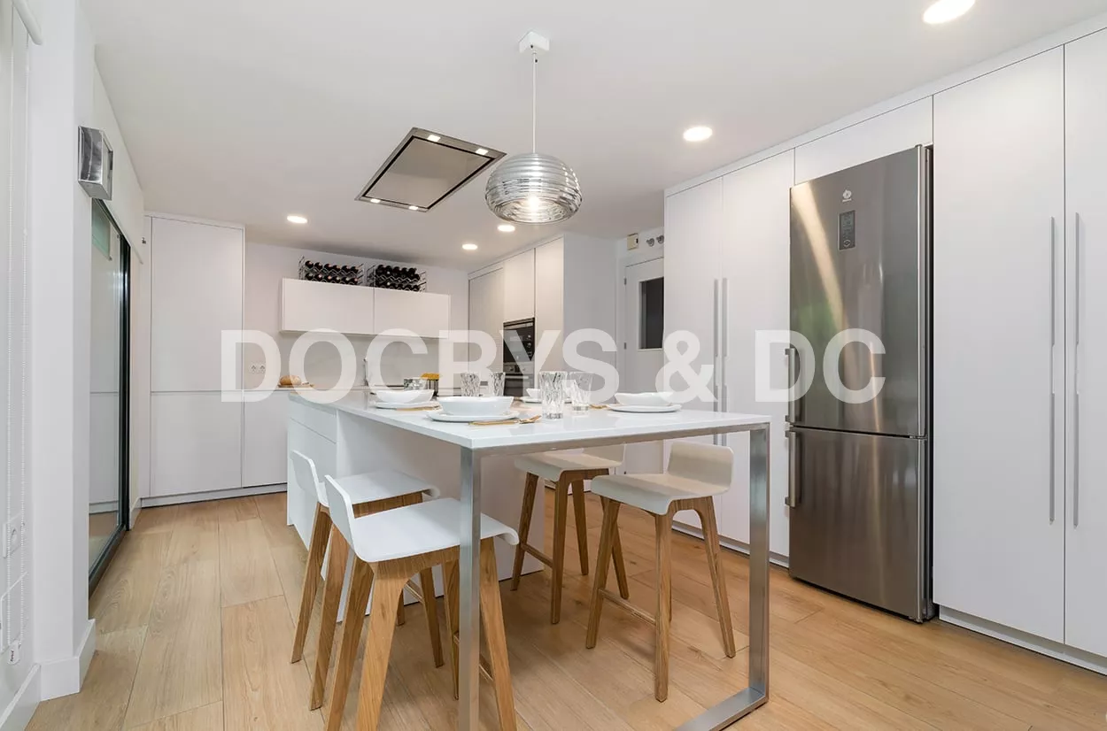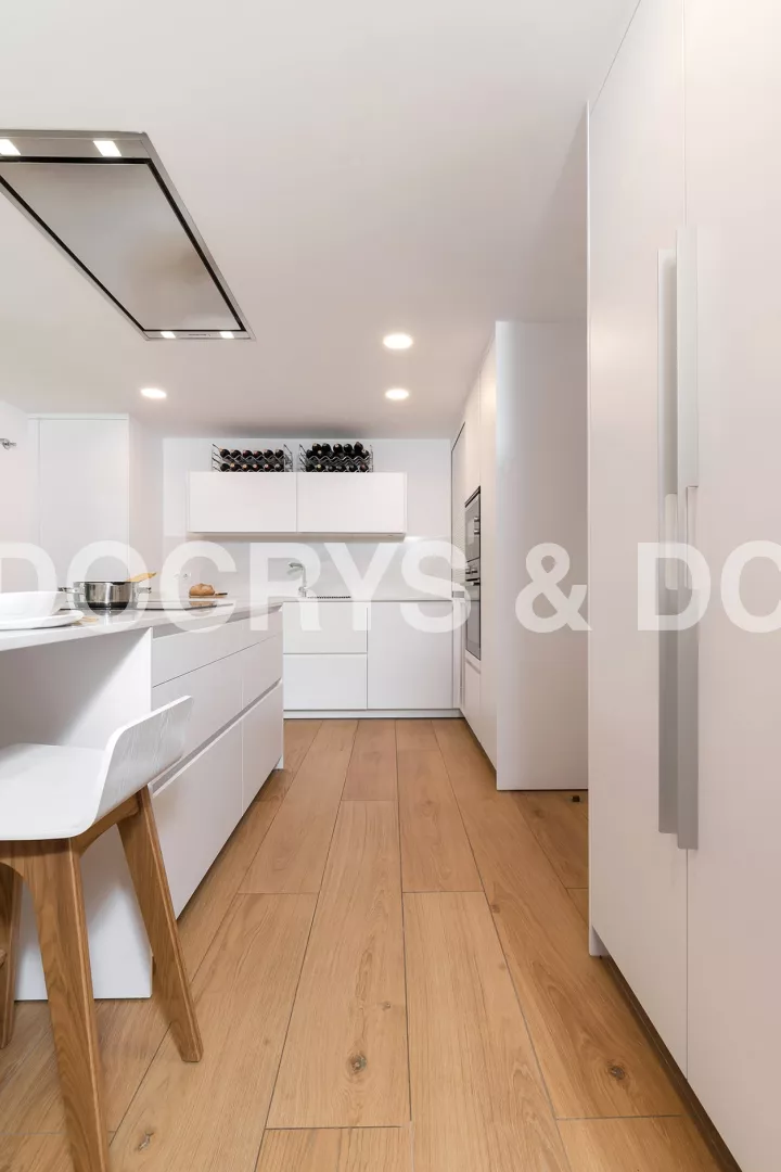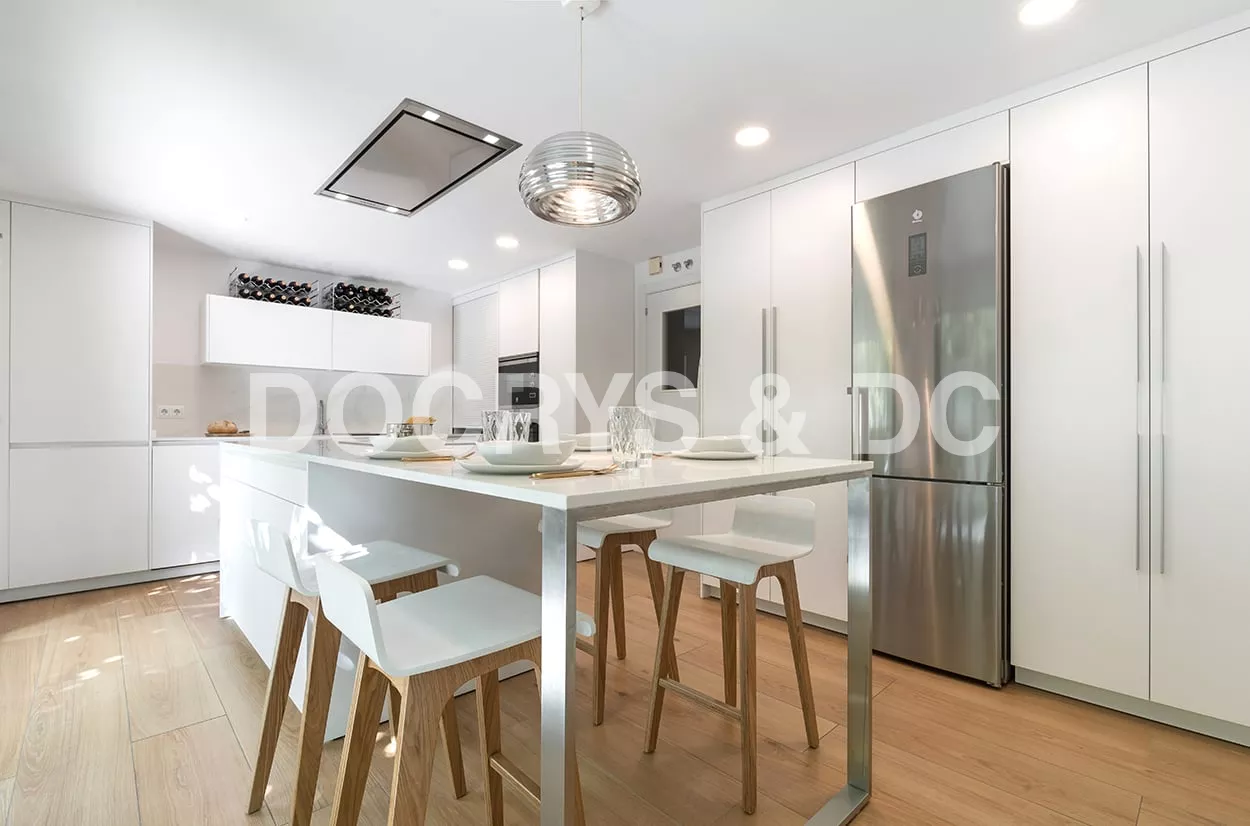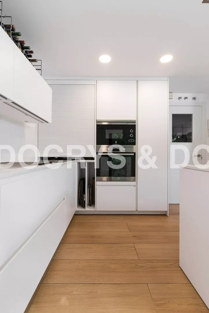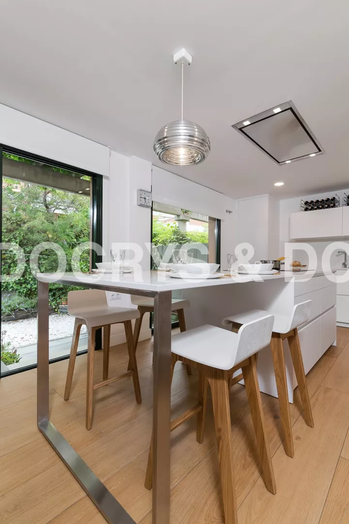 En el diseño de esta cocina Santos, hemos optado por un mobiliario con líneas puras y sencillas que se fusionan con naturalidad con el resto de la vivienda.