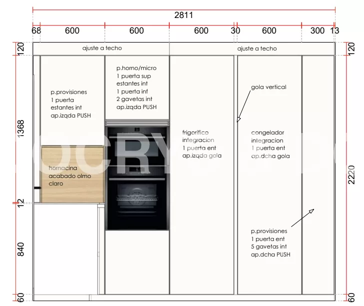 El otro frente, lo componen varias columnas, donde se integran los grandes electrodomésticos, además de una gran zona de almacenaje.