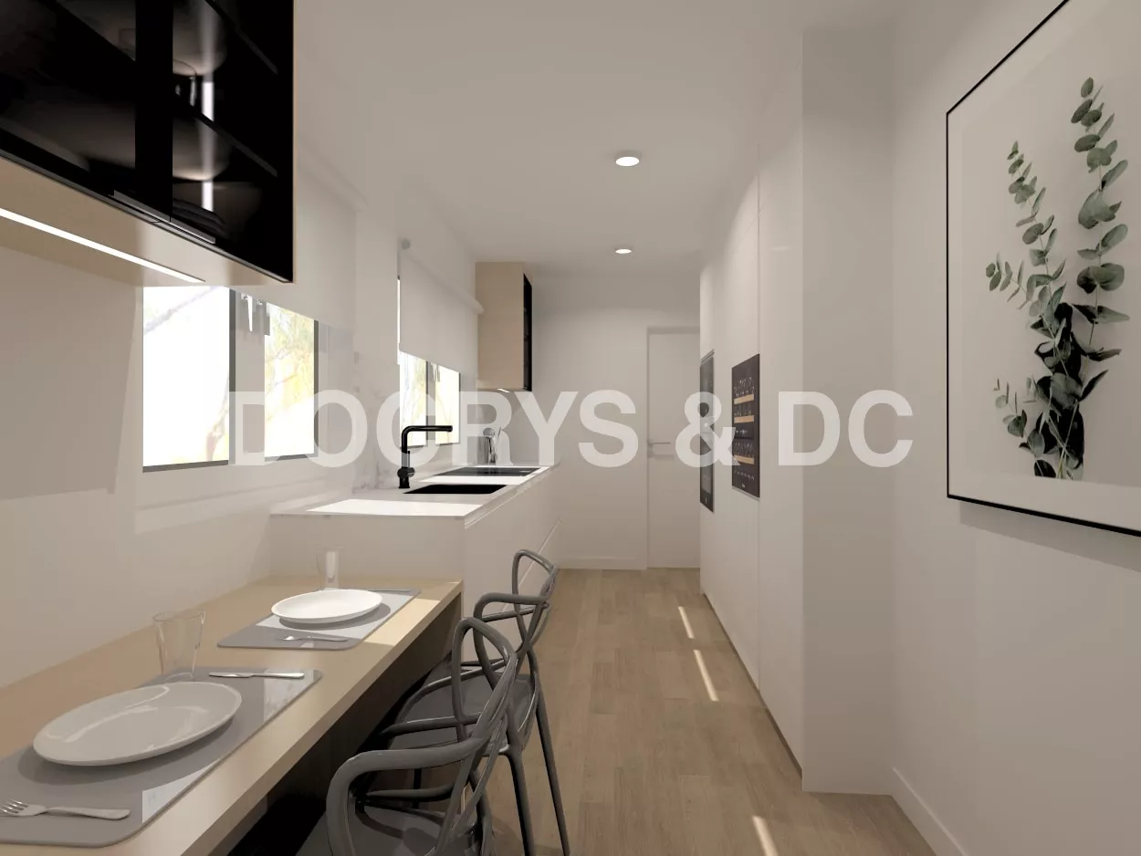 En el frente está ubicada la zona de aguas y la zona de cocción, además de una extensión de la cocina formando una mesa de office para dos comensales.