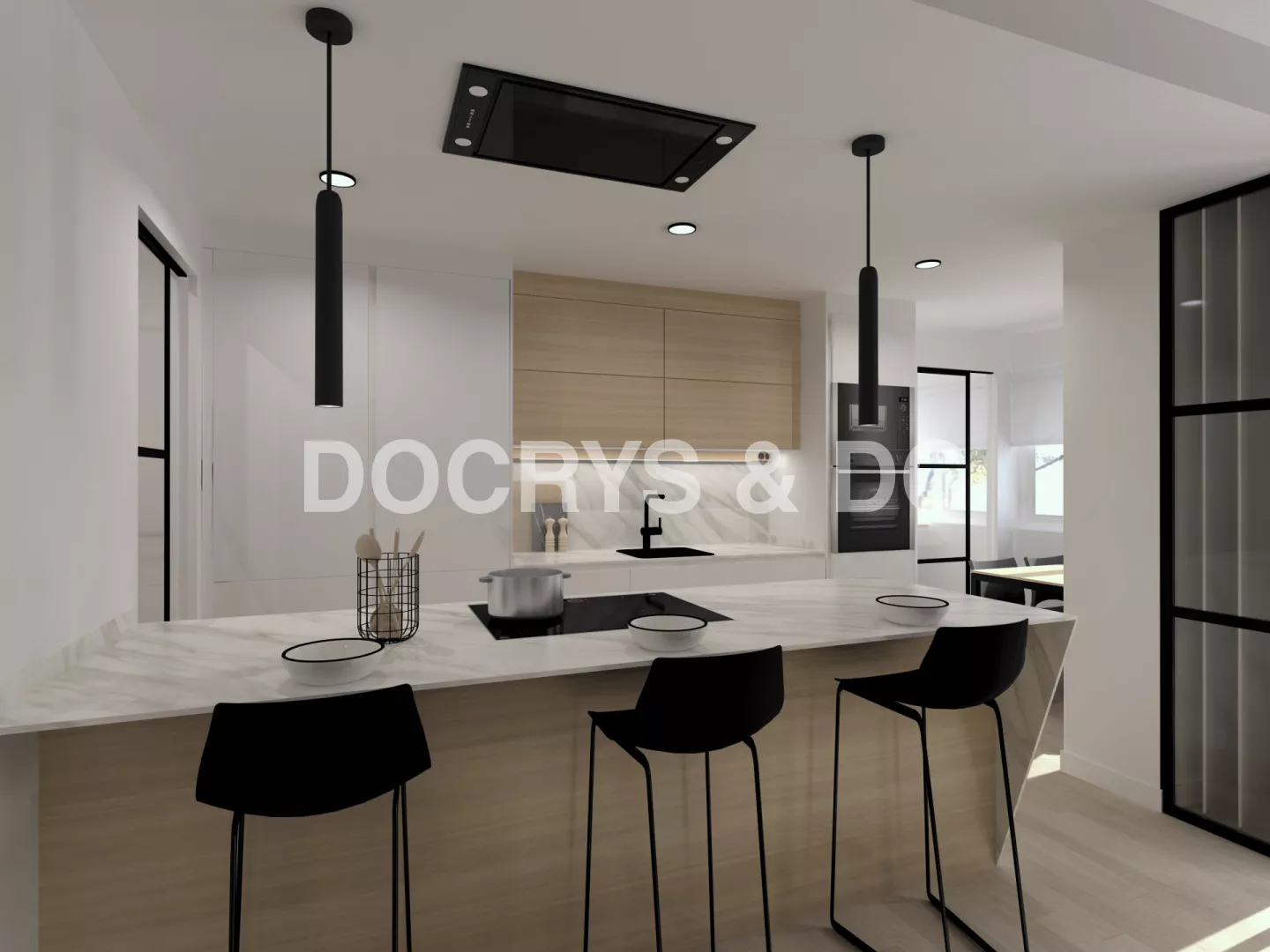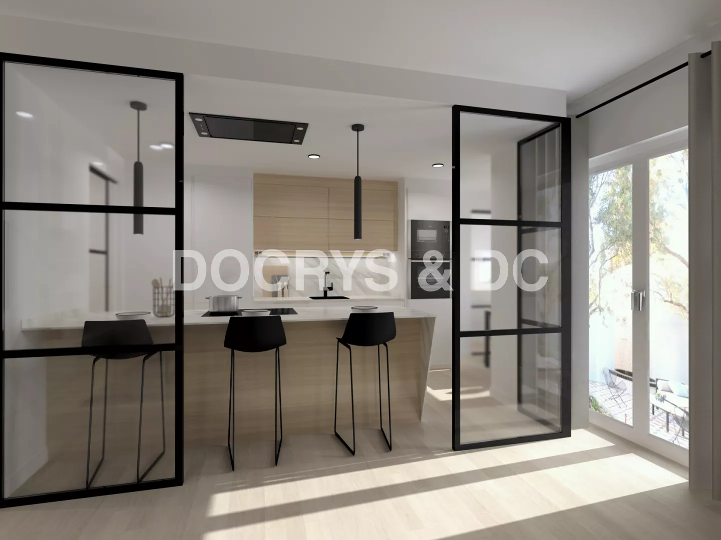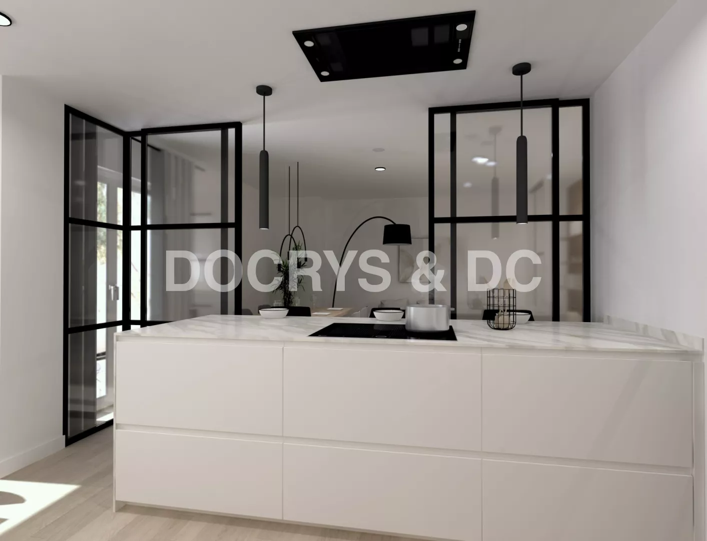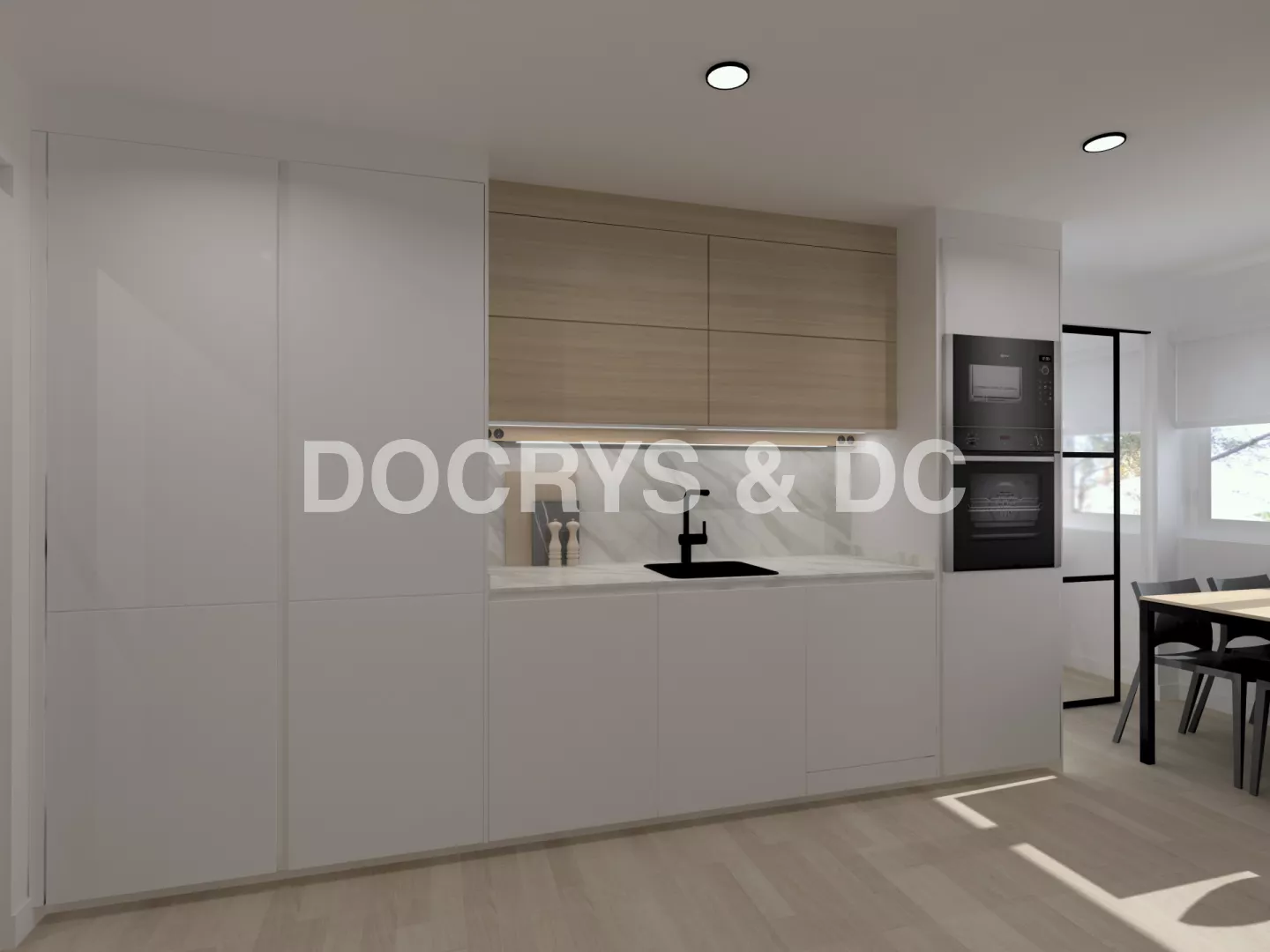 La cocina es semiabierta al salón, separada por unas puertas correderas de cristal, permitiendo que entre luz y manteniendo siempre el contacto visual entre ambas estancias.