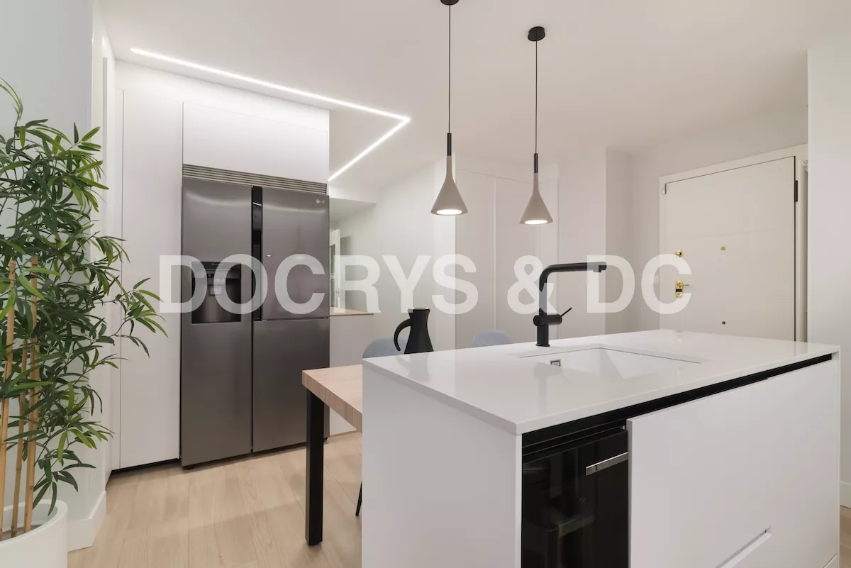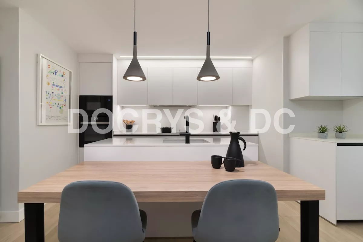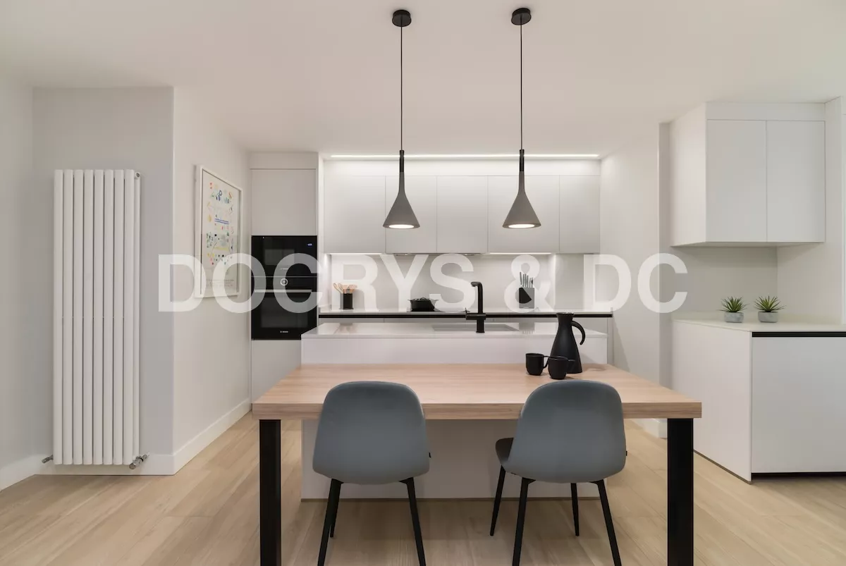 La isla central no solo sirve como punto focal estético, sino que también optimiza la funcionalidad de la cocina, encontrándose en ella la zona de agua. Justo al lado contrario, tenemos la zona de fuego y la campana integrada, aparte de la columna de microondas y horno.