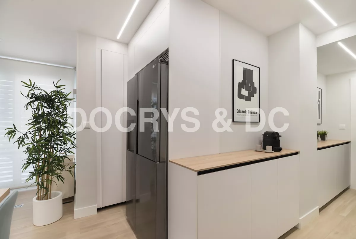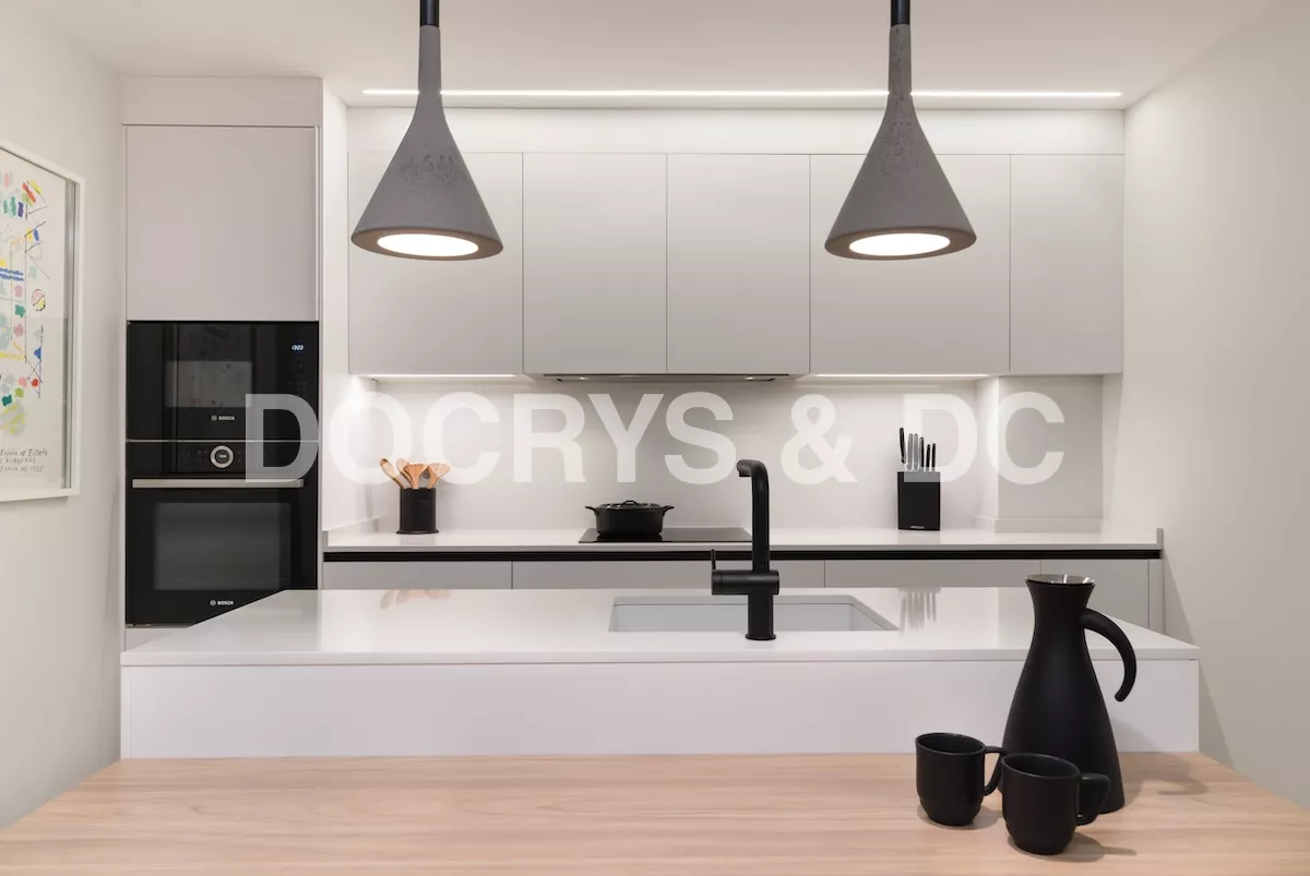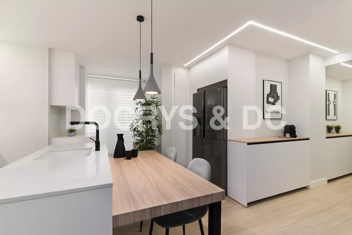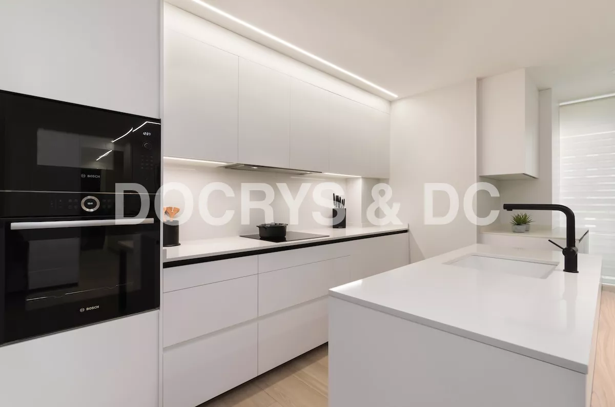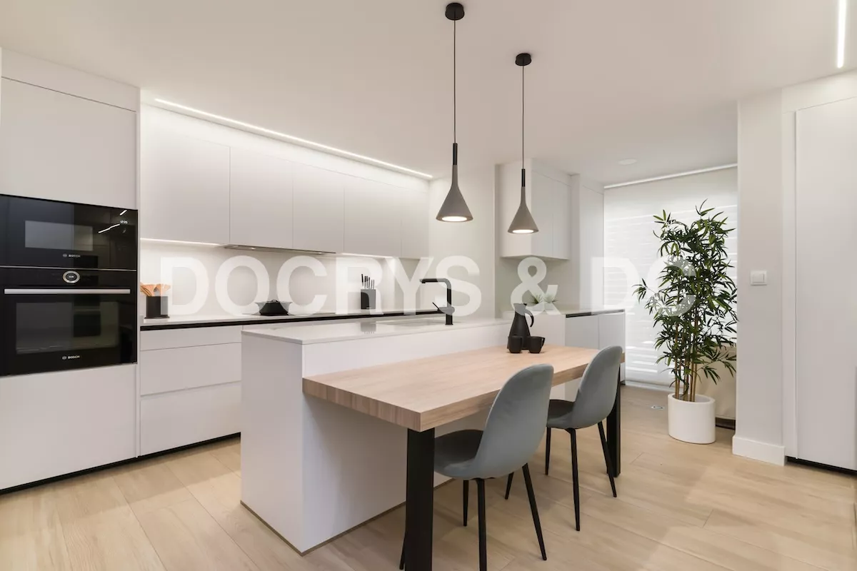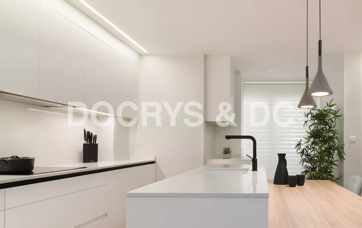 El diseño de esta cocina se basa en la luminosidad del color blanco. La elección del tono Blanco Innsbruk aporta una sensación de amplitud al espacio, creando una atmósfera acogedora. La encimera de Silestone Eternal Statuario con un acabado que imita al mármol natural creando un contraste sutil con el blanco de los muebles. Además, la durabilidad y la resistencia al desgaste del Silestone garantizan una superficie de trabajo de alta calidad, perfecta para el uso diario en una cocina activa.